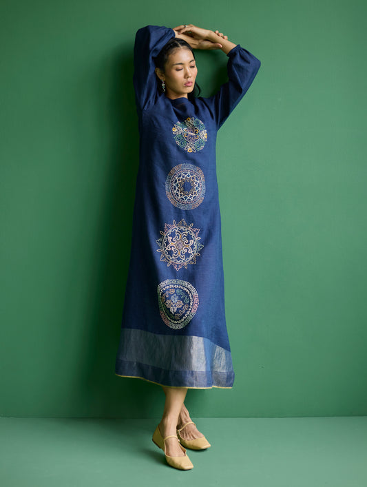 Ennya Hand-Embroidered Metallic Linen Kurta - Navy