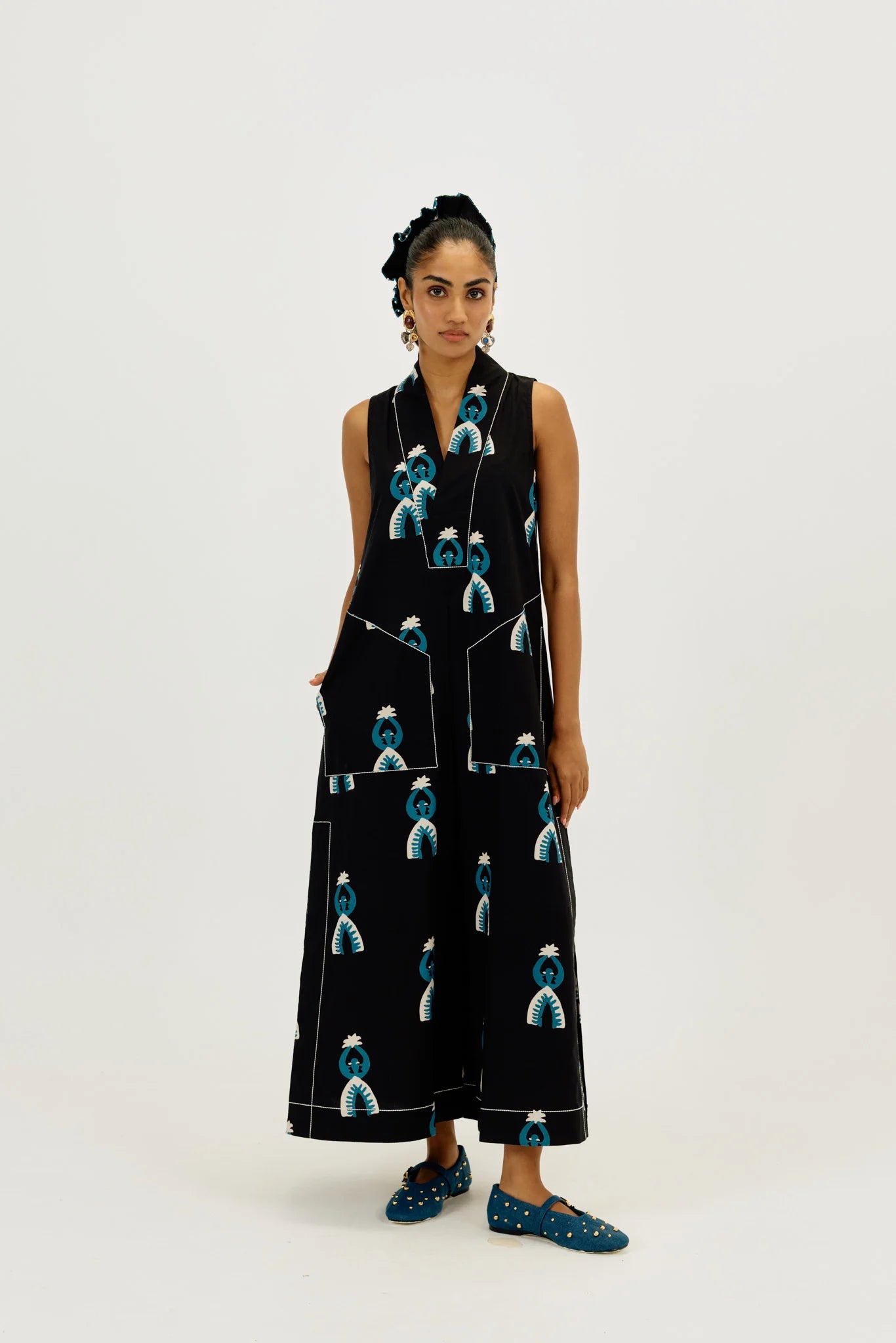 RSVP yes, thanks to this fabulous dress. This sleeveless midi dress is adorned with our bold tribal doll print. Designed with roomy patch pockets, a relaxed fit, and side slits on both sides for ease of movement and added flair. The clean V neckline and contrast topstitching make it feel polished yet unfussy. Wear it solo or layer it with a shirt for that effortless edge.