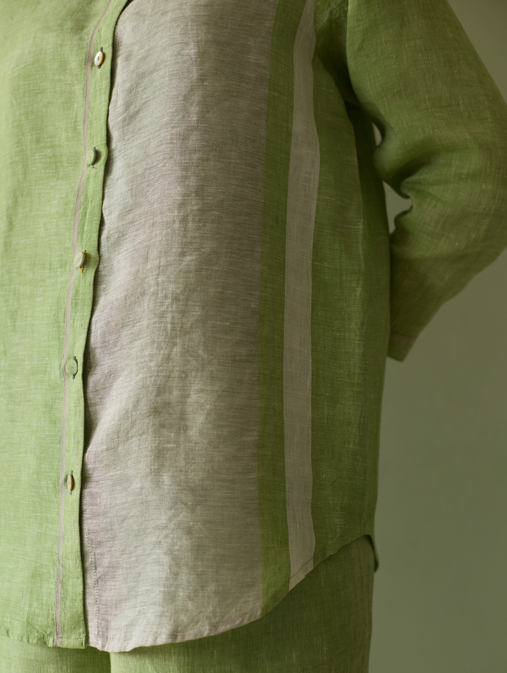 Top - This forever mandarin-collared shirt is crafted from our signature soft handwoven metallic border linen. A subtle grey handwoven selvedge adds a quiet unique detail to the silhouette. The button-down placket is thoughtfully finished with a blend of linen fabric and mother-of-pearl buttons, while the 3/4th sleeves are ideal for an informal or formal look.