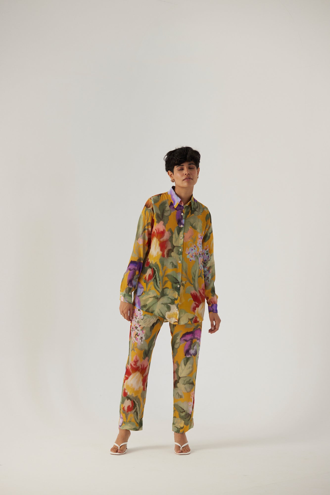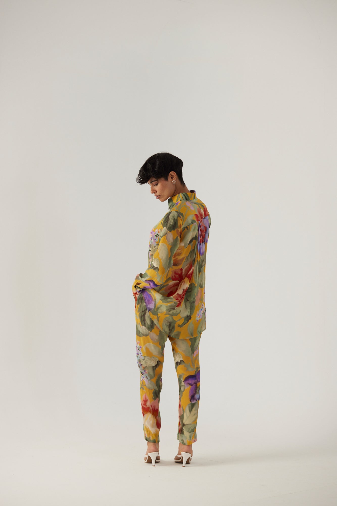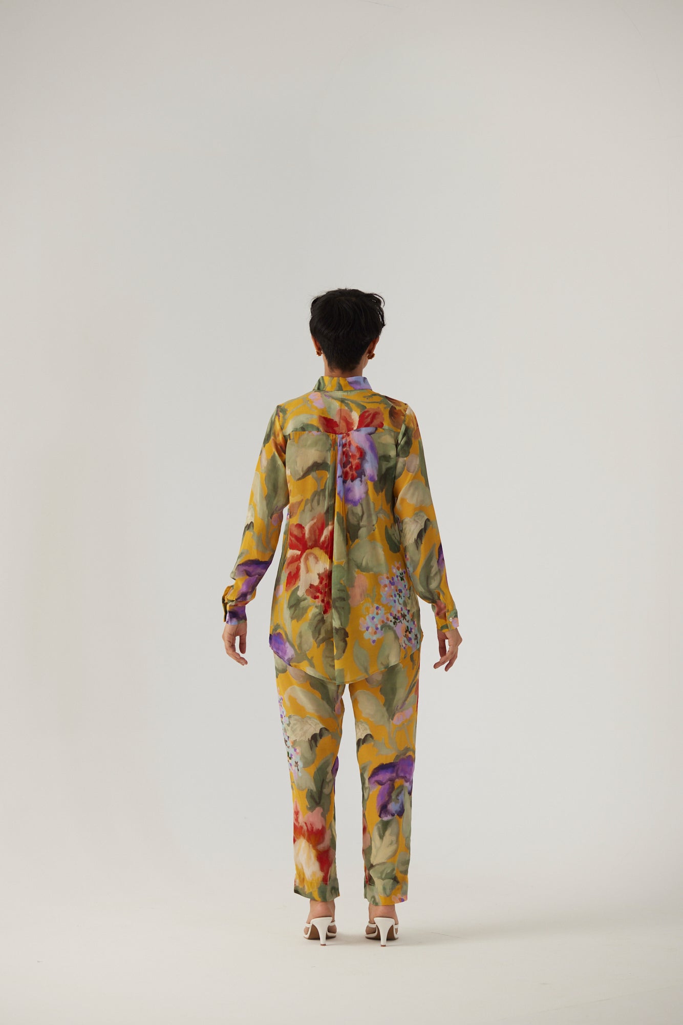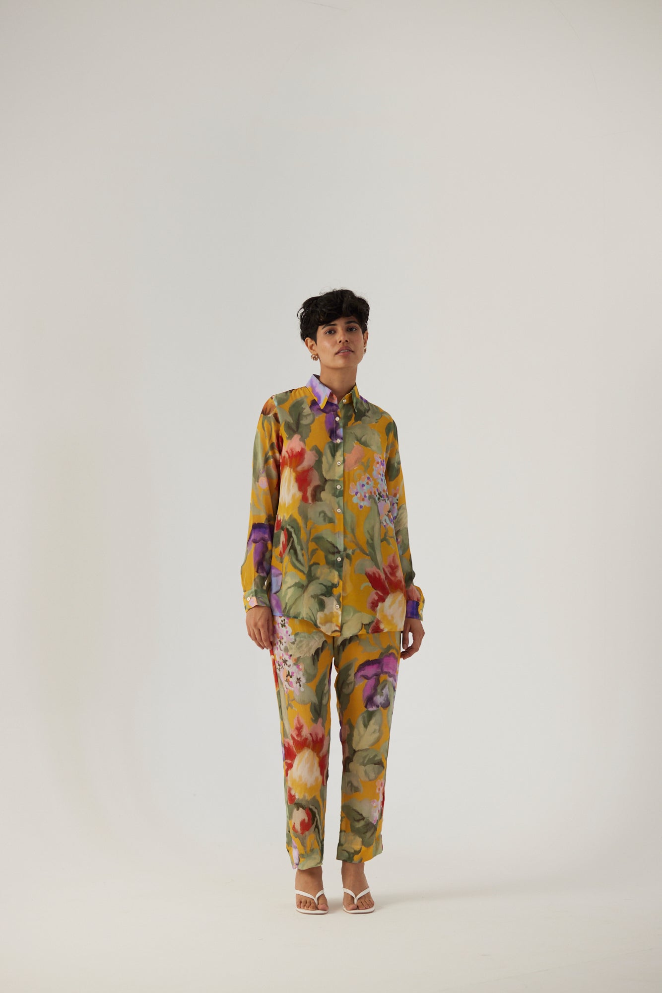 The print features hand drawn botanical motifs in a yellow base. This set is crafted in the Juliet print carefully printed on crepe featuring a set of shirt and pants.