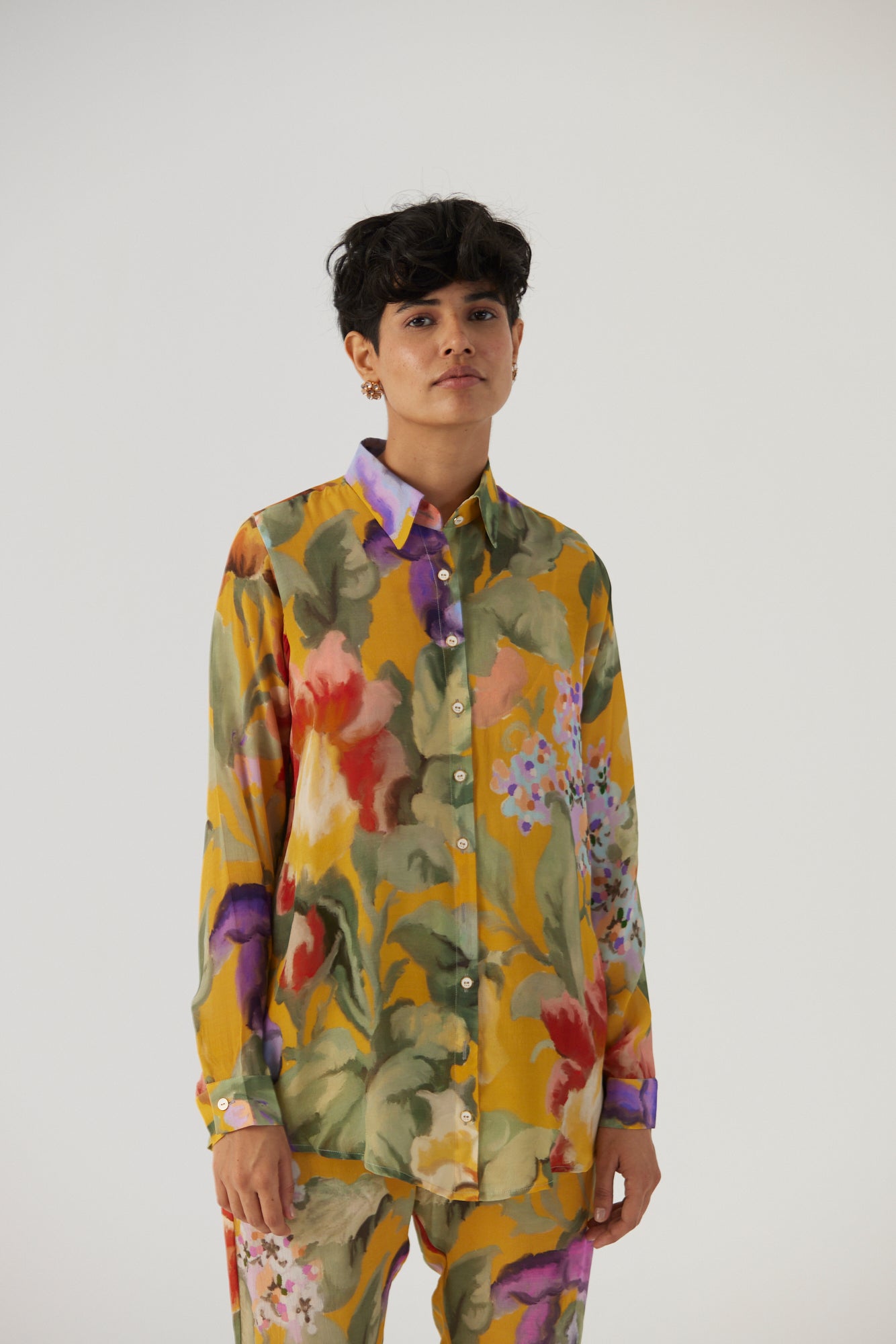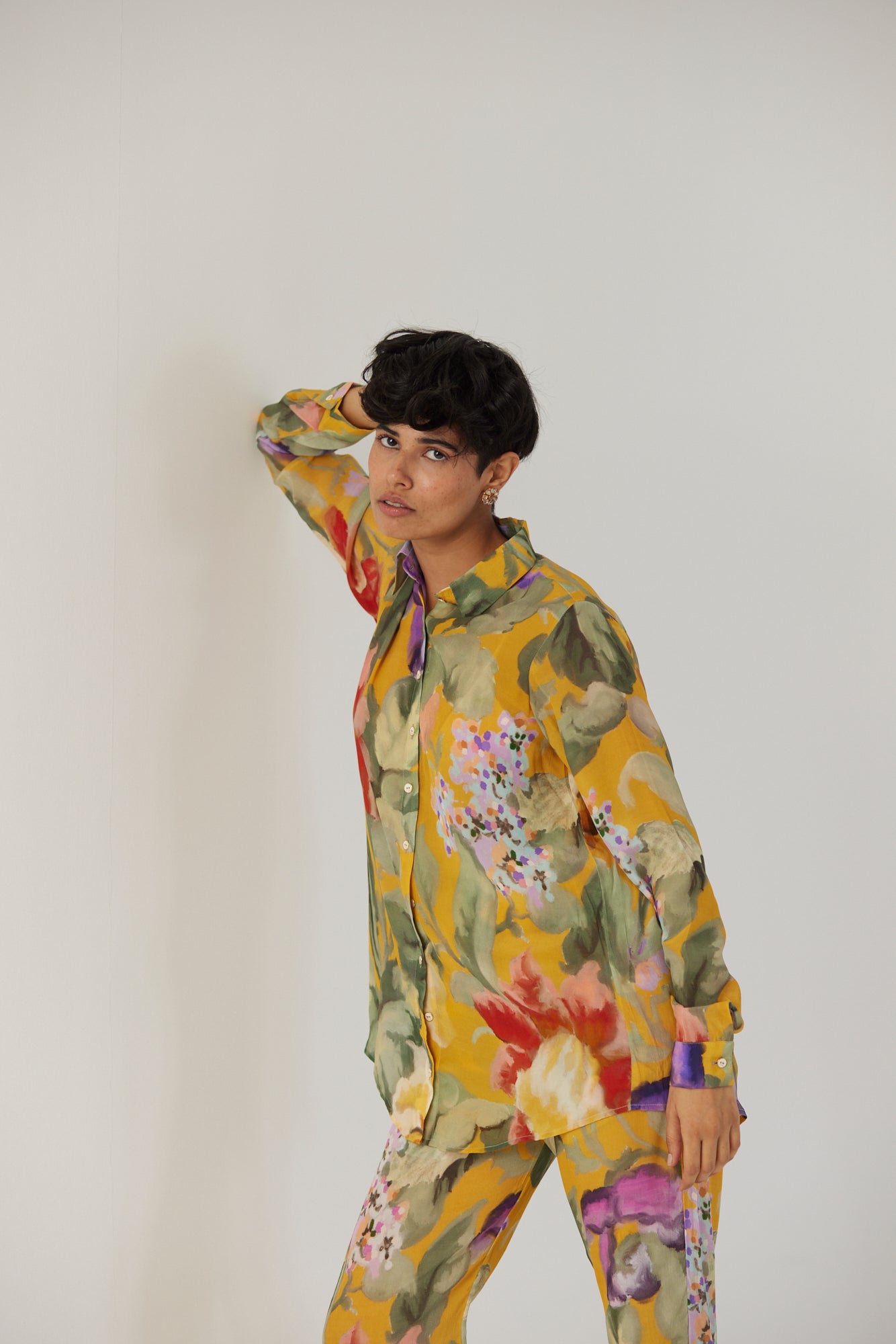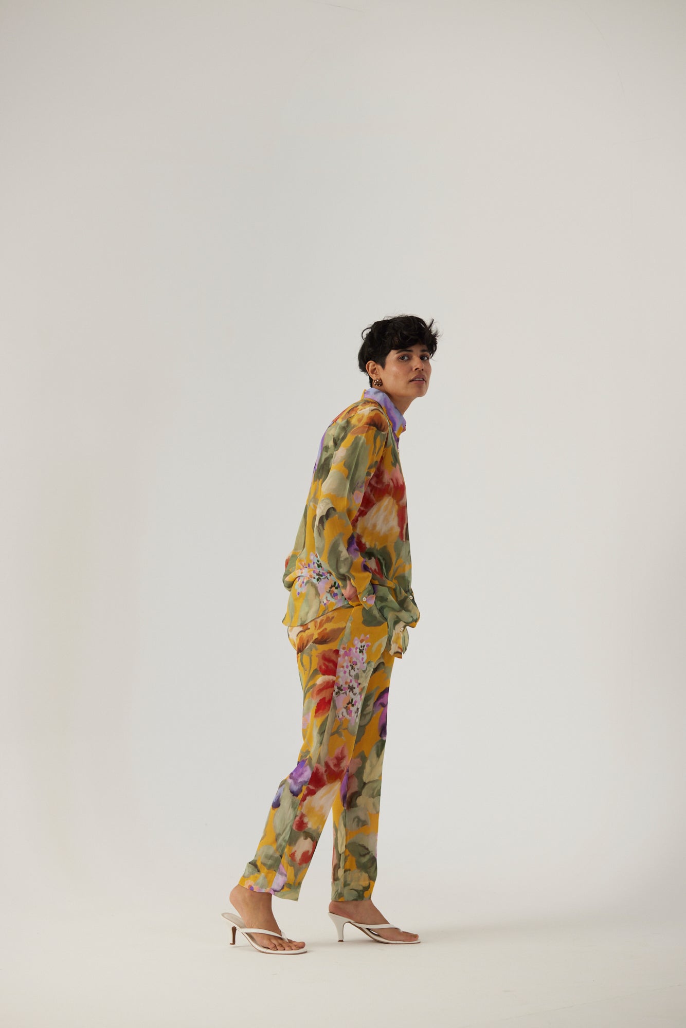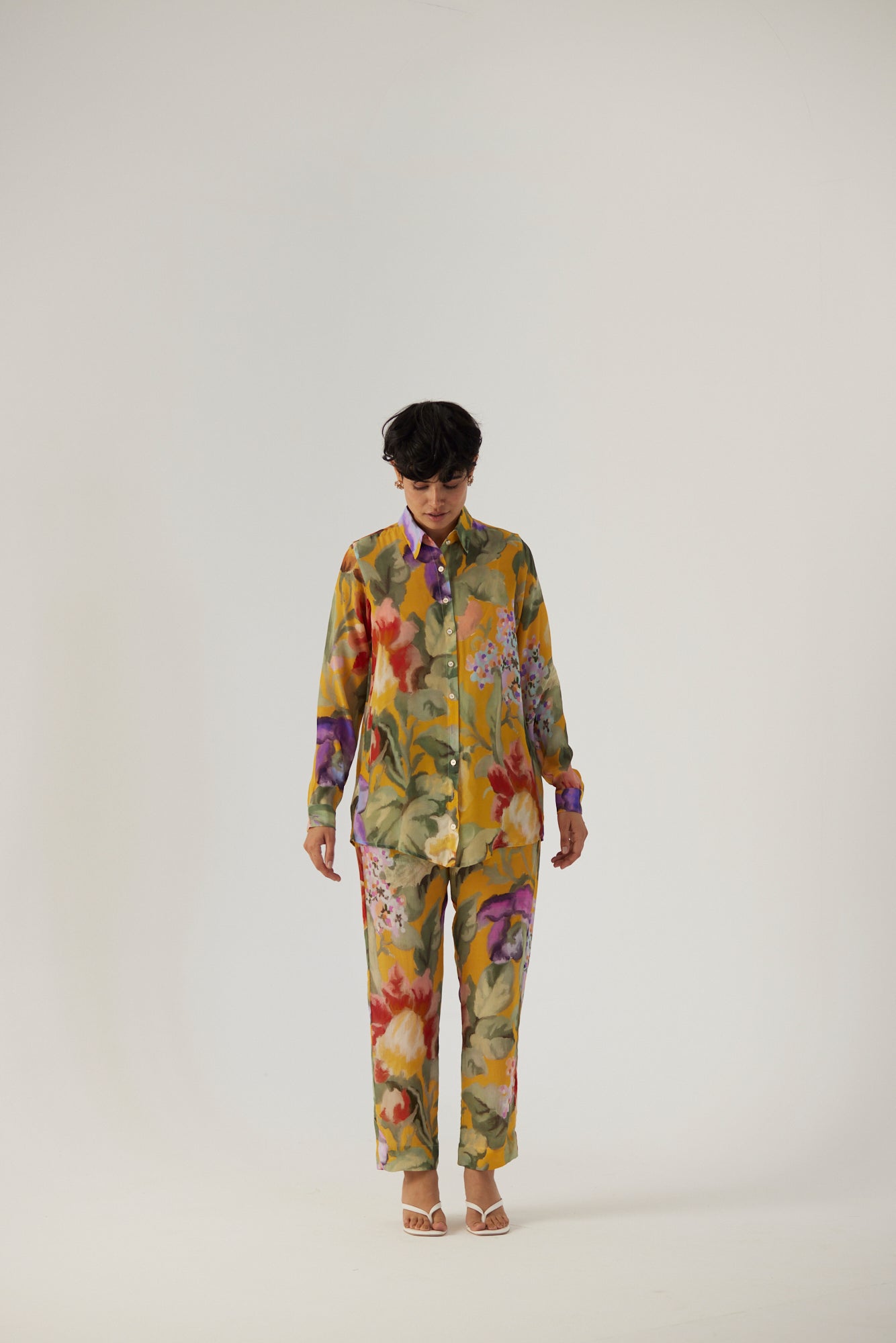 The print features hand drawn botanical motifs in a yellow base. This set is crafted in the Juliet print carefully printed on crepe featuring a set of shirt and pants.