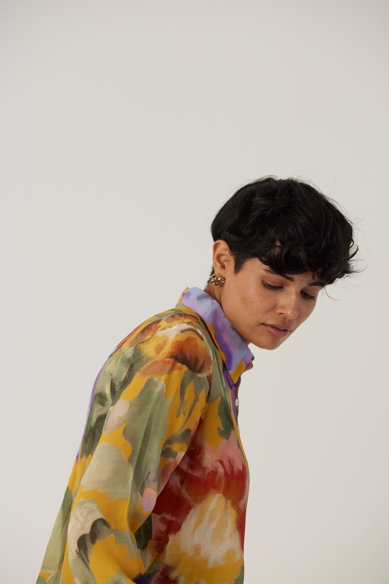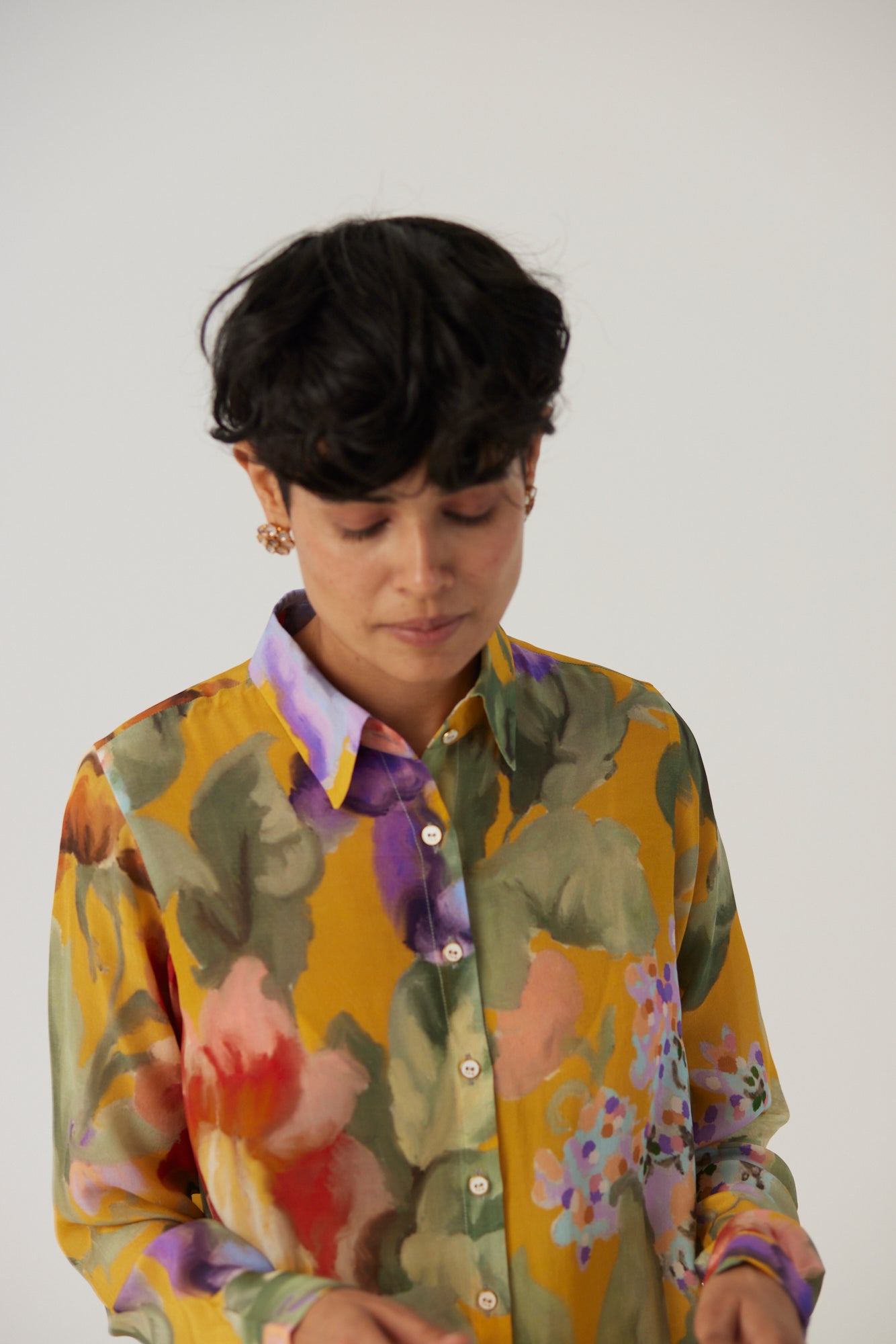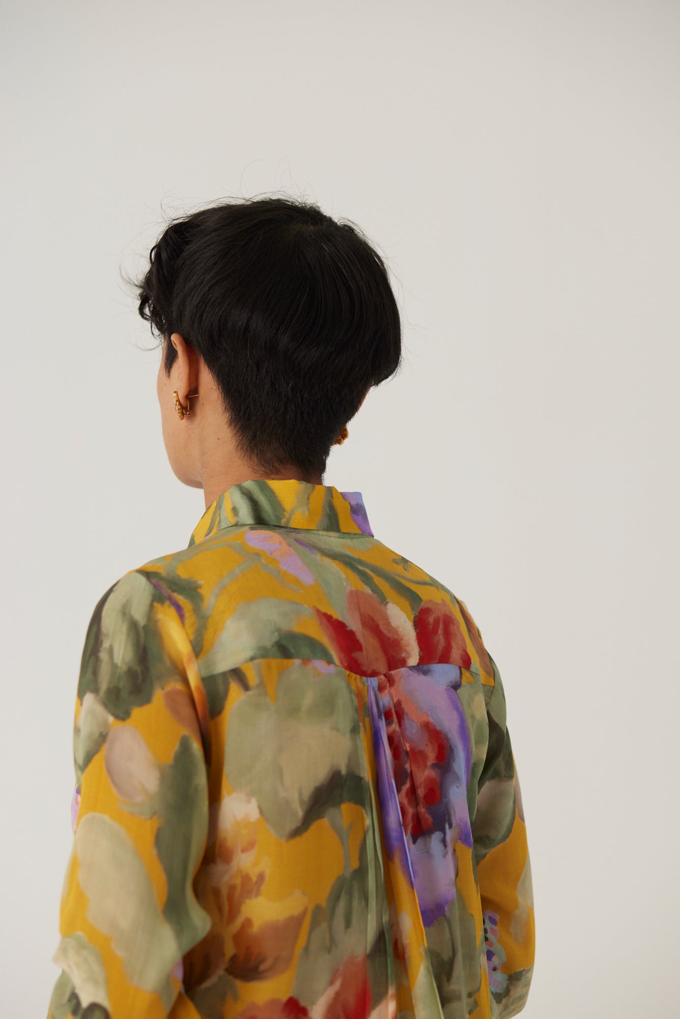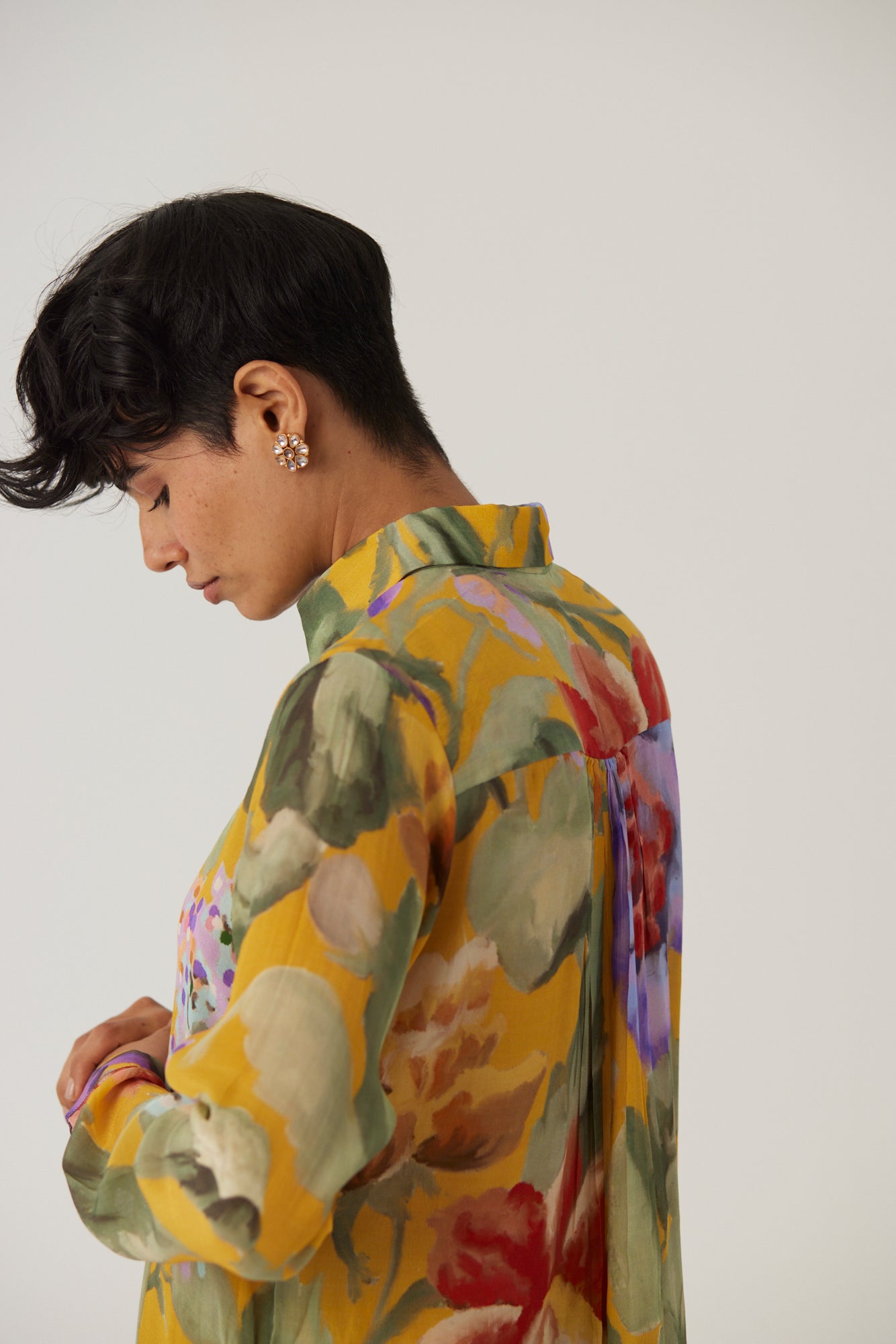The print features hand drawn botanical motifs in a yellow base. This set is crafted in the Juliet print carefully printed on crepe featuring a set of shirt and pants.