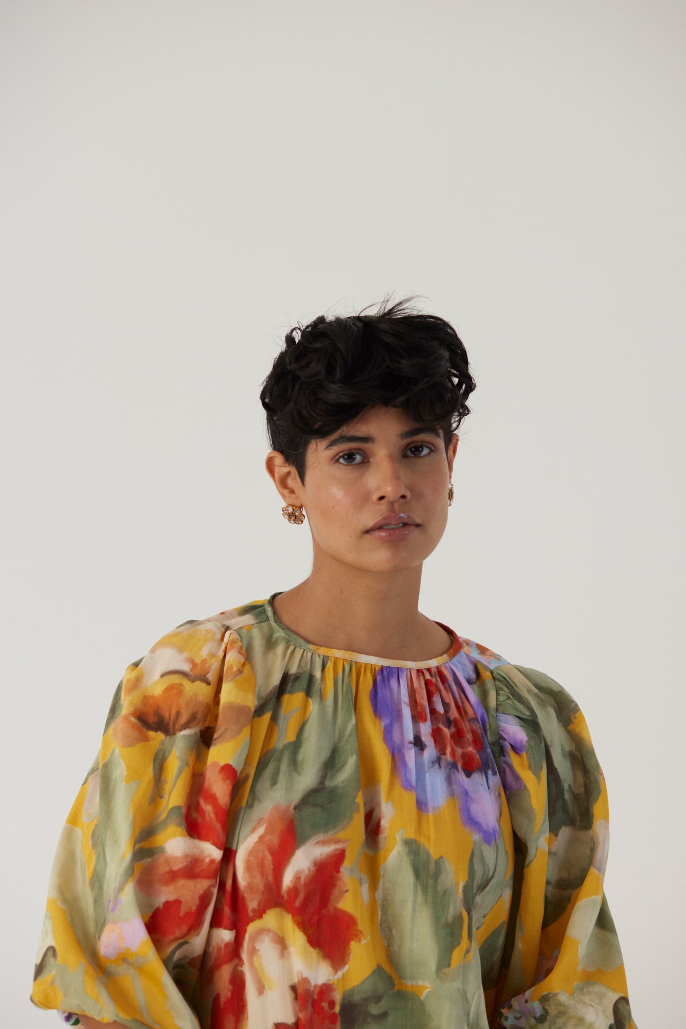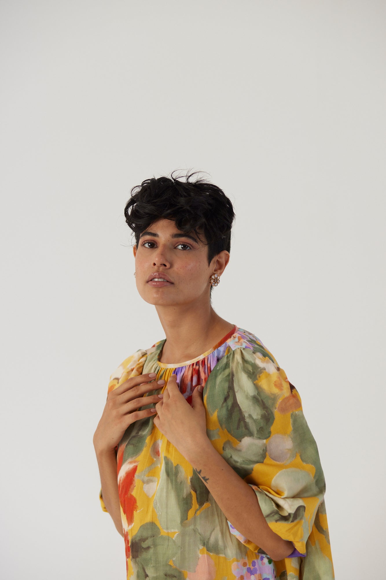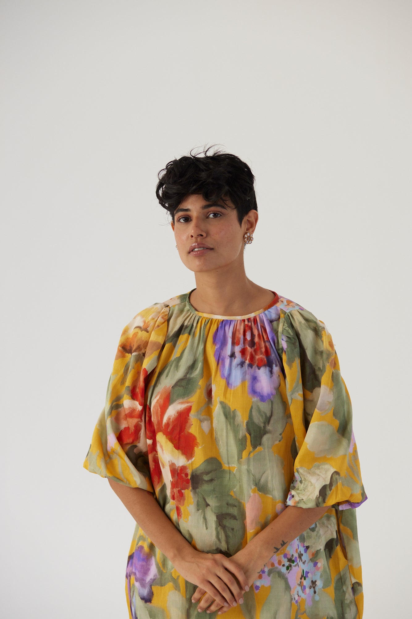 The print features massive hand-painted leaves of distinct shapes and designs on a yellow base. This dress is crafted in the Alora yellow print carefully printed on Cotton Satin. It is a midi length dress with puff sleeves.