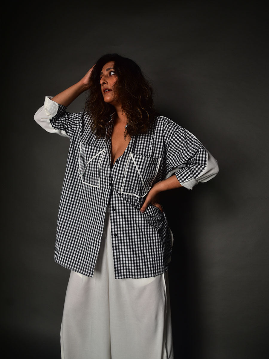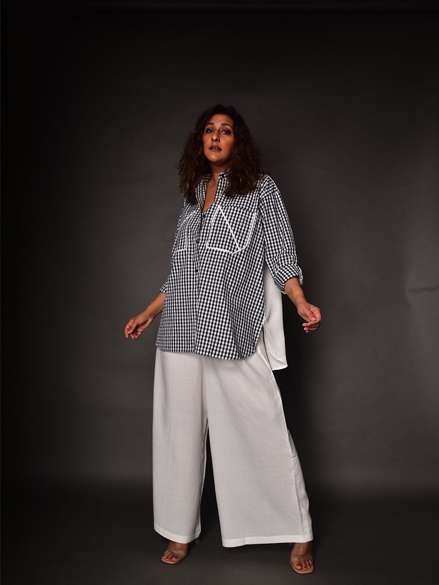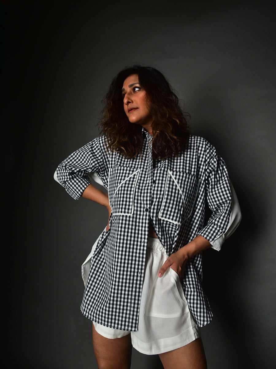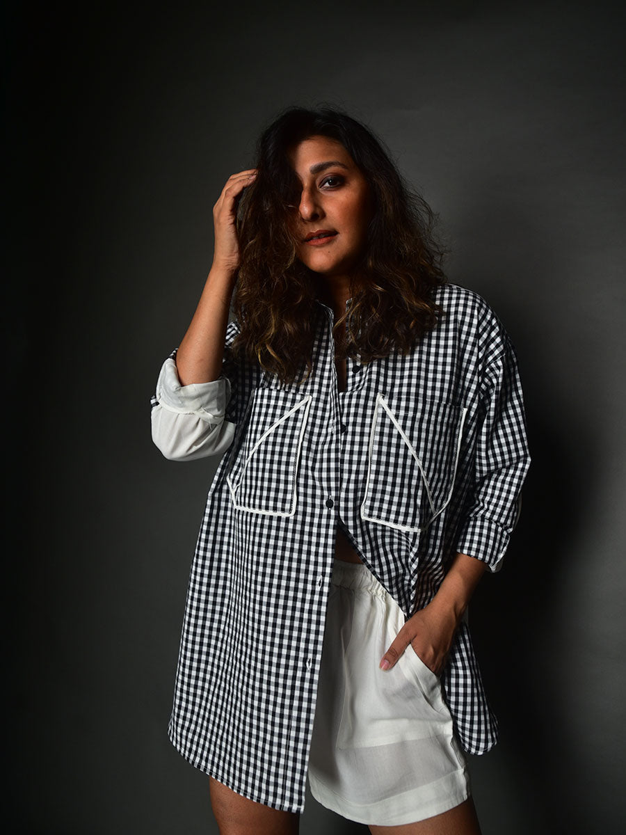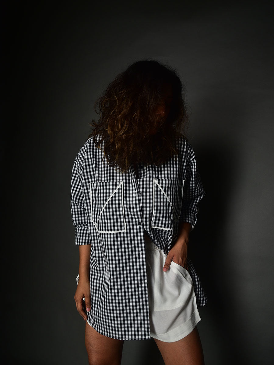 Chic and elegant with some fun while you are at it! Our oversized shirt is cut in a mix of cream rayon cotton and contrast checkered print. Pair with our Lana Pants for the full lounge look, or layer over our Coco Bralette.