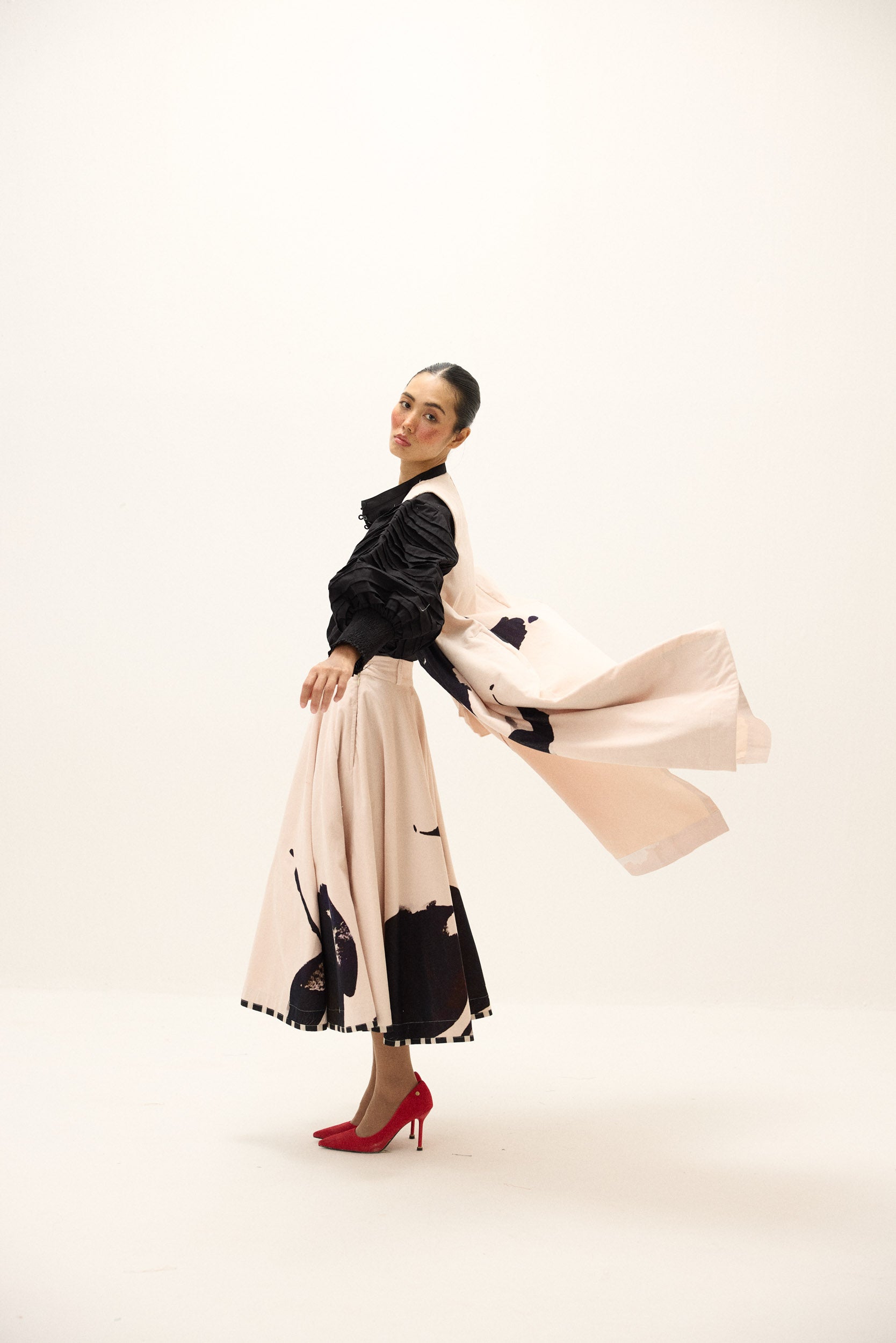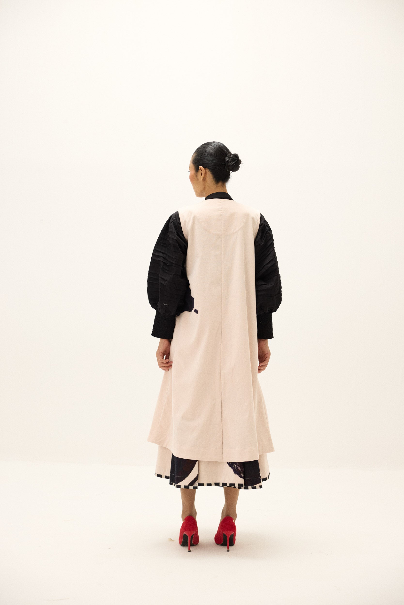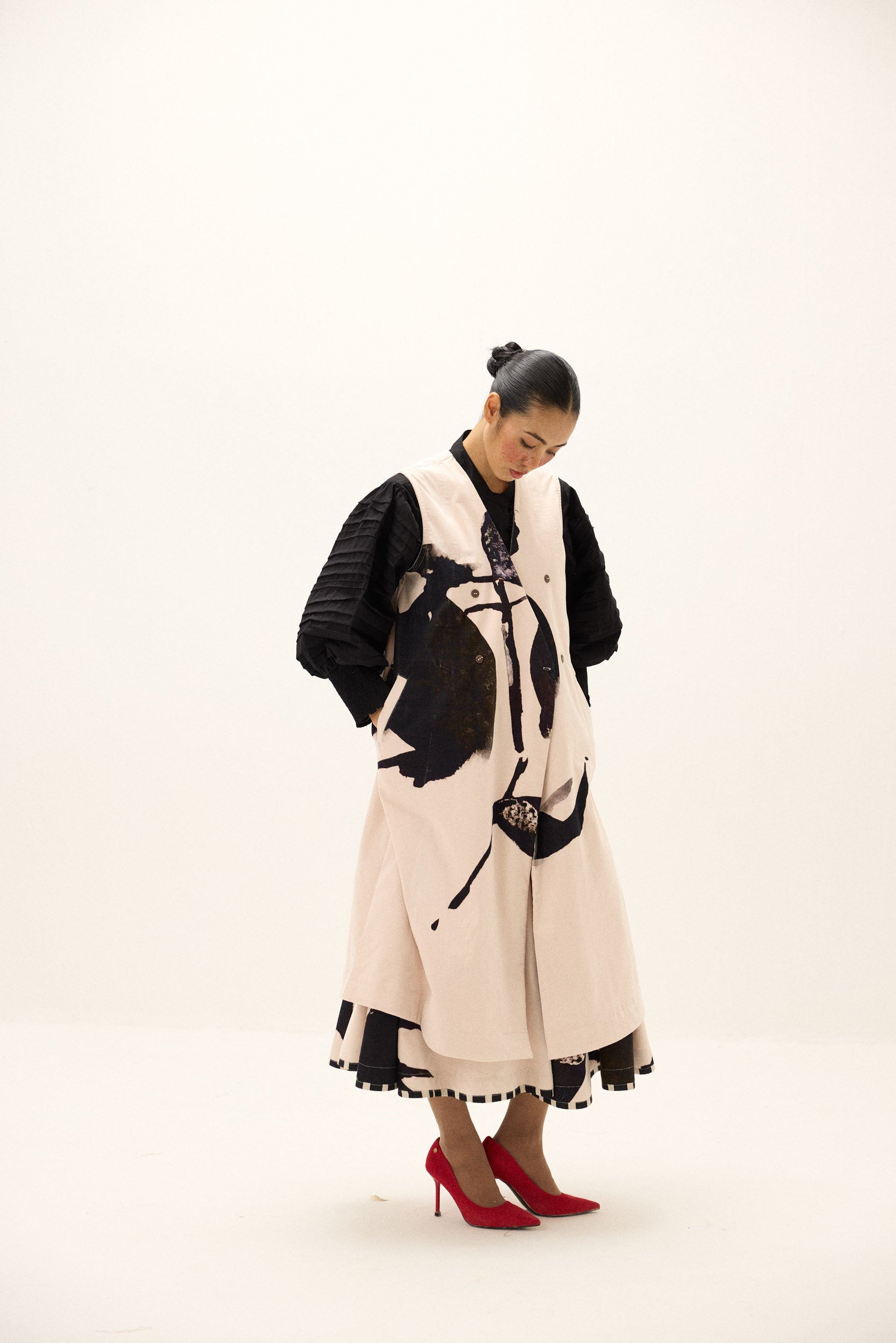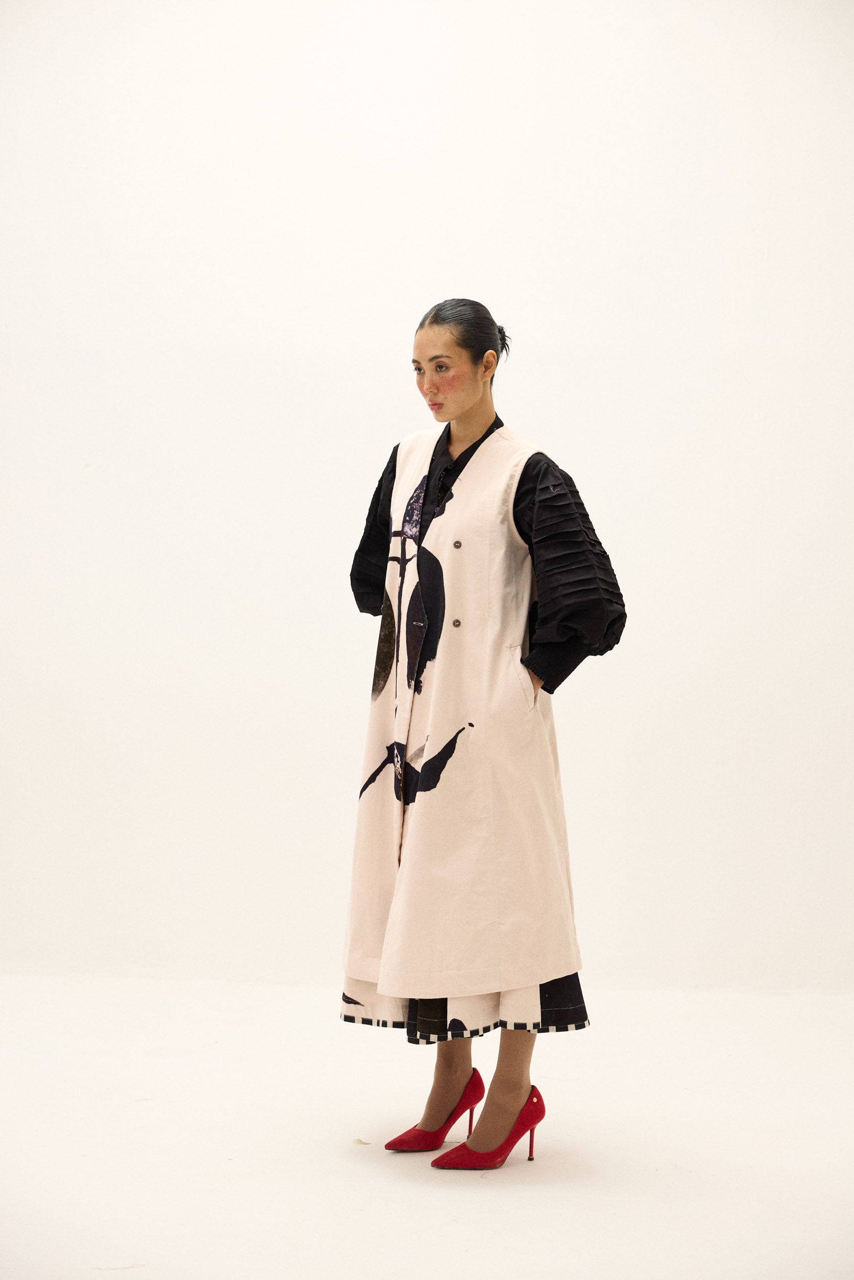 The Alum Stone Overlay is crafted in soft cotton corduroy, featuring abstract hand-painted motifs that lend it an artistic, sculptural quality. Designed with a longline silhouette and minimal structure, it drapes fluidly over any ensemble - adding dimension and depth to layered looks. A statement piece that effortlessly bridges comfort and contemporary design.