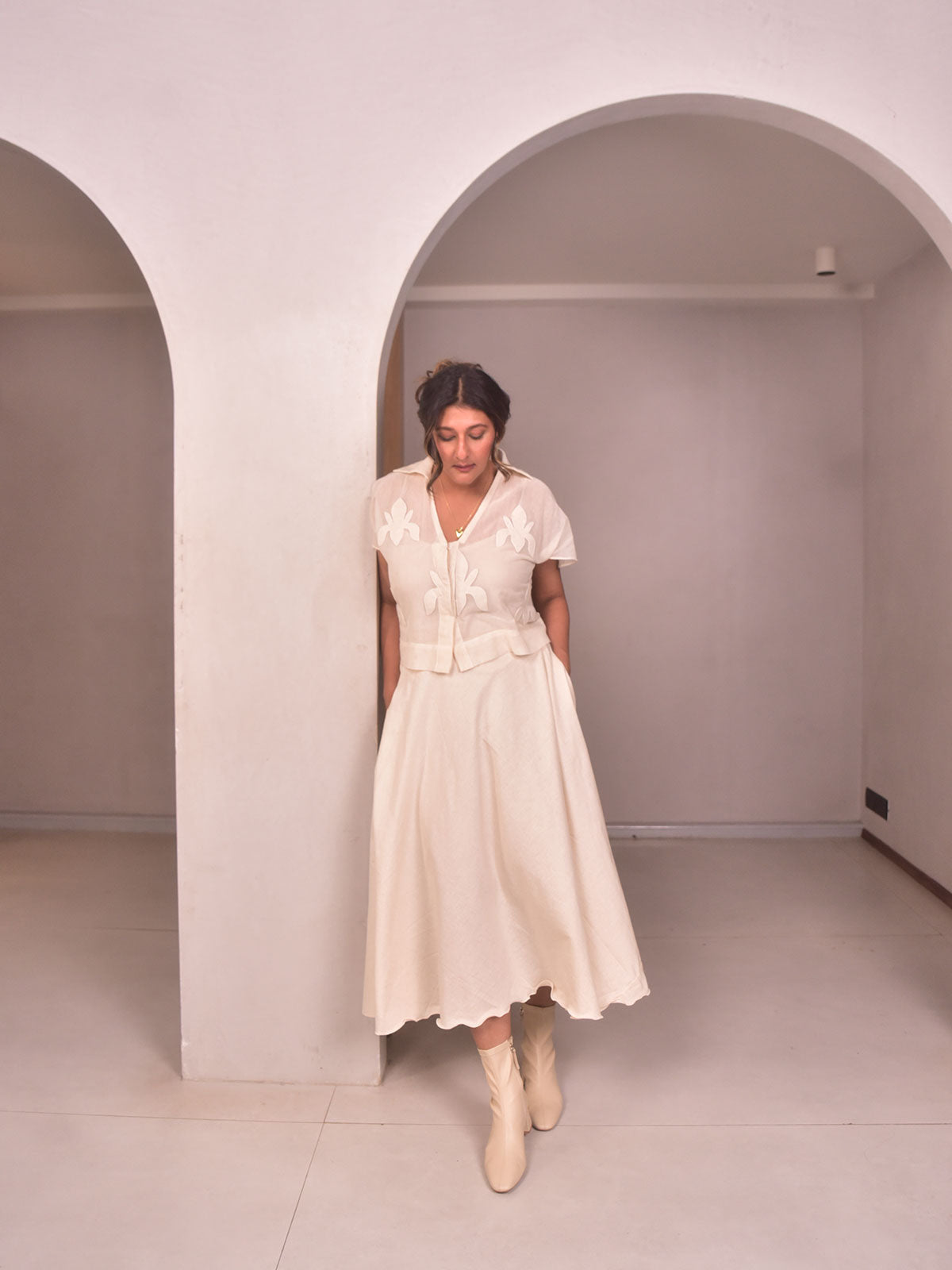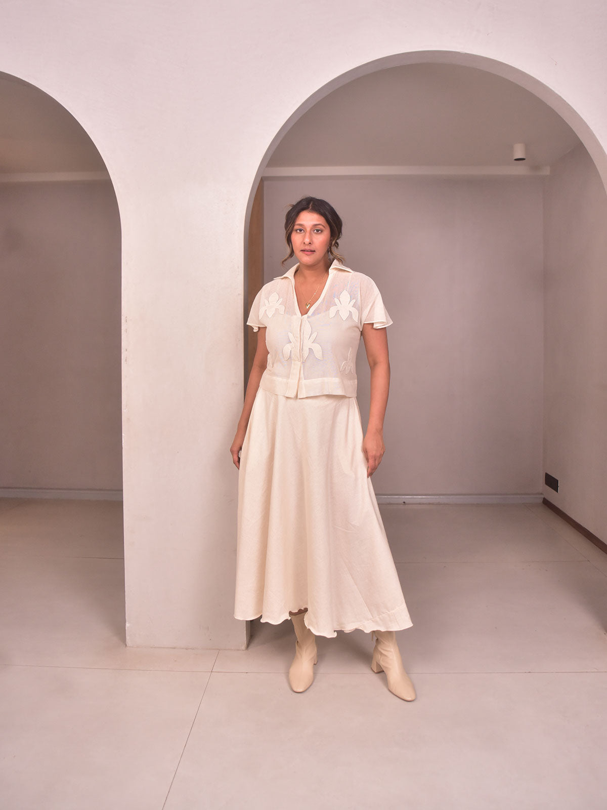 The cropped ecru cotton-net shirt has delicate embroidered appliqués and back tie-ups for an adjustable cinched waist, paired with a beige cotton-linen umbrella skirt and slip. This airy set is ideal for beach vacations, daytime tours, or holiday brunches. Style it with dainty jewelry and espadrilles for a breezy, feminine look.