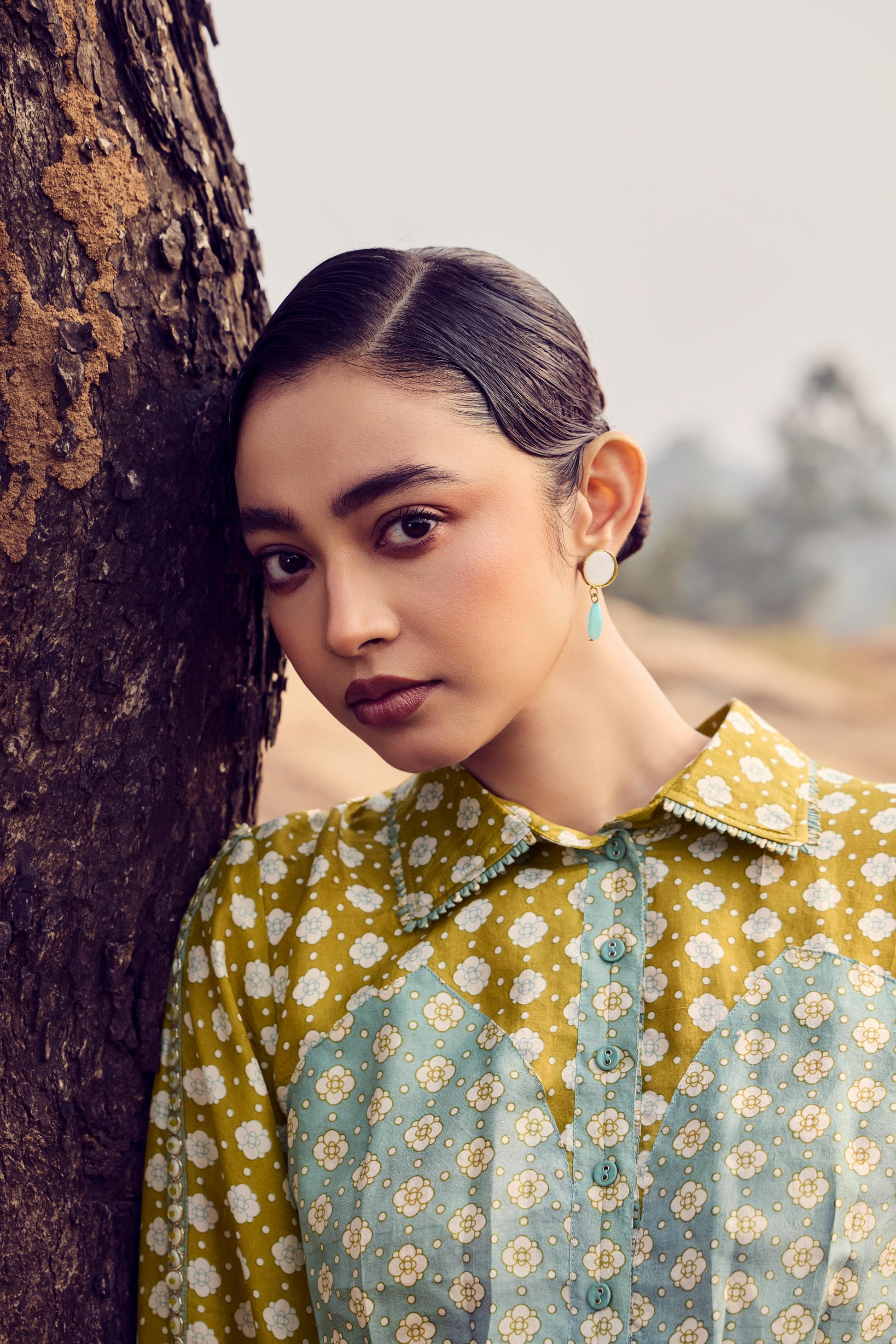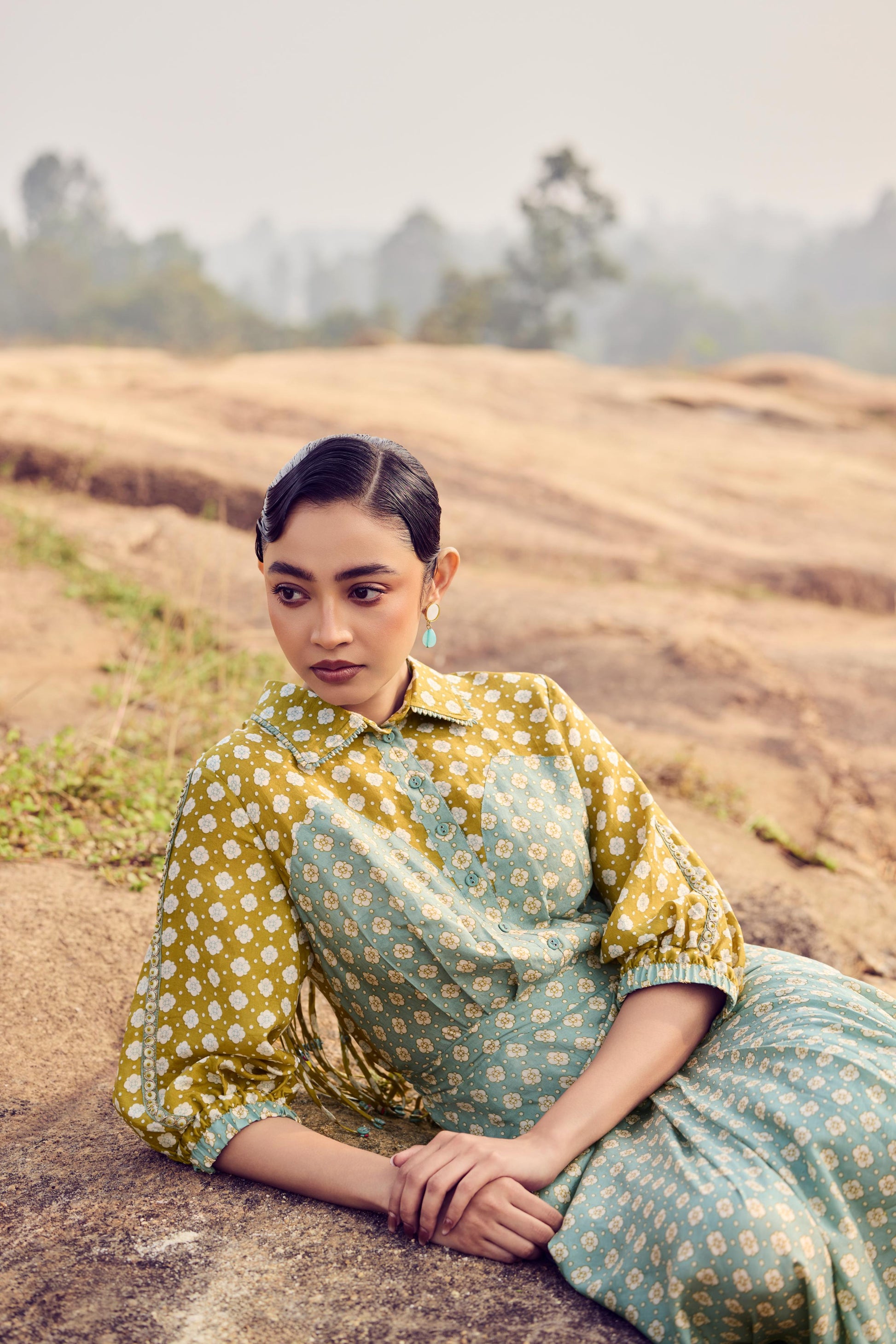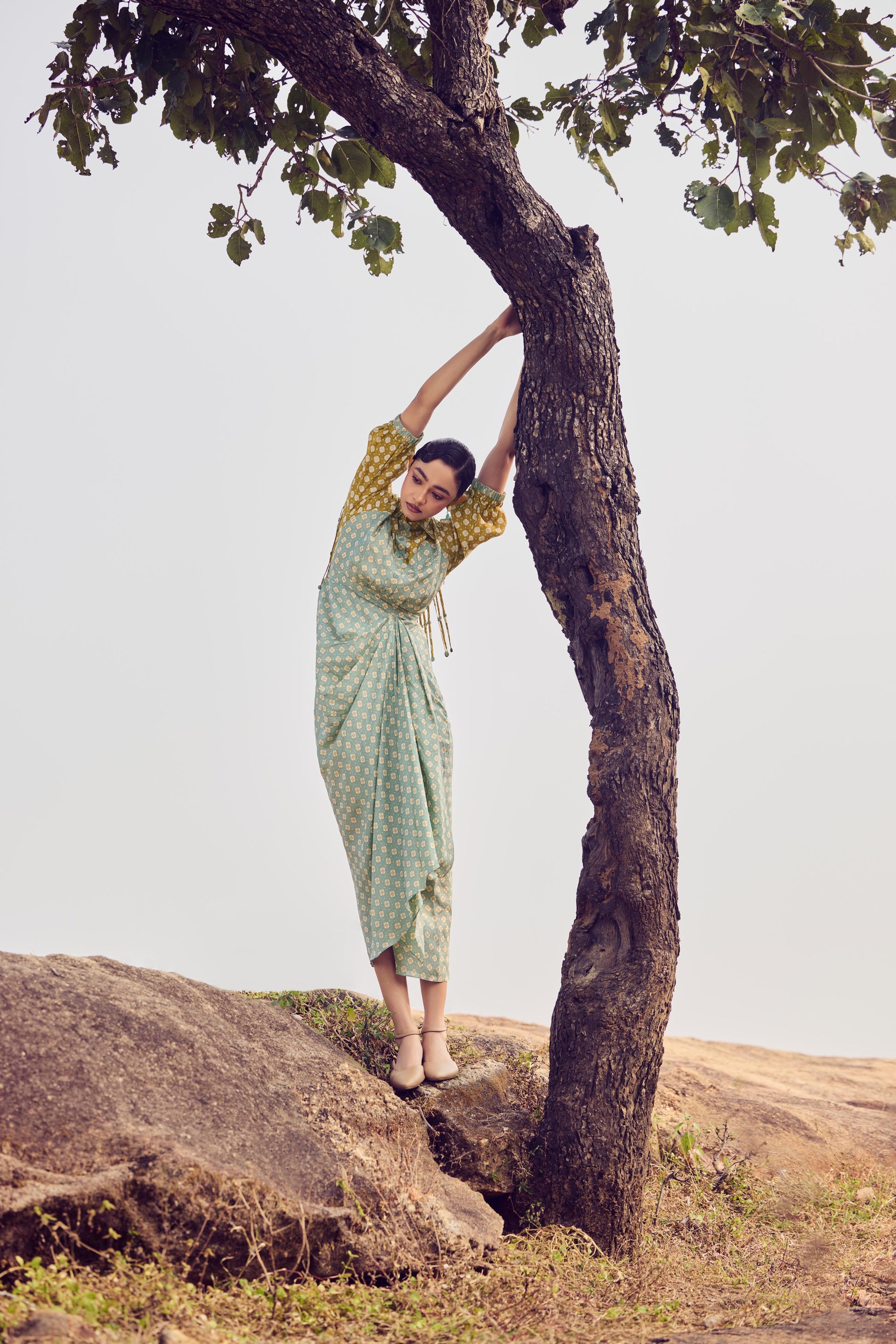 Hand woven, hand printed mulberry silk , olive green & pista green draped dress, with embroidery detail on sleeve & back, and fringe detail on back yoke.