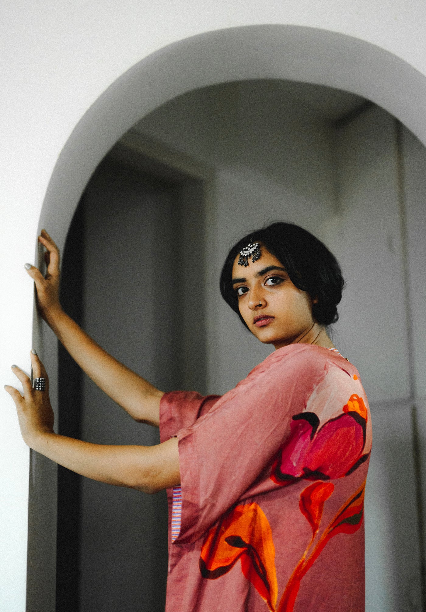 The anemone satin kaftan set features massive florals on pink base. The set is paired with pants in the same color (solid) in silk .