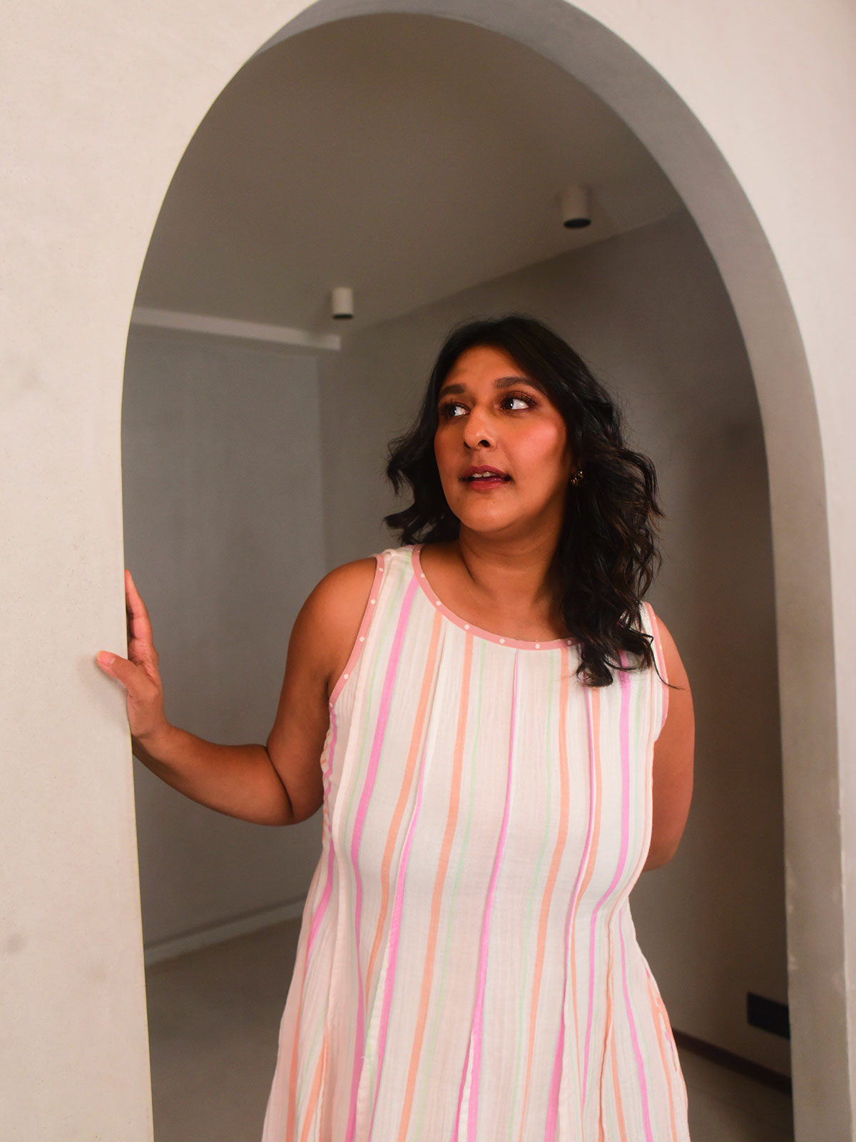Our sleeveless short dress with a boat neckline and paneled structure, cut in our signature striped cotton gauze. The flared silhouette adds a playful movement, perfect for sunny day outings or casual lunches. Style it with flats and a tote for a laid-back vibe. Lightweight and breathable, it flatters all body types with ease.