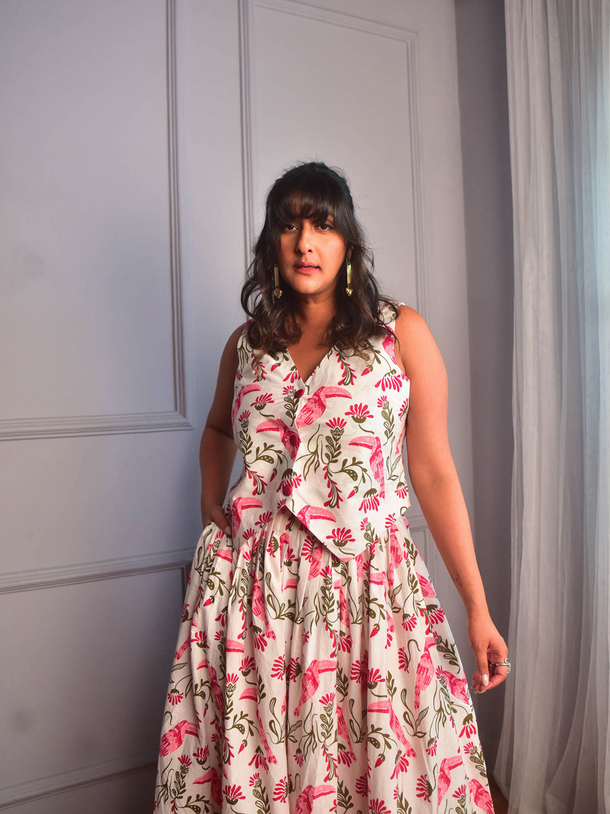 Crowd-pleasing vest back in a whimsical print for the festivities. Cut in our exclusive green and pink floral bird hand-screen-printed cotton, this sleeveless Vest with matching buttons down the center., comes with a matching pleated skirt to complete your festive look.