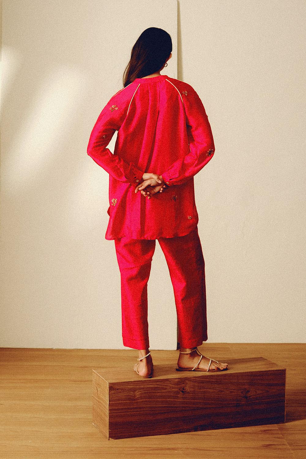 Handwoven mulberry silk ,classic raglan sleeve shirt with hand embroidered beaded motifs and contrast cord piping.