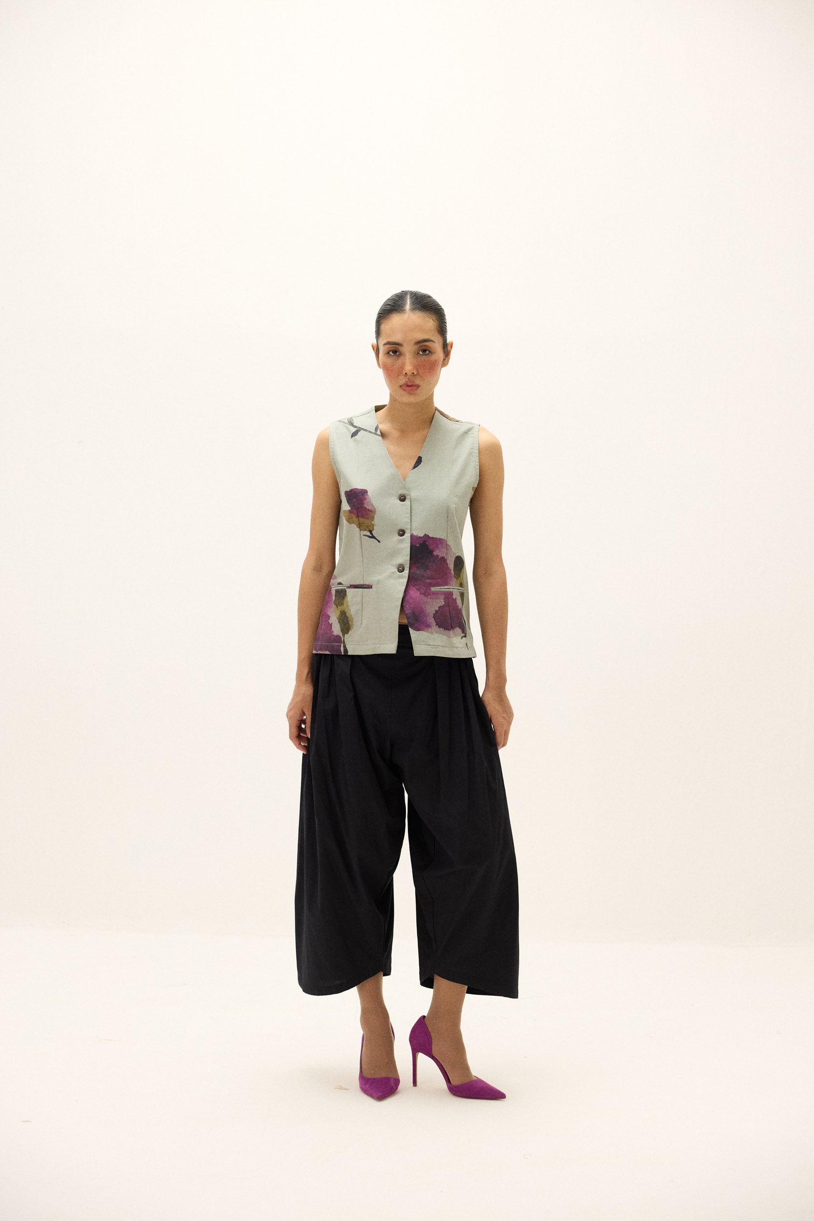 The Aurora Waistcoat is tailored in soft cotton Oxford, detailed with hand-painted floral motifs that add a subtle artistic touch to its structured form. Designed with a flattering V-neckline, button-down front, and welt pockets, it brings modern polish to any look - perfect for layering over shirts or wearing solo for a sharp yet feminine finish.