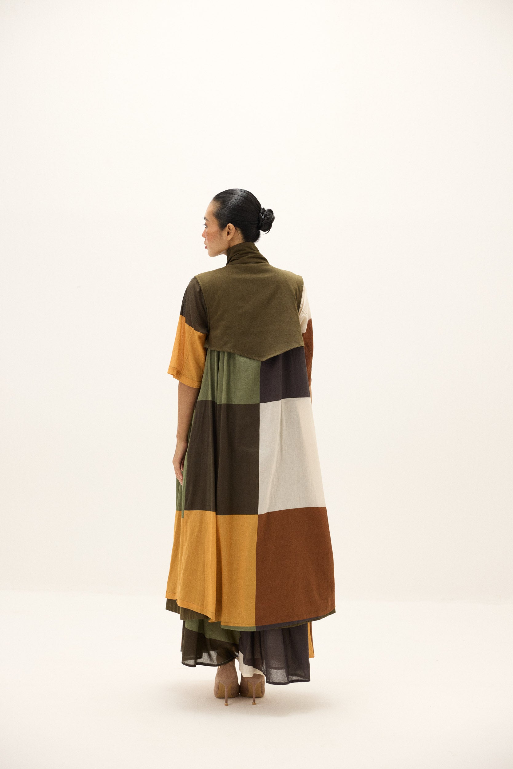 A longline trench coat in a blend of mul and twill, printed in bold earthy segments for a colour-block inspired look. The fluid mul panels balance the structure of twill, creating ease and movement. Finished with a wide lapel collar, relaxed fit, and practical side pockets, it layers effortlessly over dresses or separates.