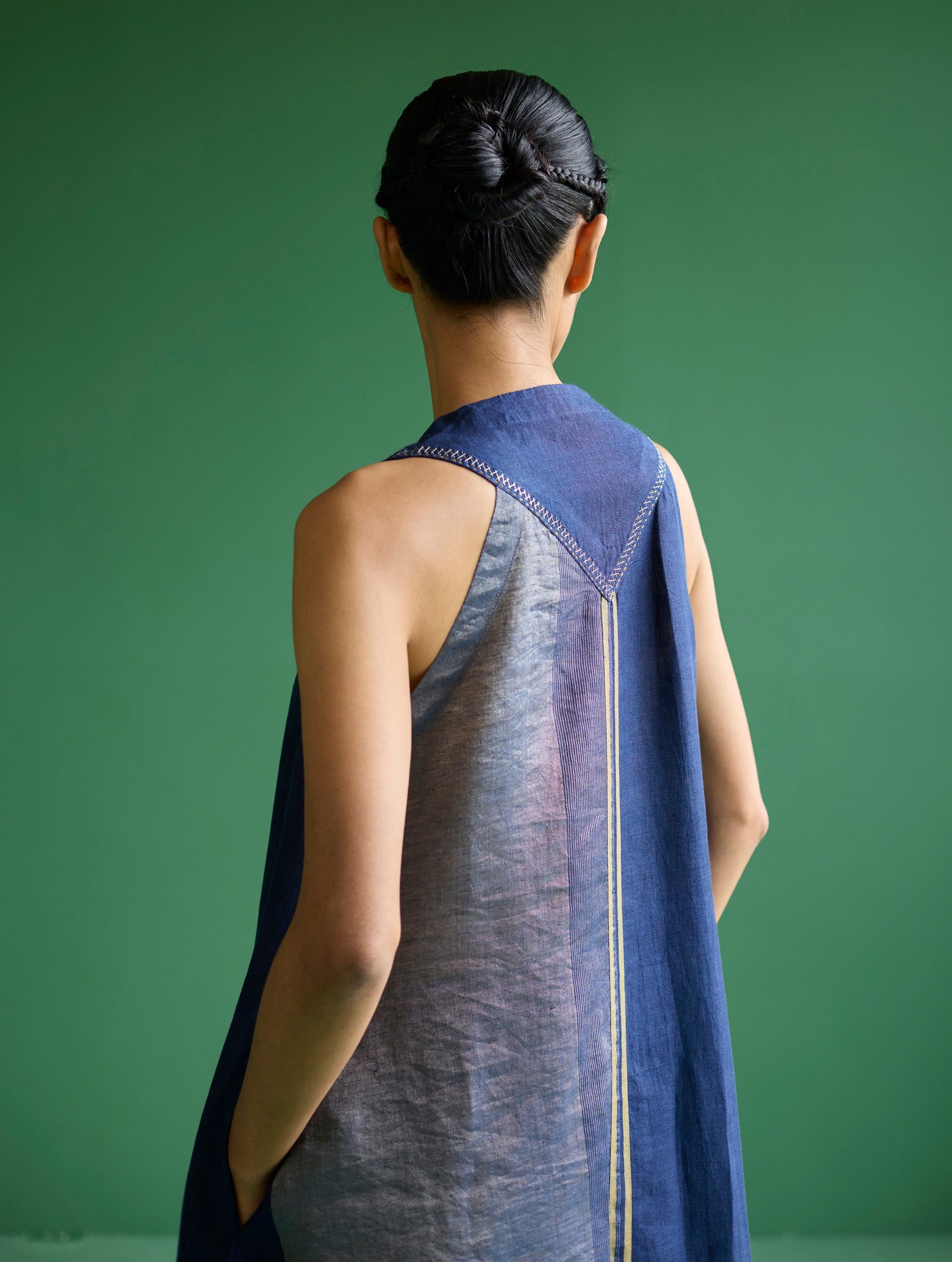 The founder's favourite v-neck sleeveless tunic top with a soft handwoven vertical metallic border with stripes at the front and back with a woven ochre colored selvedge. The top has a high center slit and is detailed with intricate hand-embroidery at the back yoke.