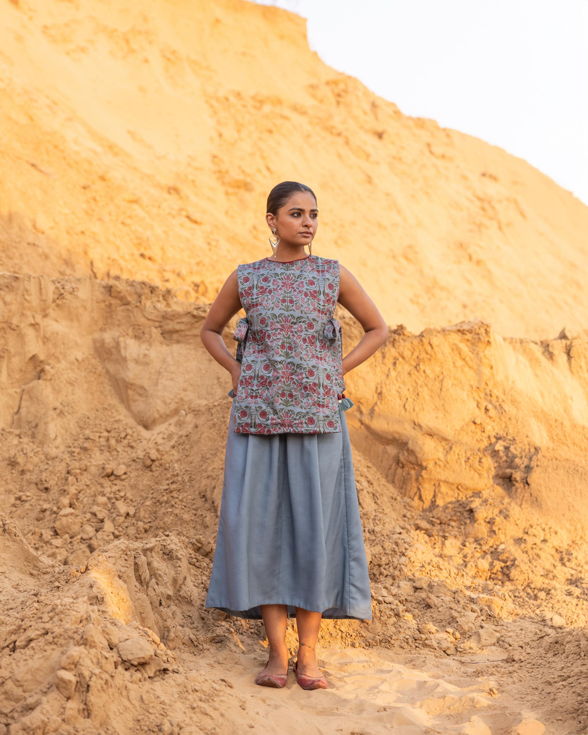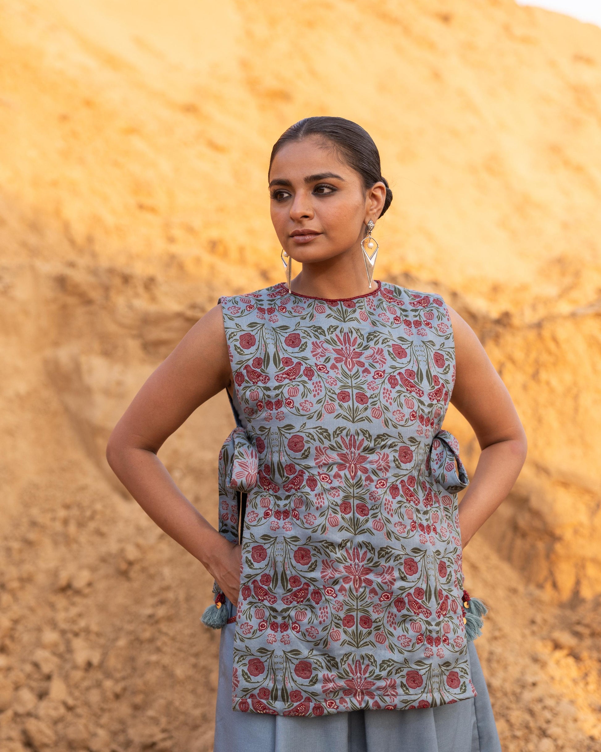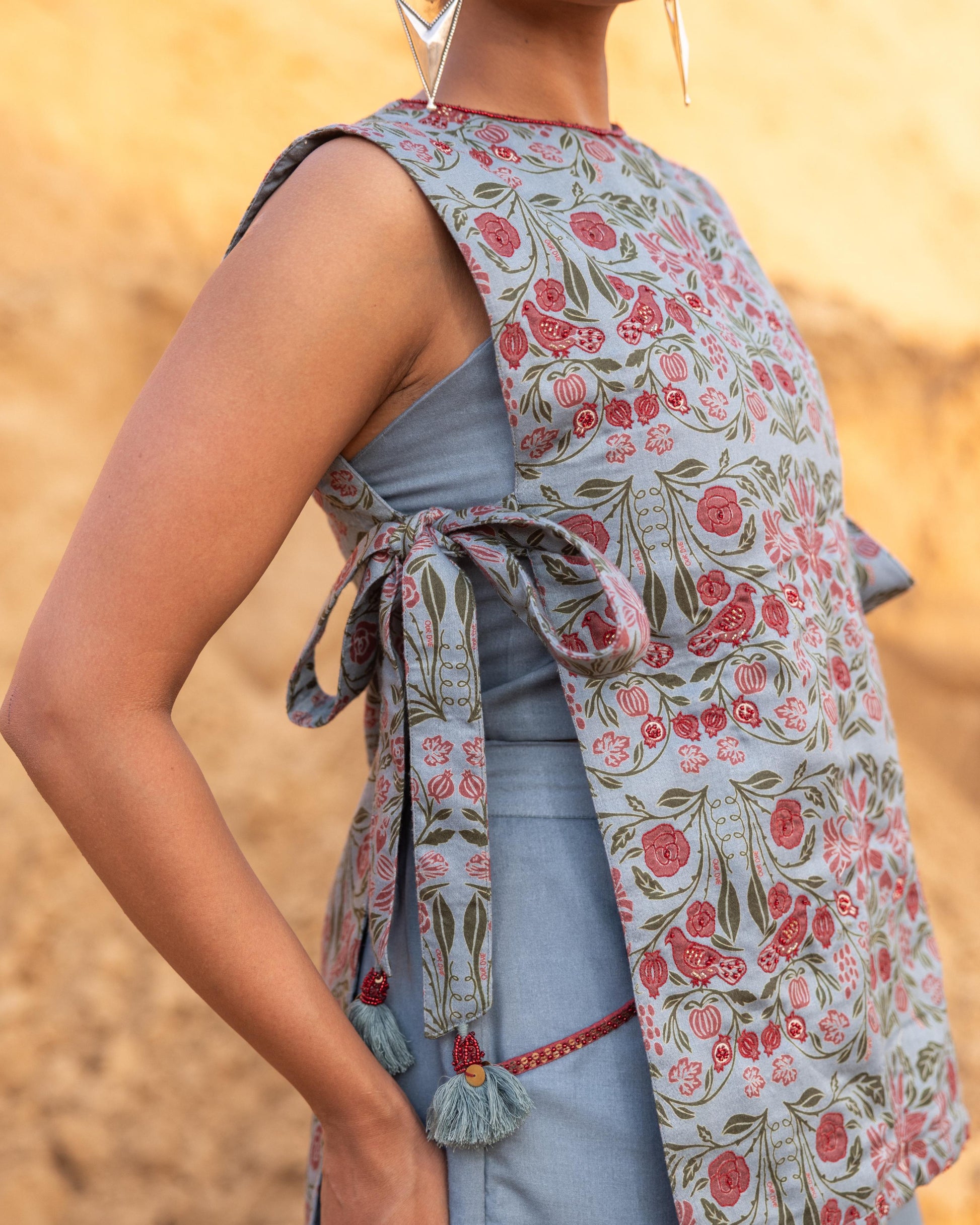 A contemporary 3-piece skirt set featuring a tabard-style top paired with a tube blouse and an up-down skirt. The top is embellished with intricate beadwork and playful tassels, while the pocket hem detailing adds a refined touch. A perfect blend of simplicity and elegance.