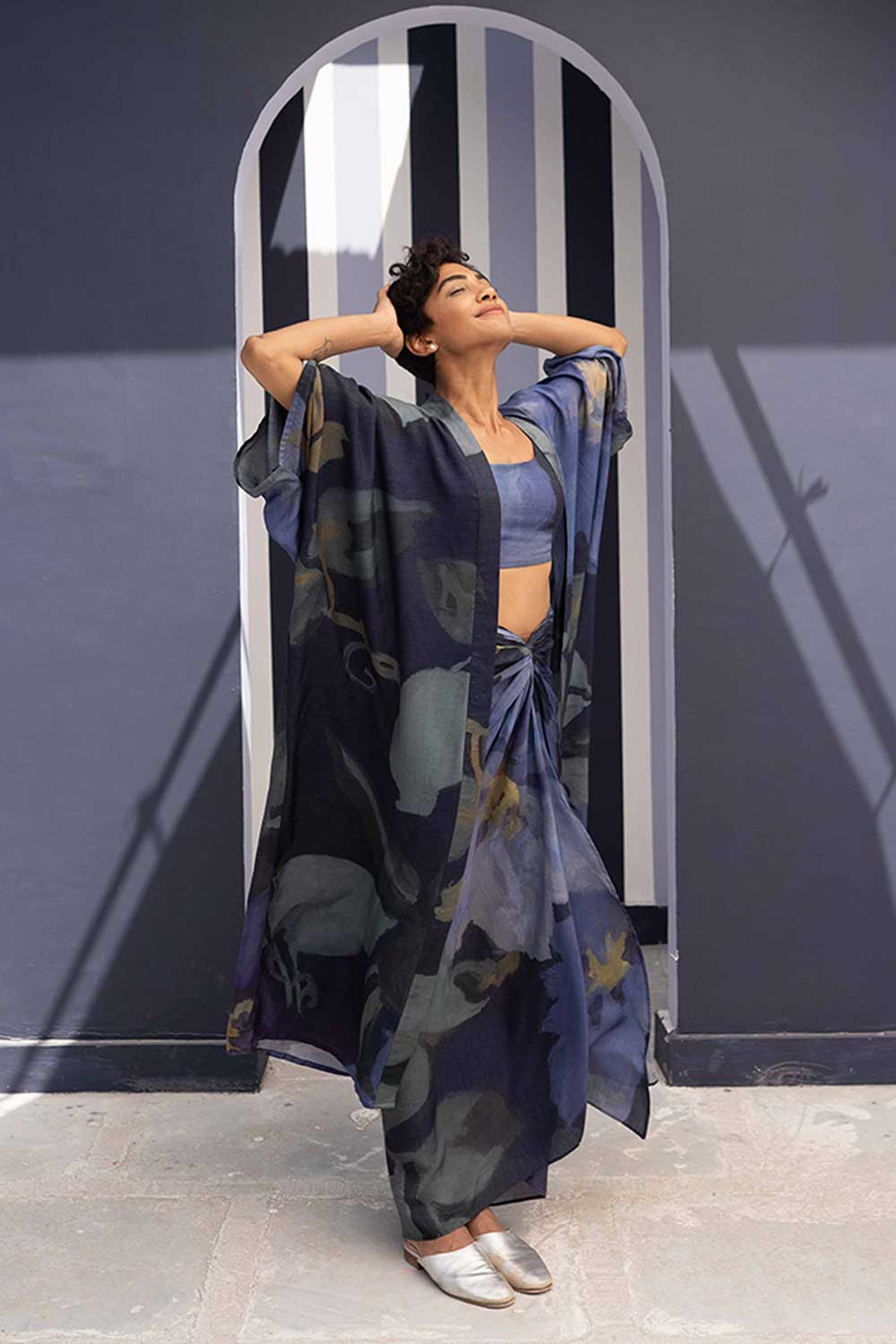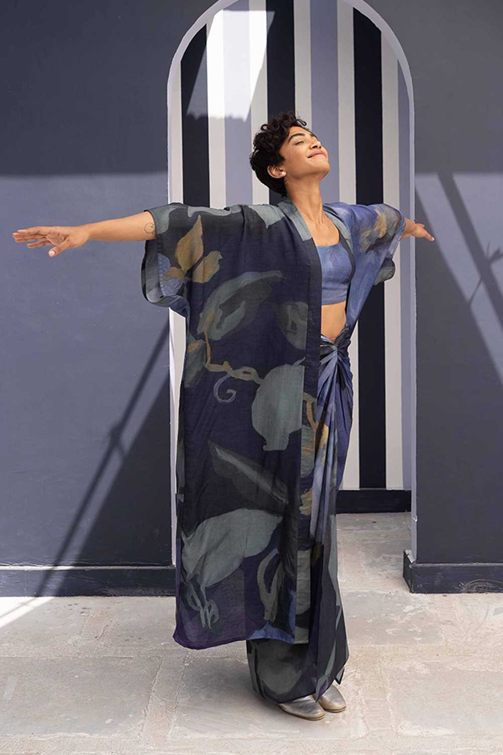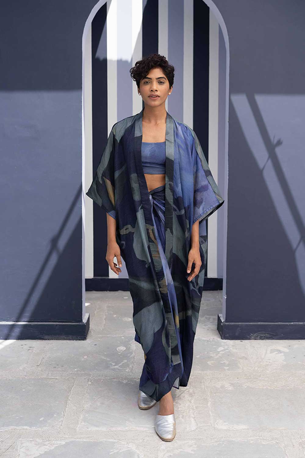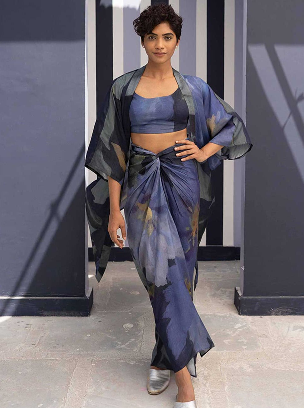 The set includes a blouse, a pre draped twist skirt and a shrug.