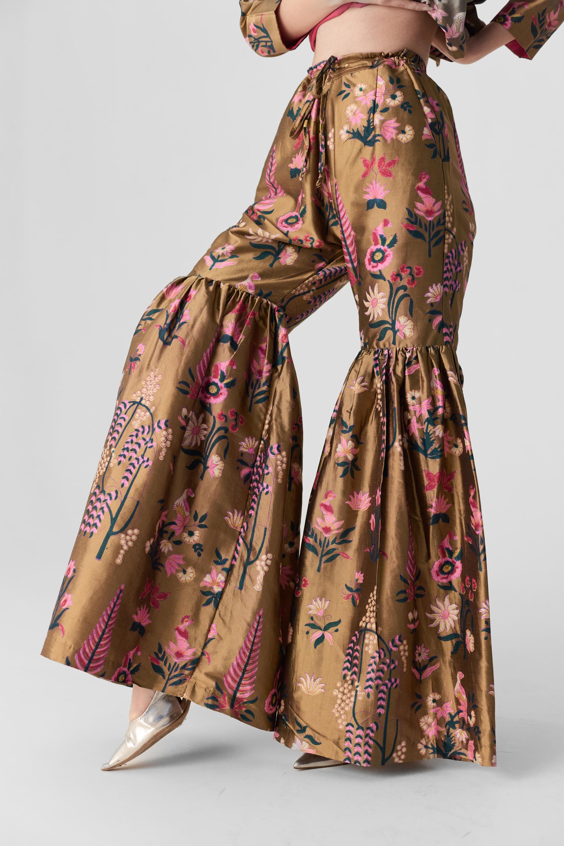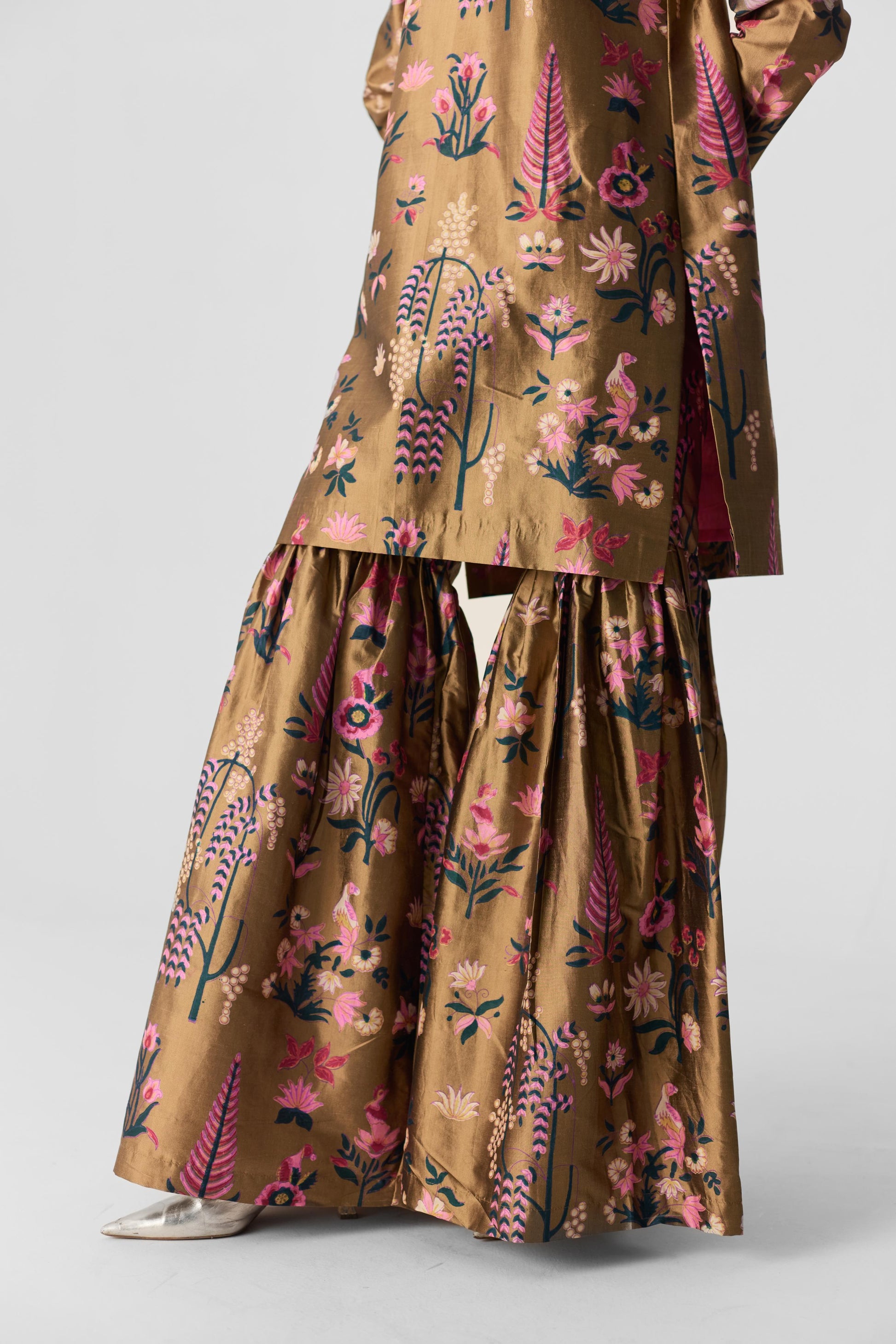 This exquisite Bahar Sharara set is crafted from luxurious silk, featuring the traditional Bahar print created through meticulous hand-block printing. The set includes a short-length kurta with a flattering V-neckline and 3/4th sleeves, lined with soft mulmul for added comfort. The sharara is designed with side pockets for convenience, and its flowing flares offer a perfect fit with a graceful, voluminous silhouette. This set beautifully blends tradition with modern comfort.