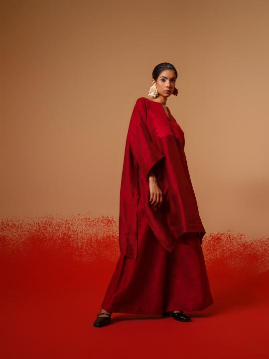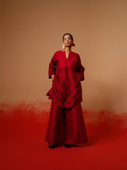 Where ease meets craft. A relaxed tunic cut in our signature crushed silk, elevated with delicate hand-sewn floral motifs — effortless, textured, and made for everyday poetry.
