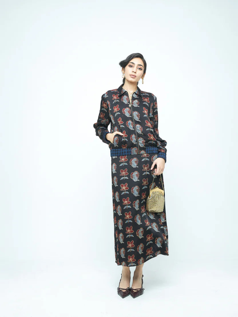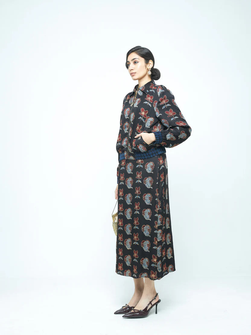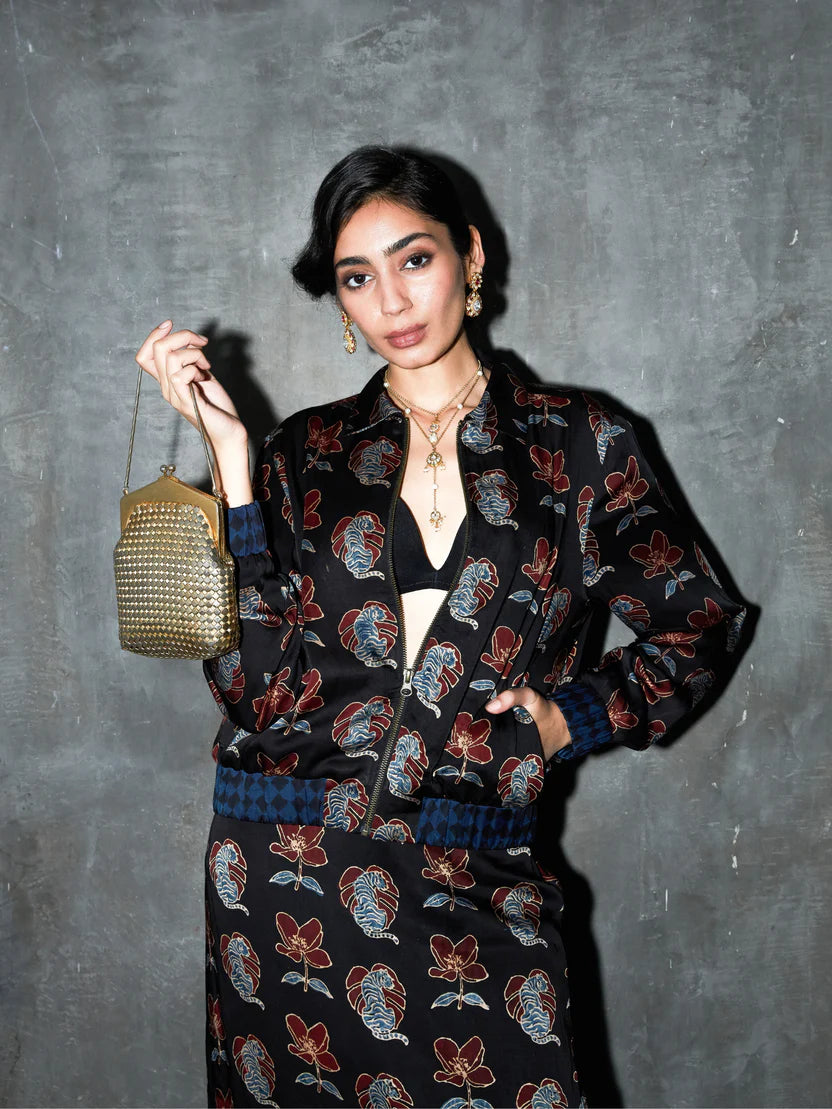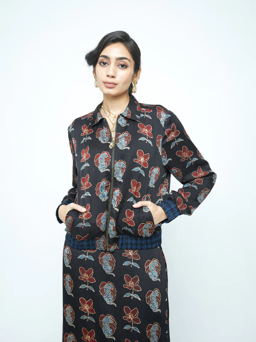Description: A statement bomber jacket in modal featuring the Blooming Beast print. Designed with a classic collar and a structured yet easy fit, it brings bold print and clean tailoring together — a standout layering piece for day or night.