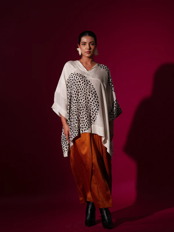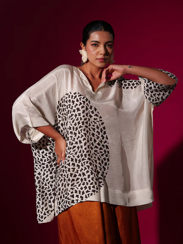 Relaxed top made in light silk features artisanal hand block printing and intricate hand embroidery.