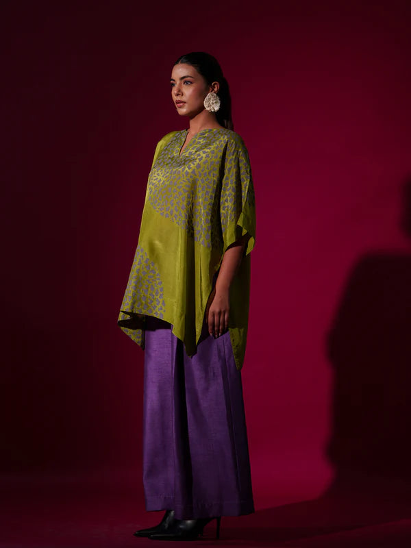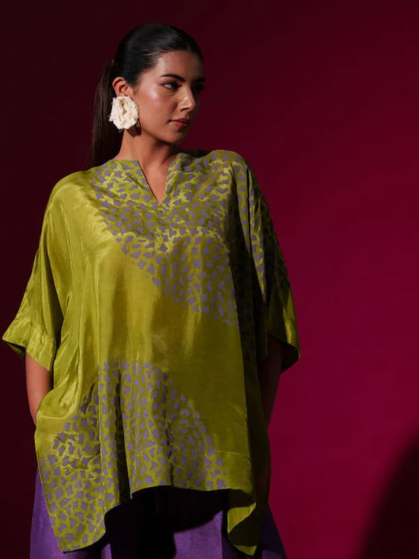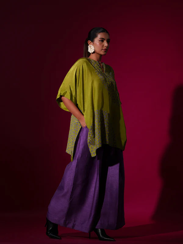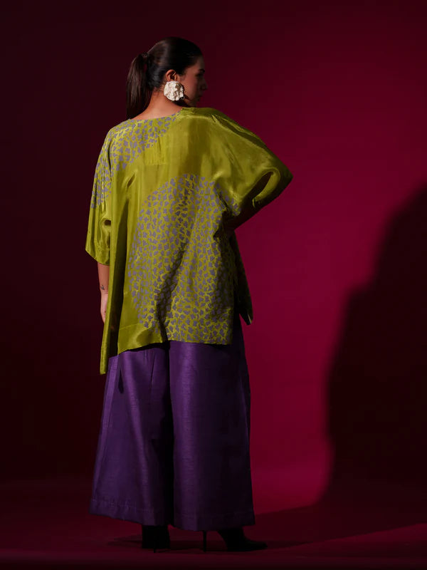 Relaxed top made in light silk features artisanal hand block printing and intricate hand embroidery.