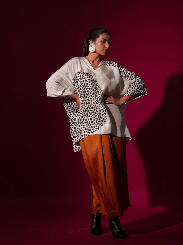 Relaxed top made in light silk features artisanal hand block printing and intricate hand embroidery.