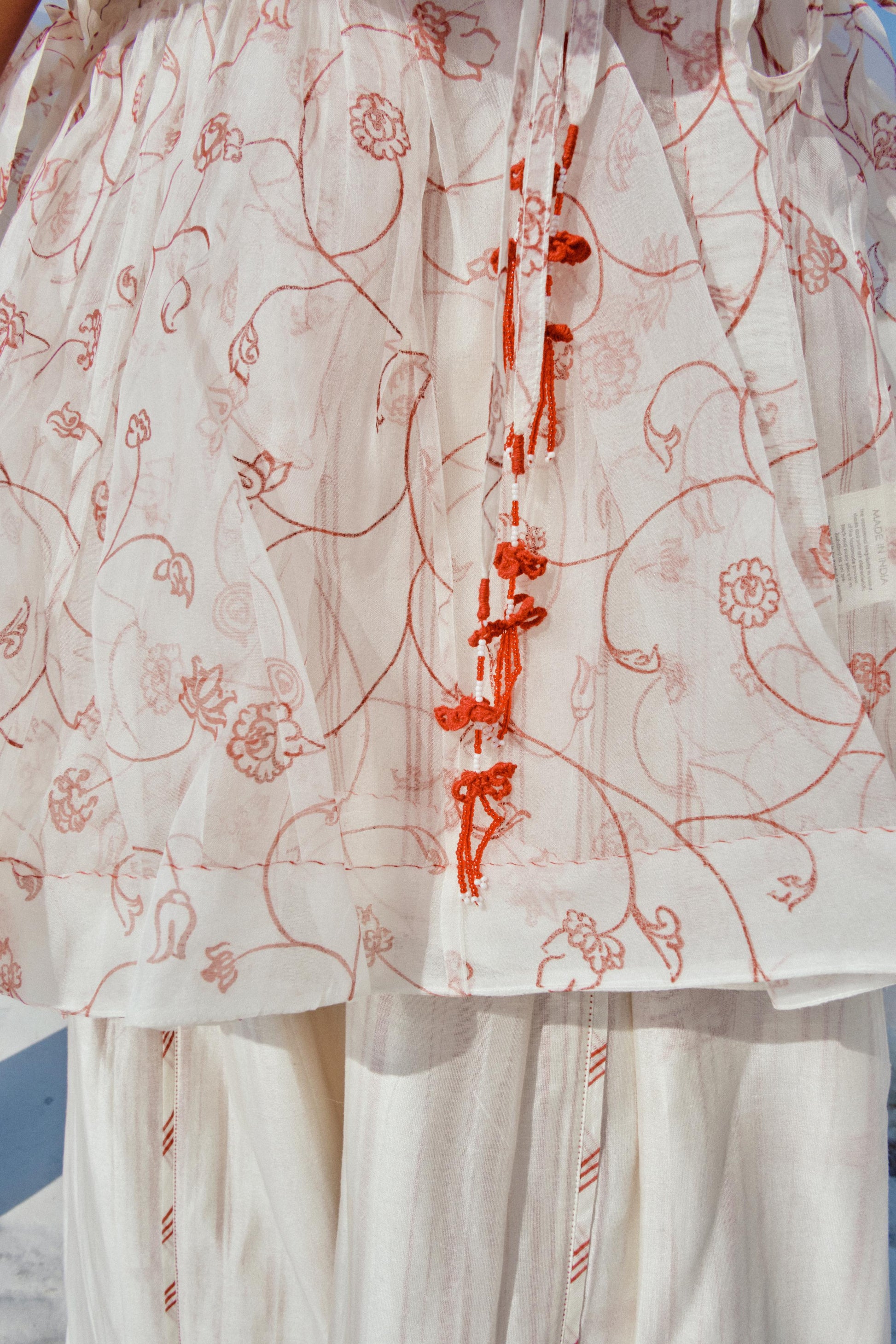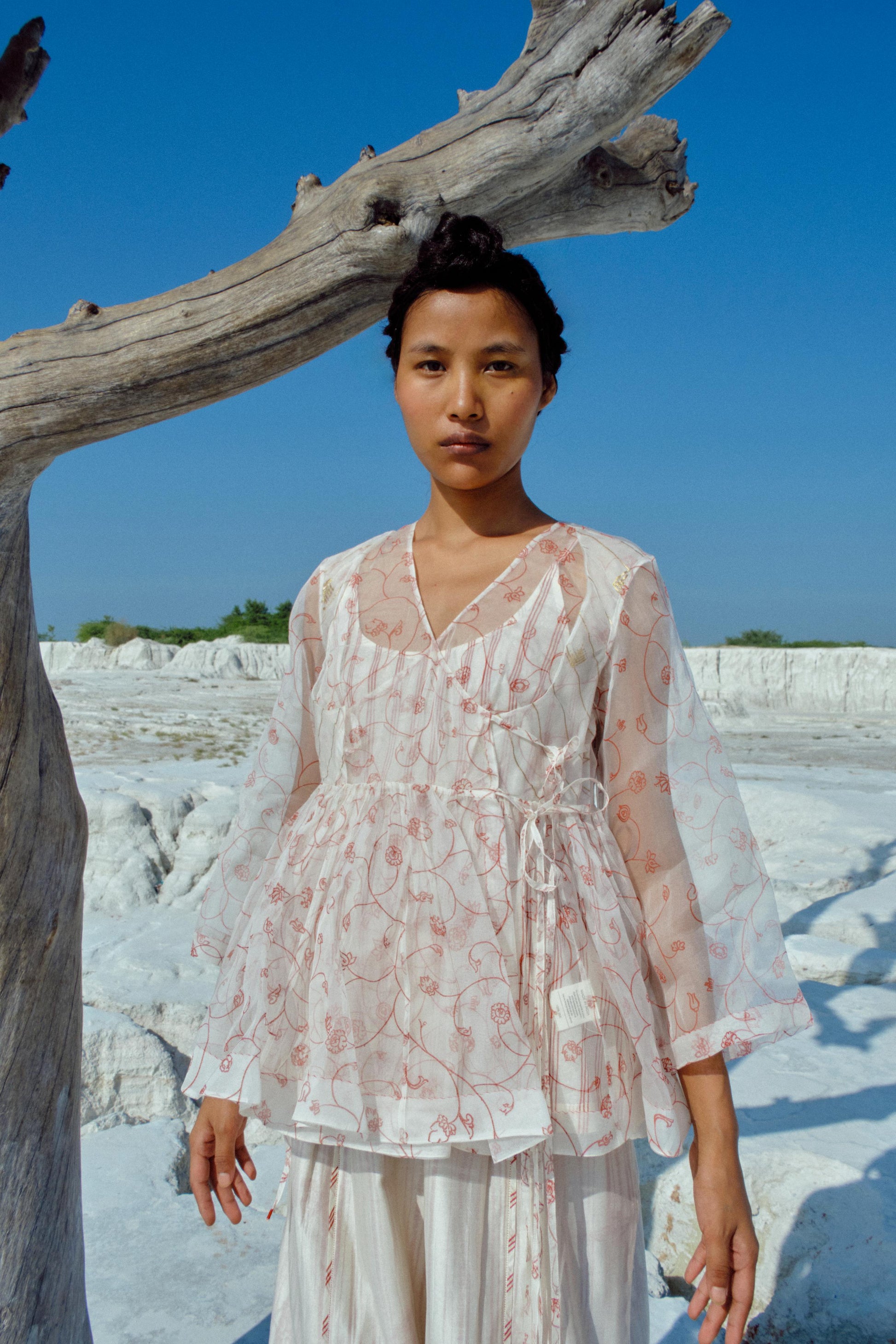 A contemporary reimagination of a timeless silhouette, the Bella Angrakhi Top is crafted in hand-screen-printed organza, light and luminous in its fall. Overlapping panels are secured with delicate tie-ups finished with handmade tassels. Paired with a cotton slip, the top moves fluidly over the body, embodying carefree elegance and quiet sophistication. Hours of careful, handwork imbue this piece with artisanal charm and timeless refinement.