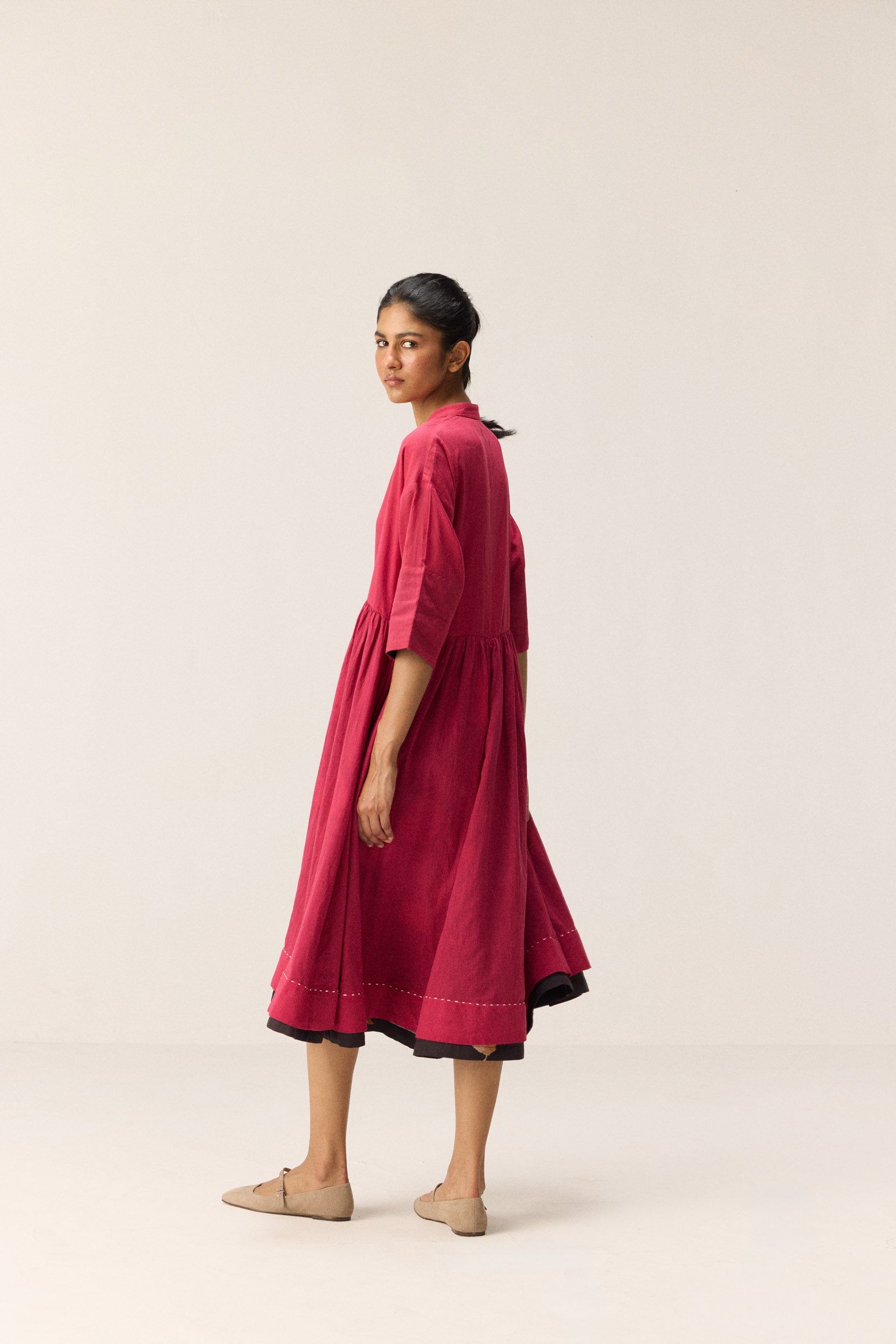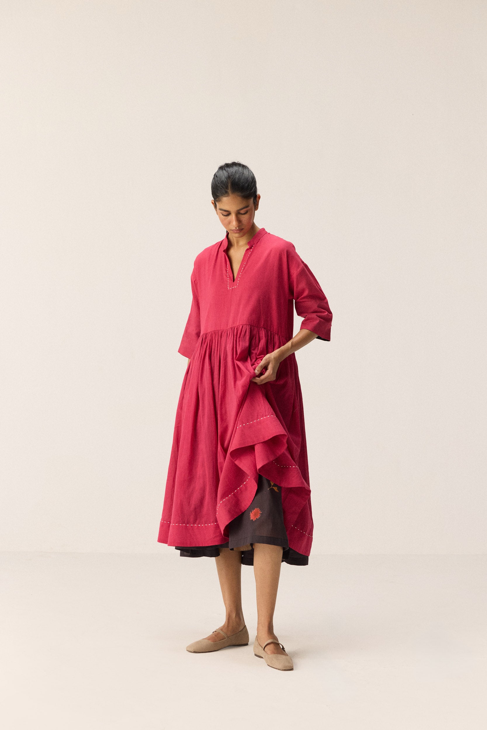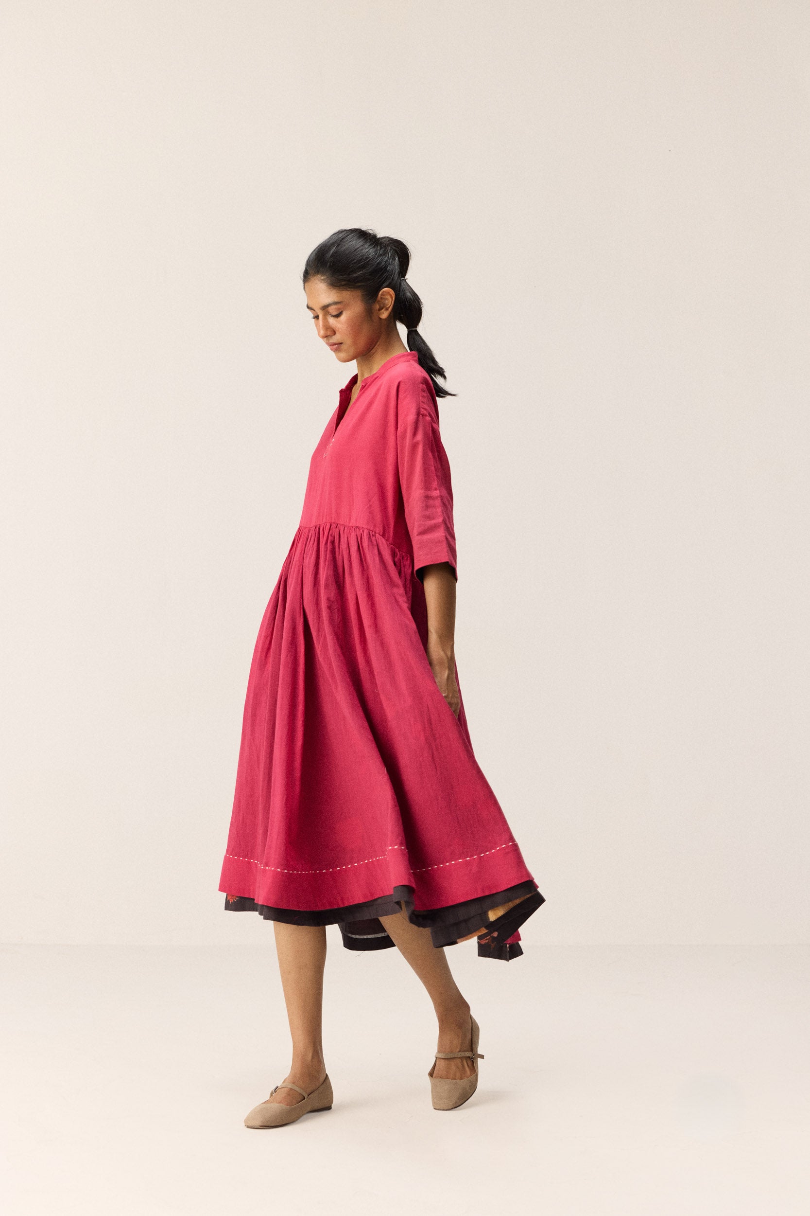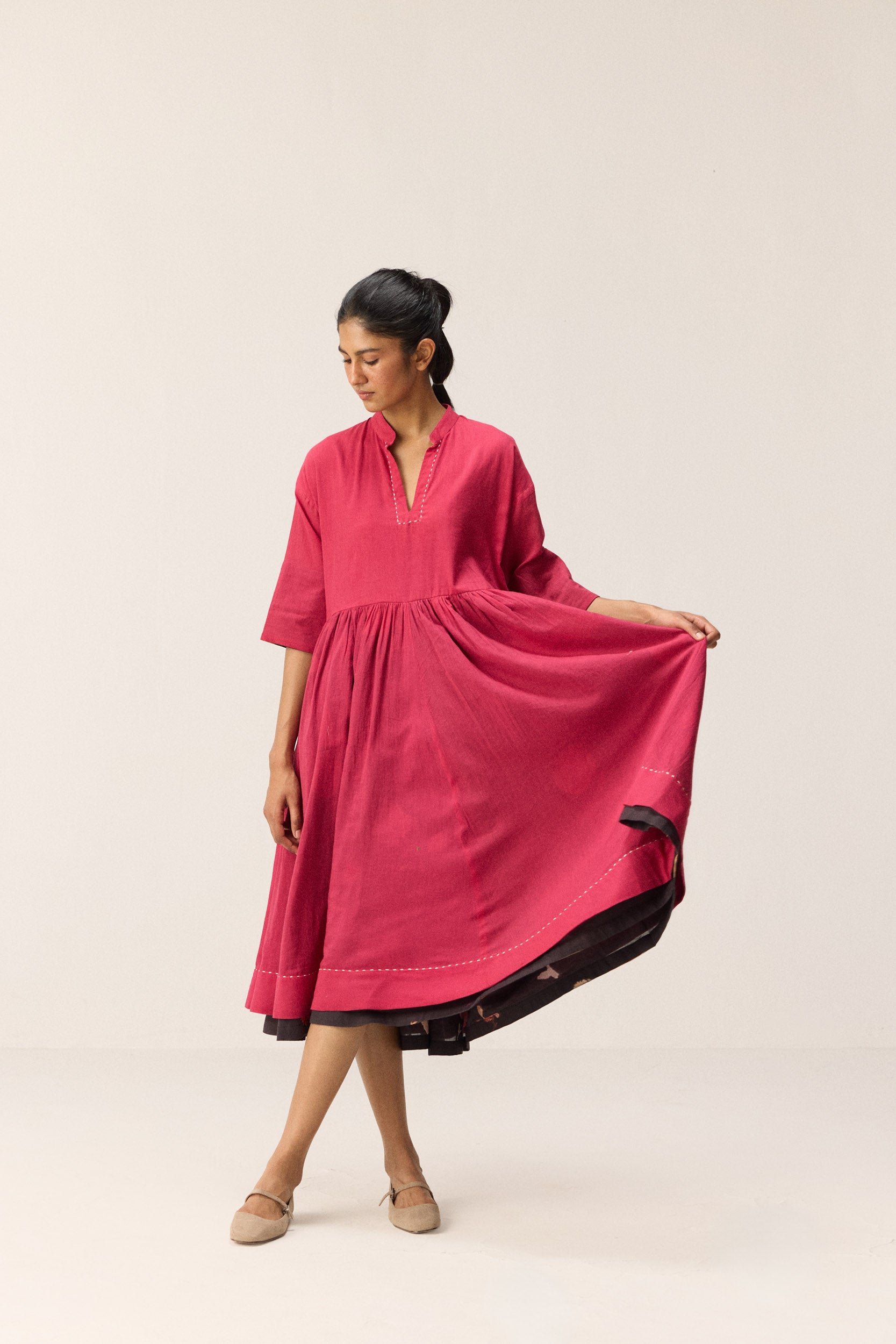 A vibrant bright pink dress accented with delicate white running stitch detailing along the neckline and hem. The standout feature is the charcoal printed fabric lining at the bottom, extending beyond the dress to create an elegant peekaboo effect. A perfect blend of bold color and subtle contrast, crafted for effortless charm.