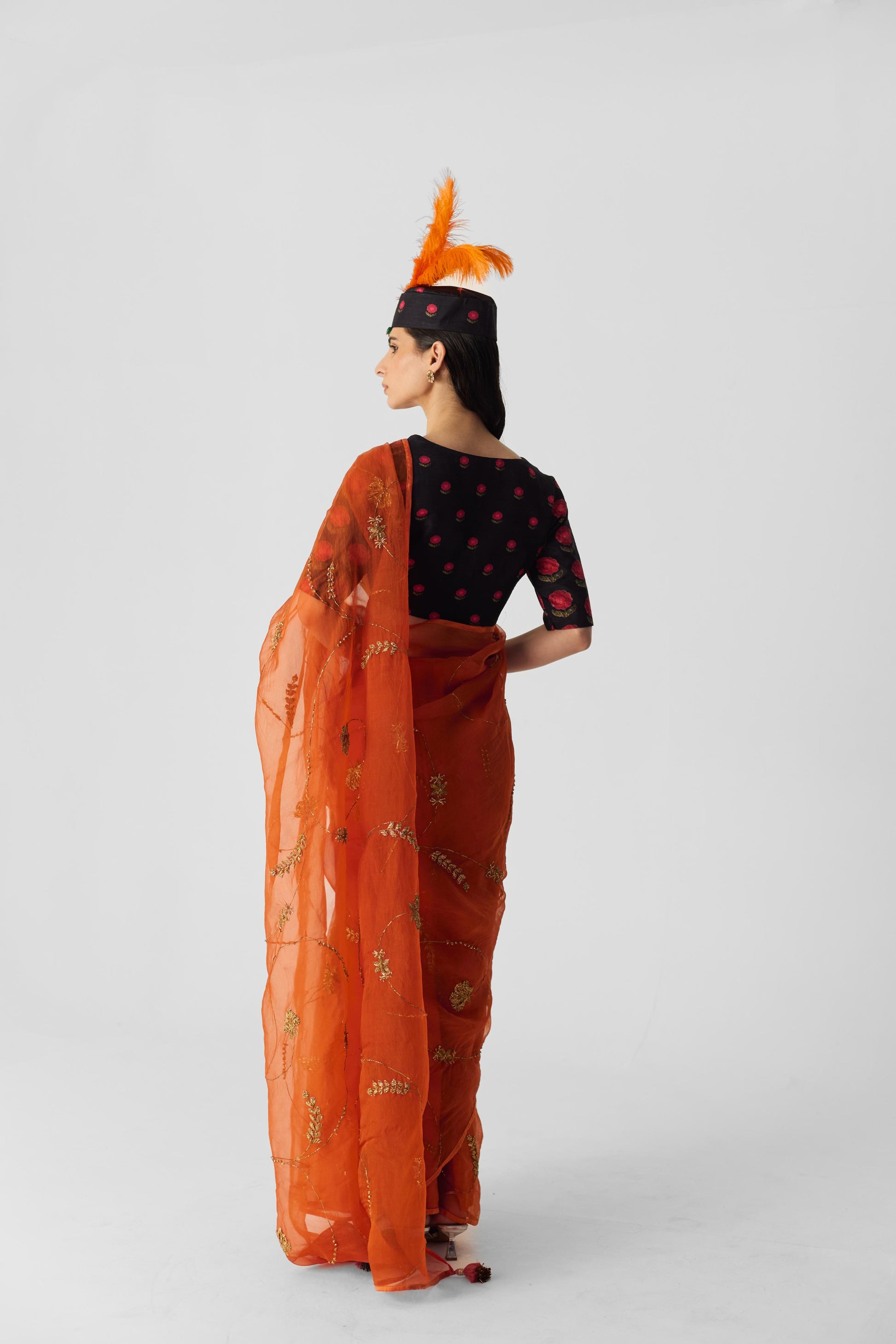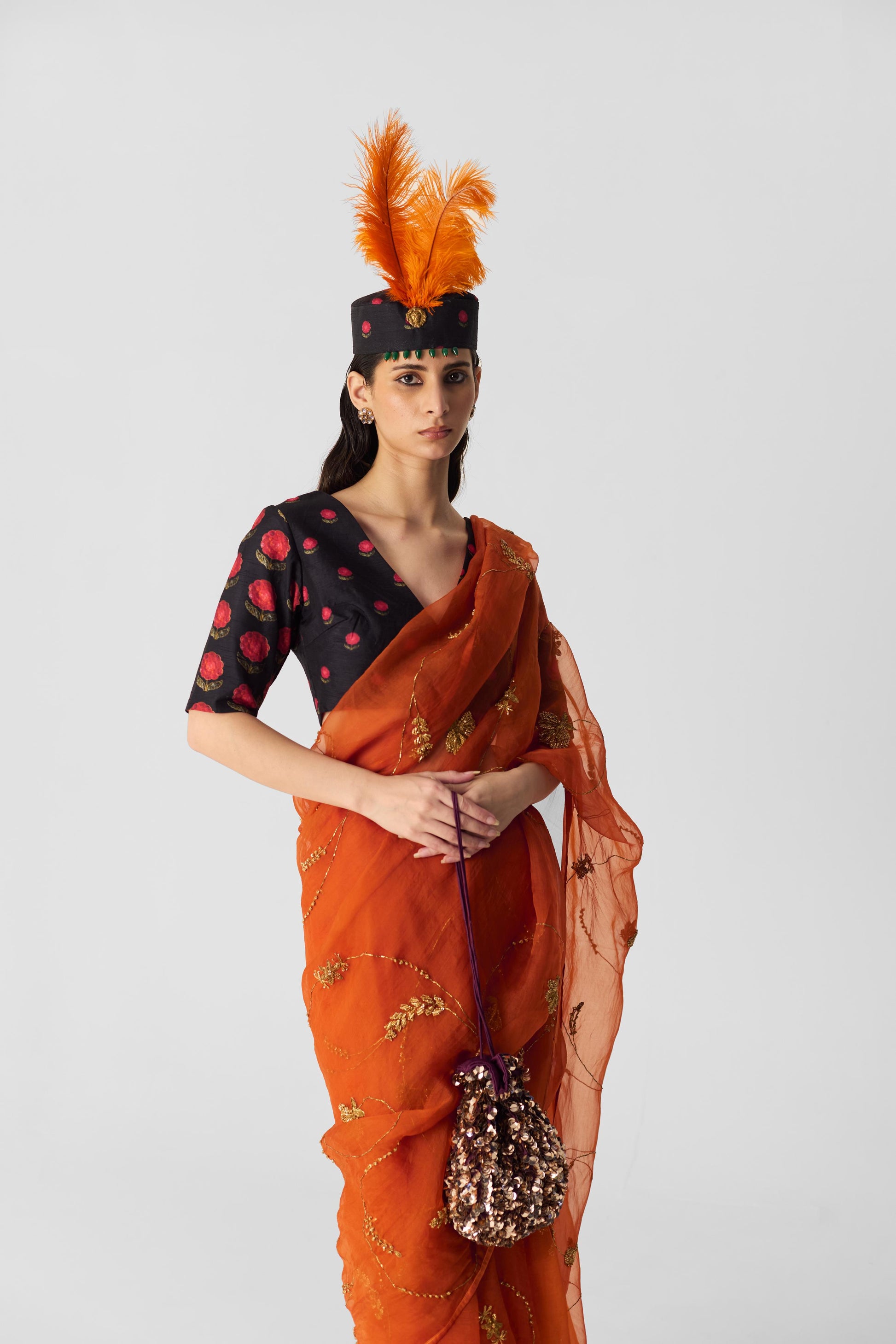 This chic V-neck blouse, featuring a striking black booti print, is designed with a front hook-and-eye closure for a tailored and flattering fit. The blouse is completed with elegant elbow-length sleeves, making it a perfect blend of style and sophistication.