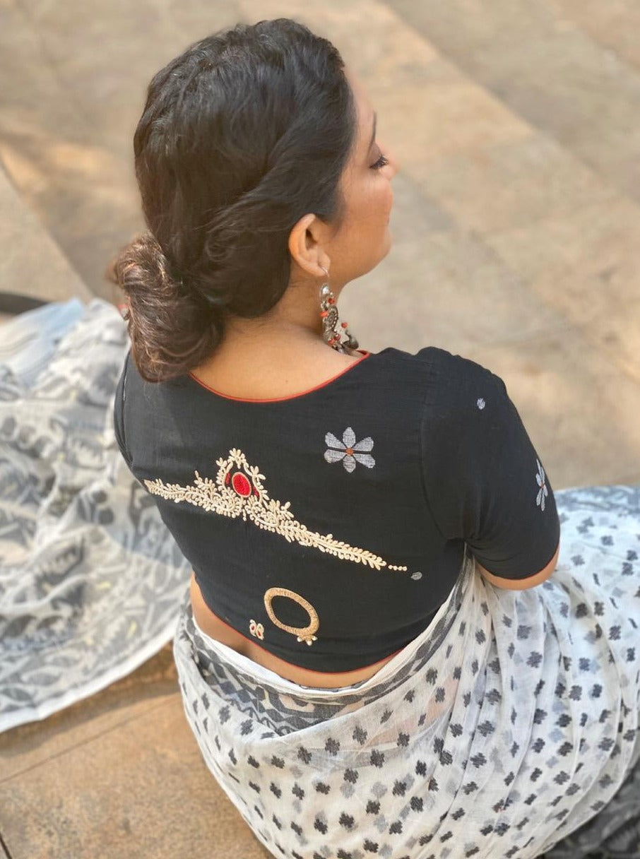 On handwoven Black Jamdani, The Chandan Pattern from Chokher Bali is hand embroidered with a big Nathh which is common of a Bengali Bride. We have named it Binodini after Aishwarya's character in the film.