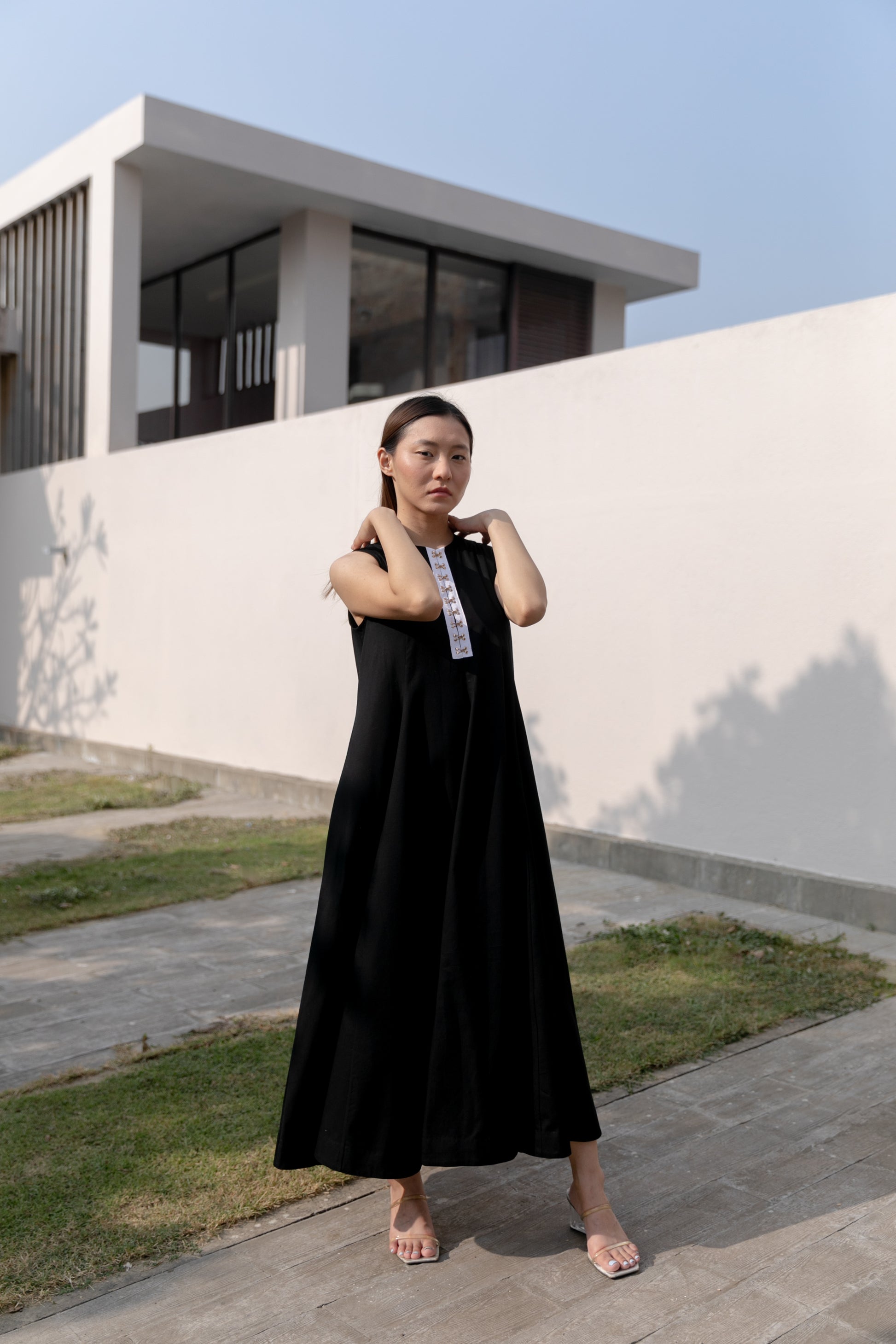 Black sleeveless midi dress with metallic hook tape on the neckline