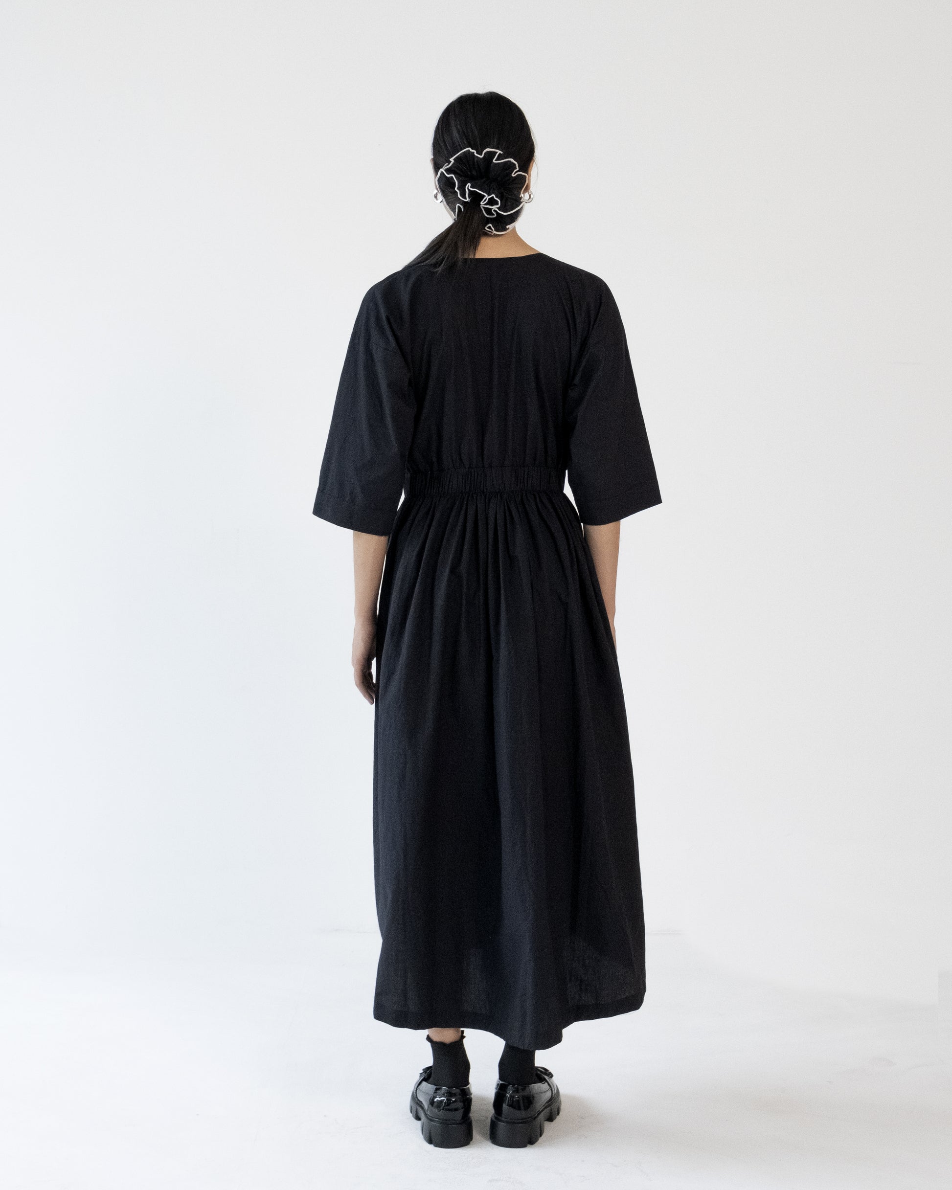 A drop shoulder design dress, with double pockets in the yoke and an elasticated waist. Made in cotton, and comes with side slits for effortless movement and all-day comfort.