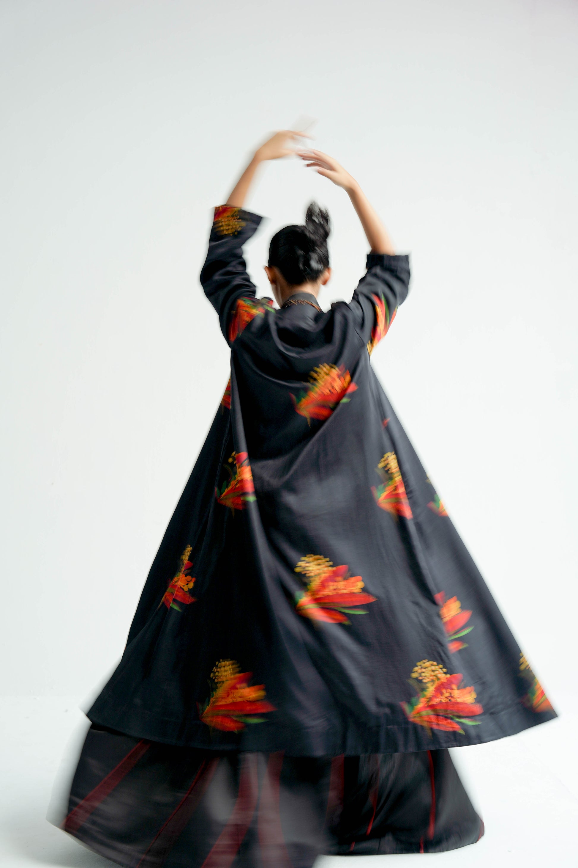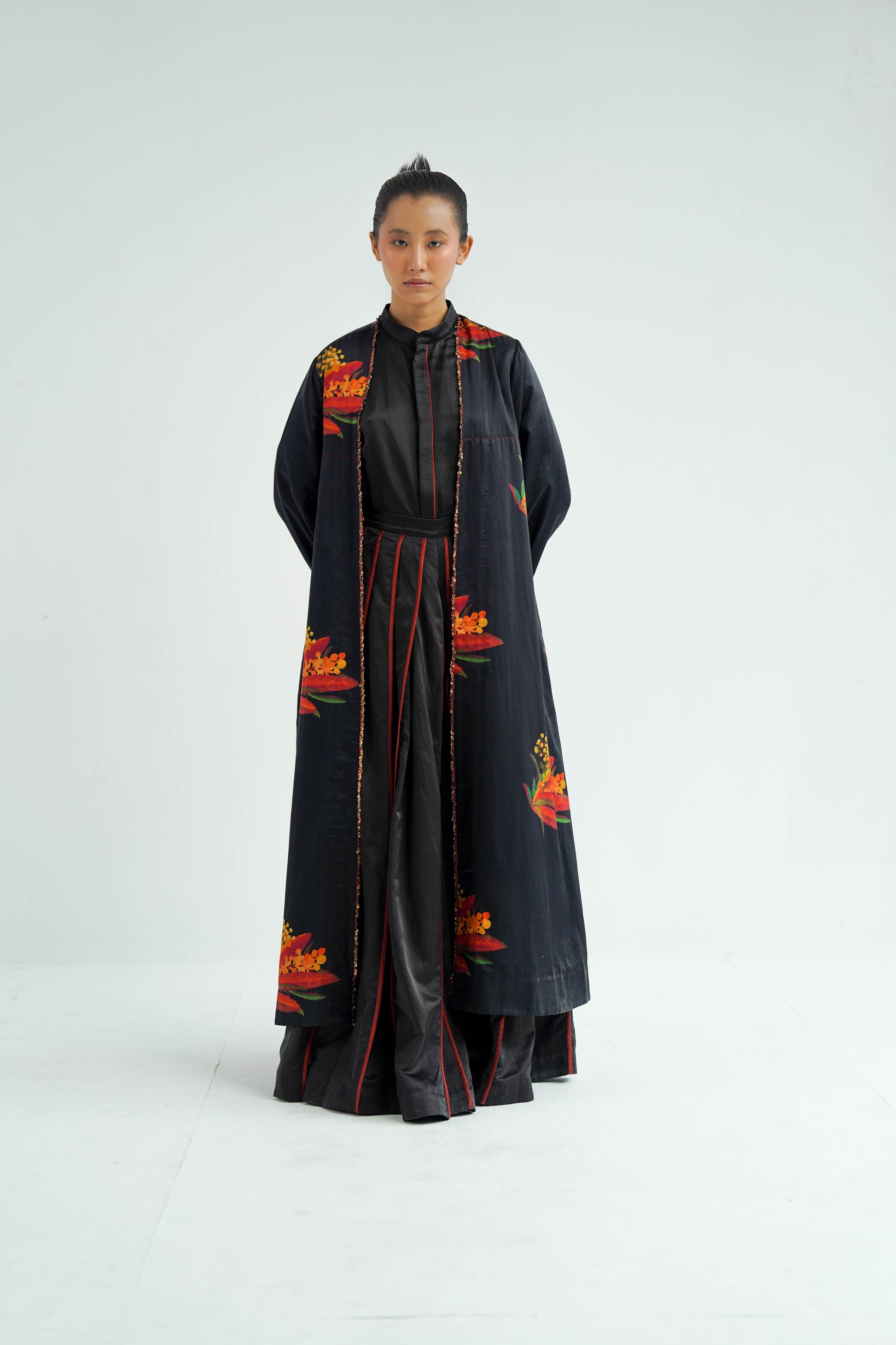 This Black firefly co-ord set is crafted from silk. It features a black handpainted digitally printed buta. The set includes a relaxed fit, front-open with pocket detailing and contrast plum piping finished with metal sequin edge finish.