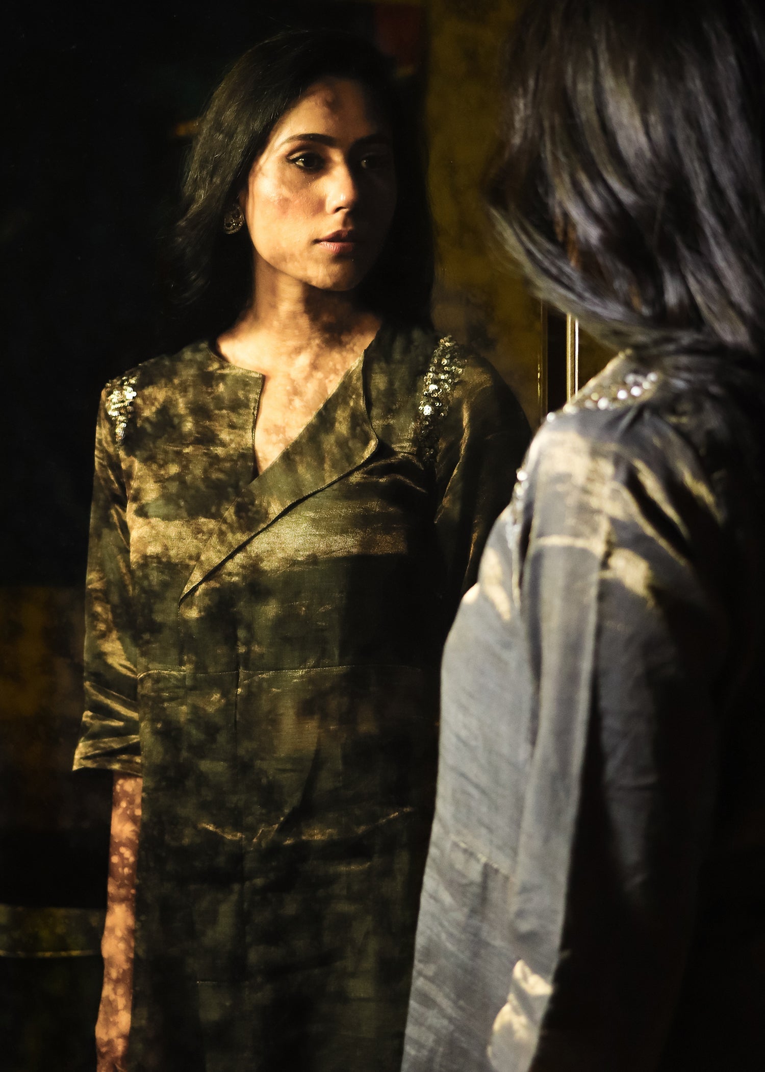 A gorgeous Black Tissue ensemble featuring an elegant flap neckline. The kurta gleams with sequin detailing on the shoulder, making this piece ideal for your evening soirees. The beauty of this weave is that it shifts colour under different light.