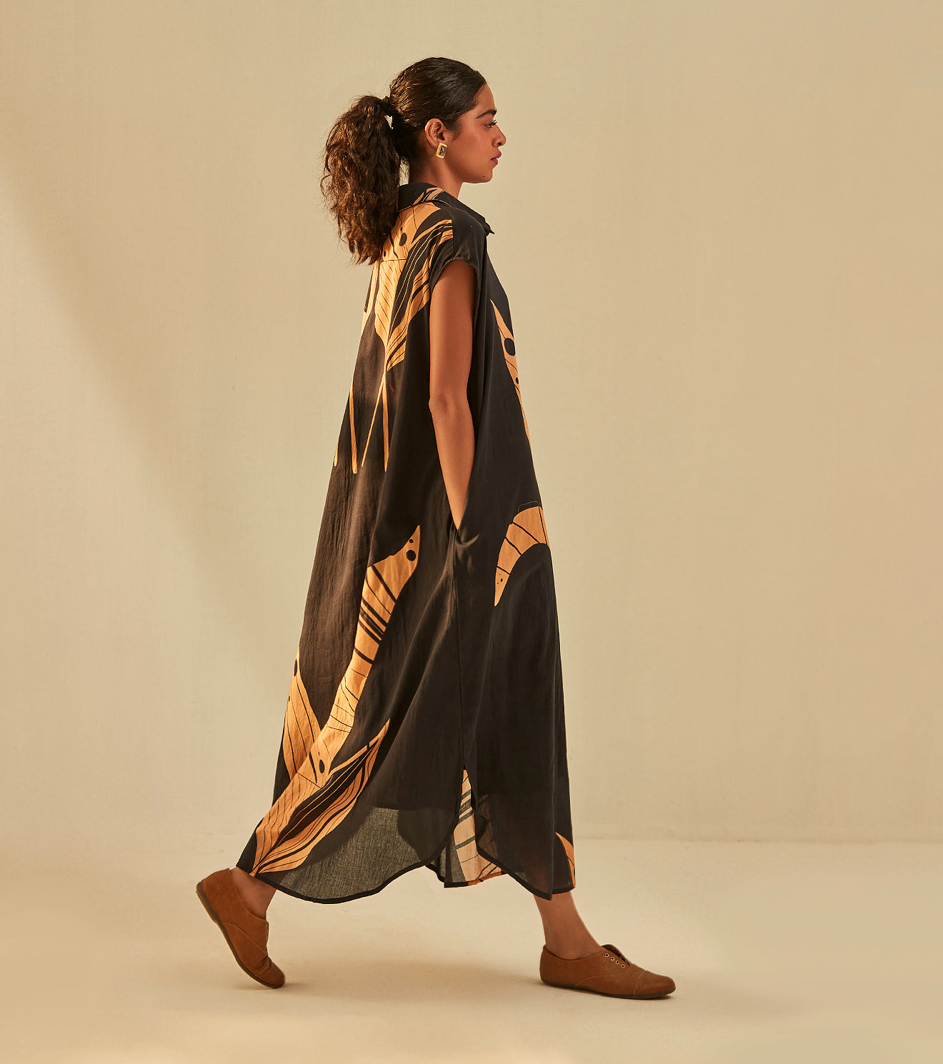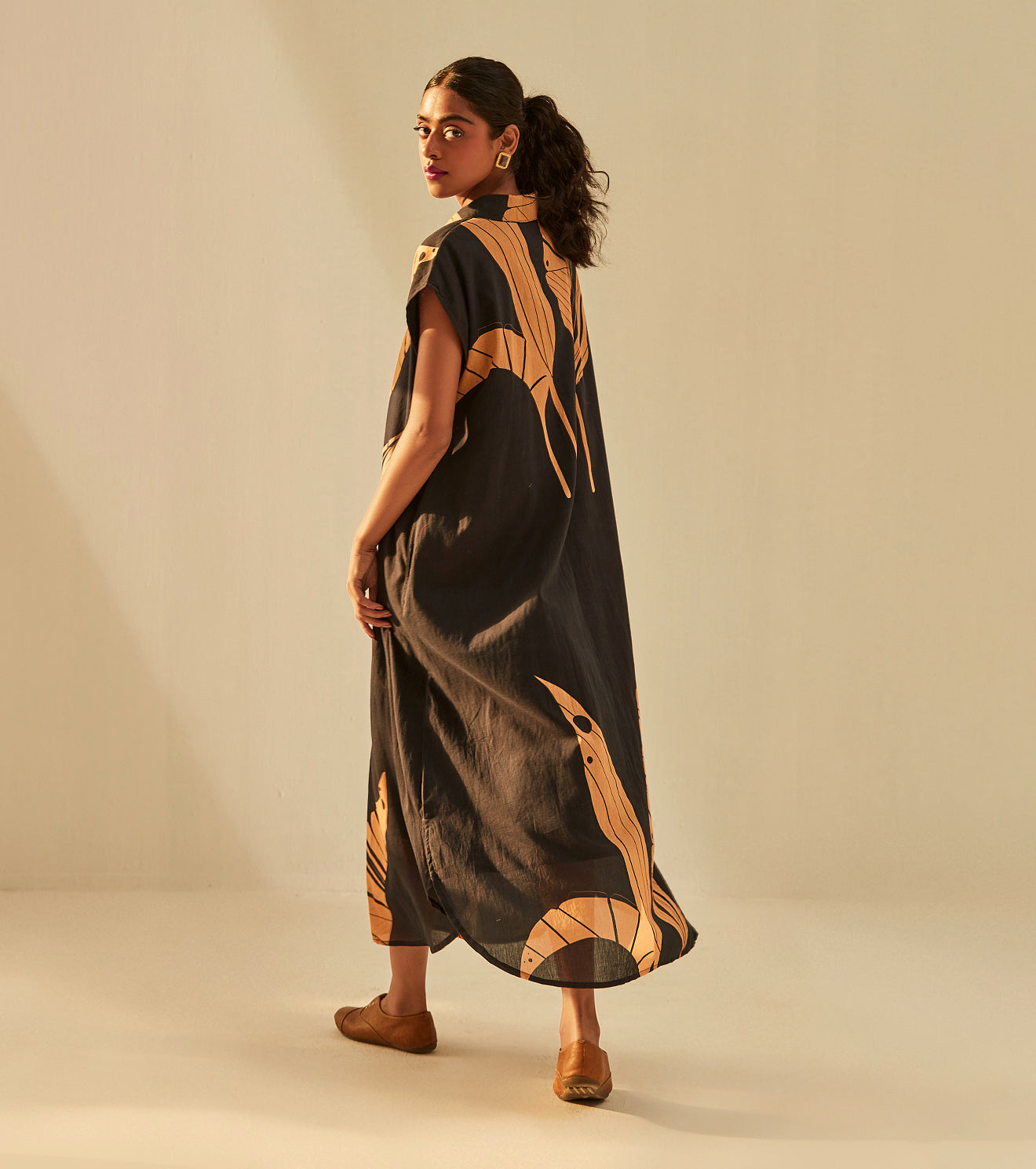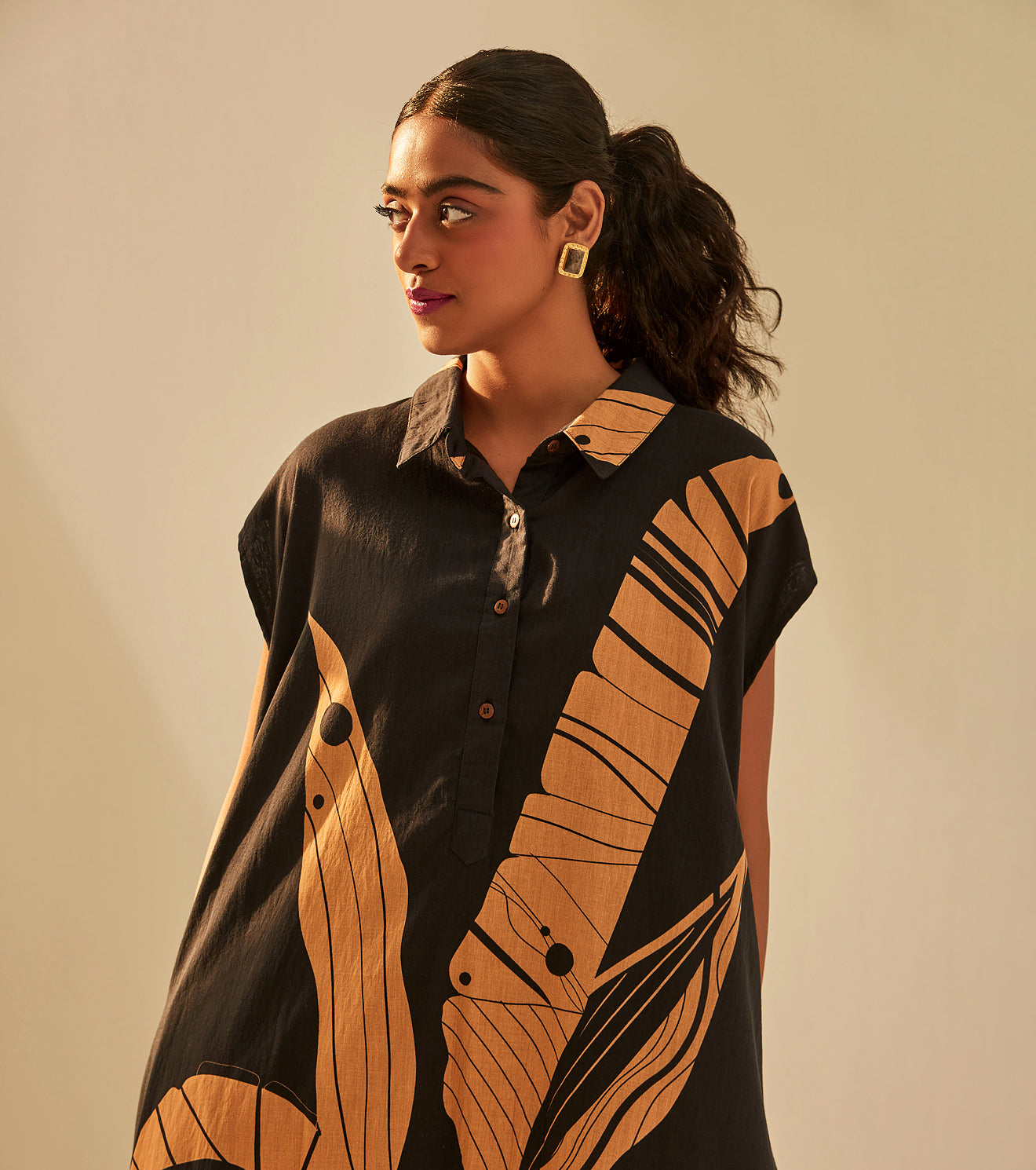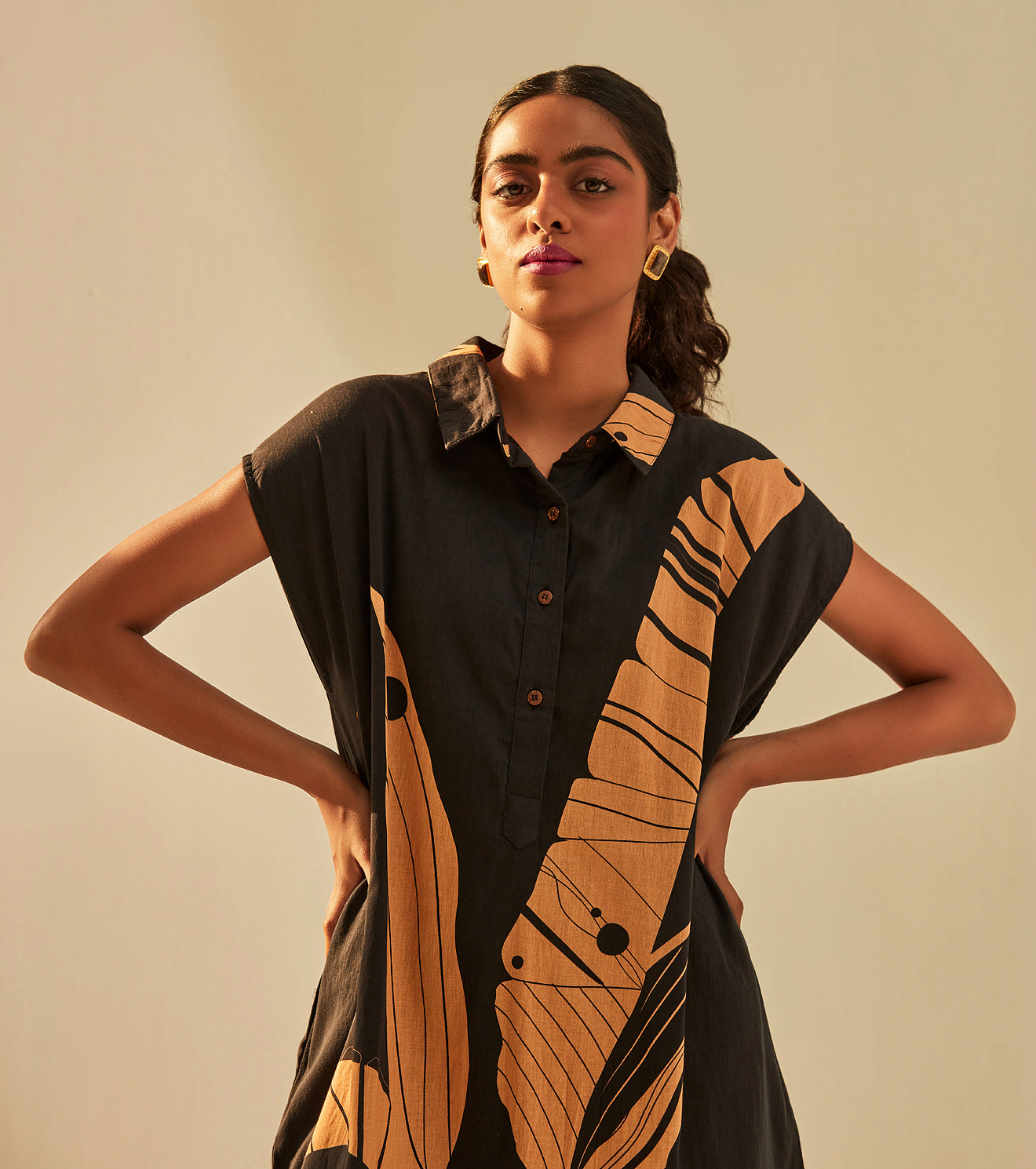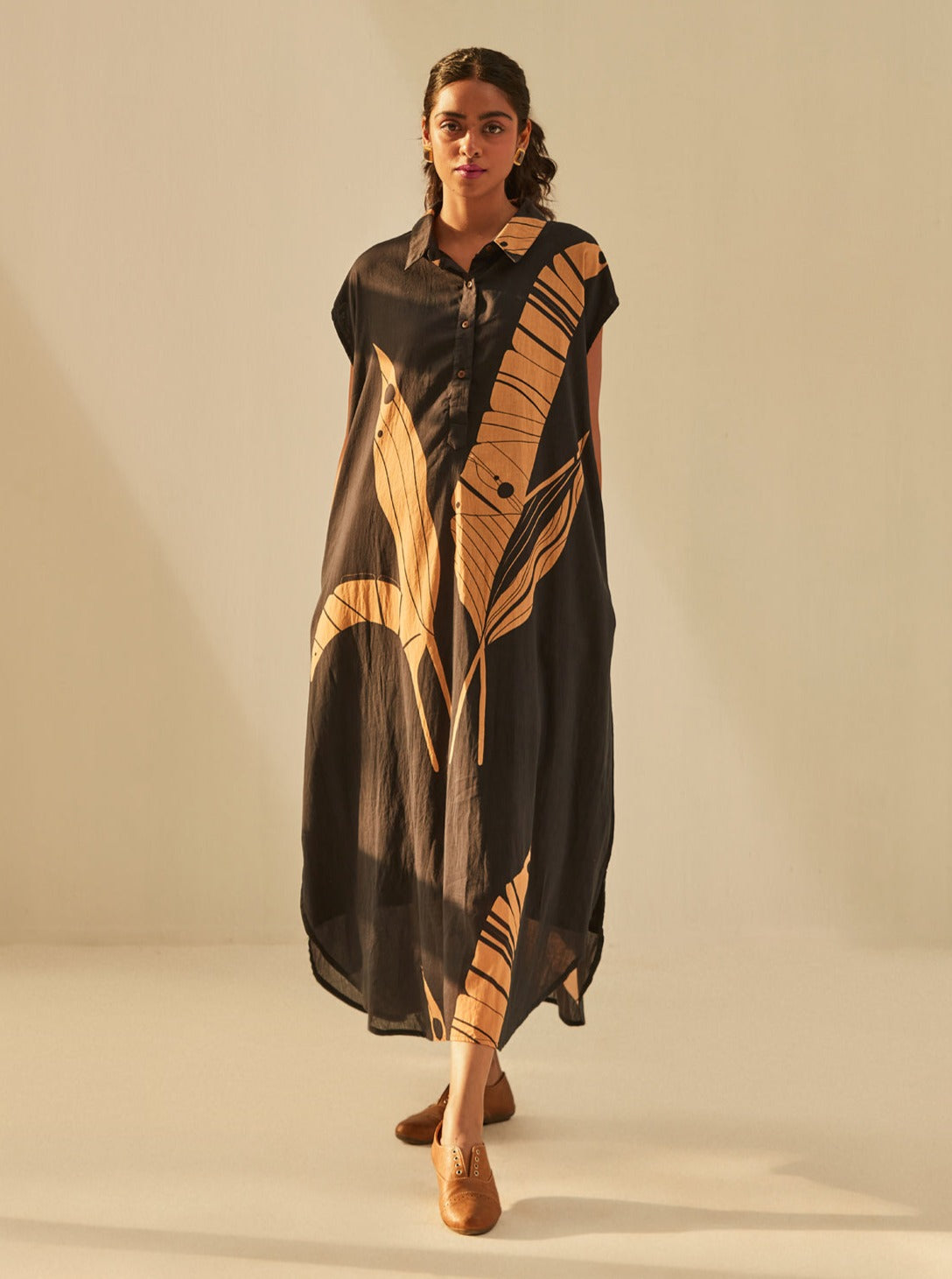 Black paradise shirt dress is simple, elegant and crafted for every body. adorned with a statement print crafted in cotton mul.Handcrafted in India. Side seam pockets. Fully lined.