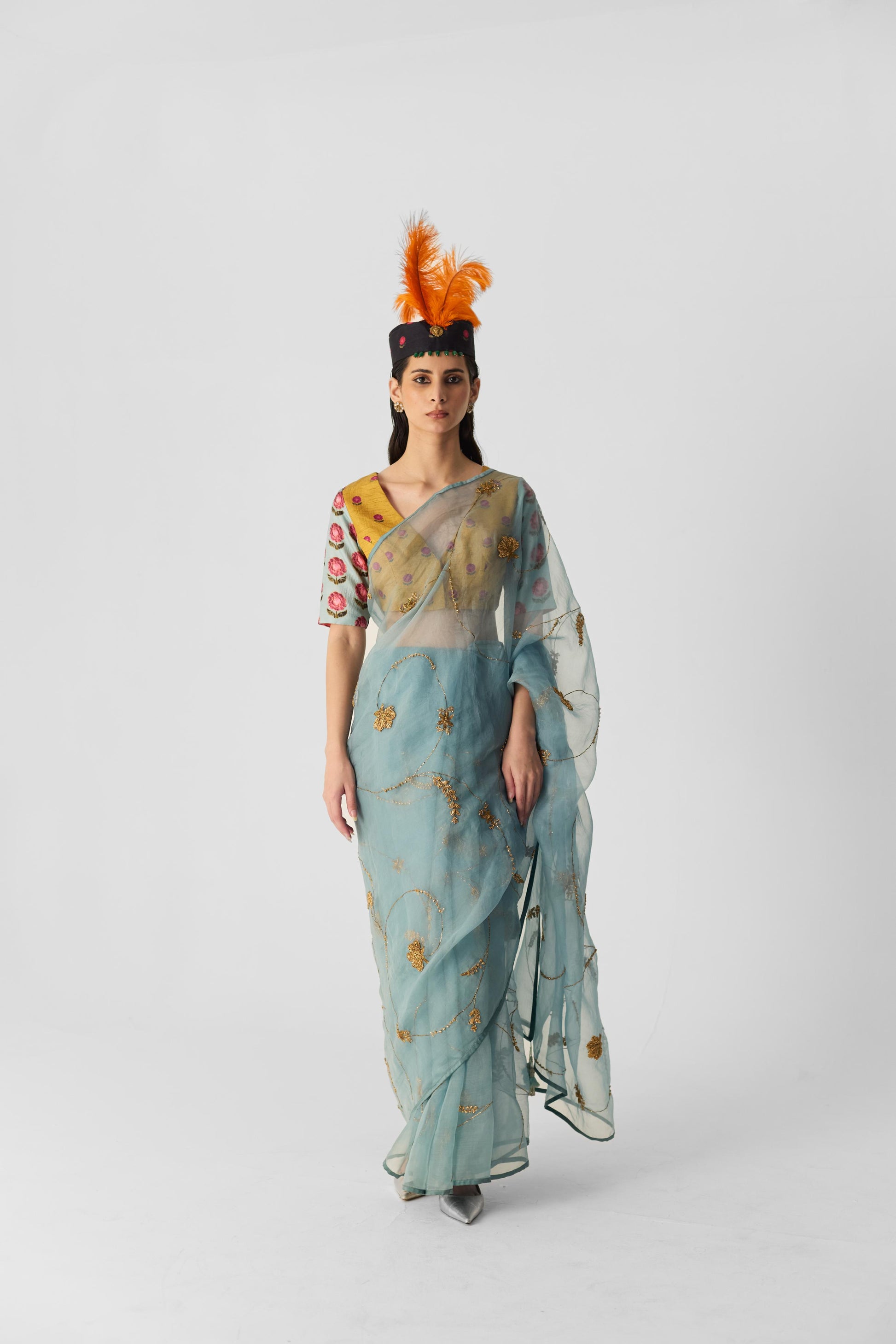 This exquisite Blue organza saree is adorned with intricate hand-embroidered gota thread and dabka work, crafted in the traditional "pitta" style. The saree features delicate floral jaal motifs, giving it a timeless vintage festive appeal. The pallu is enhanced with tassels for a graceful drape, while satin piping along the edges provides a polished and elegant finish, making this saree a perfect choice for special occasions.