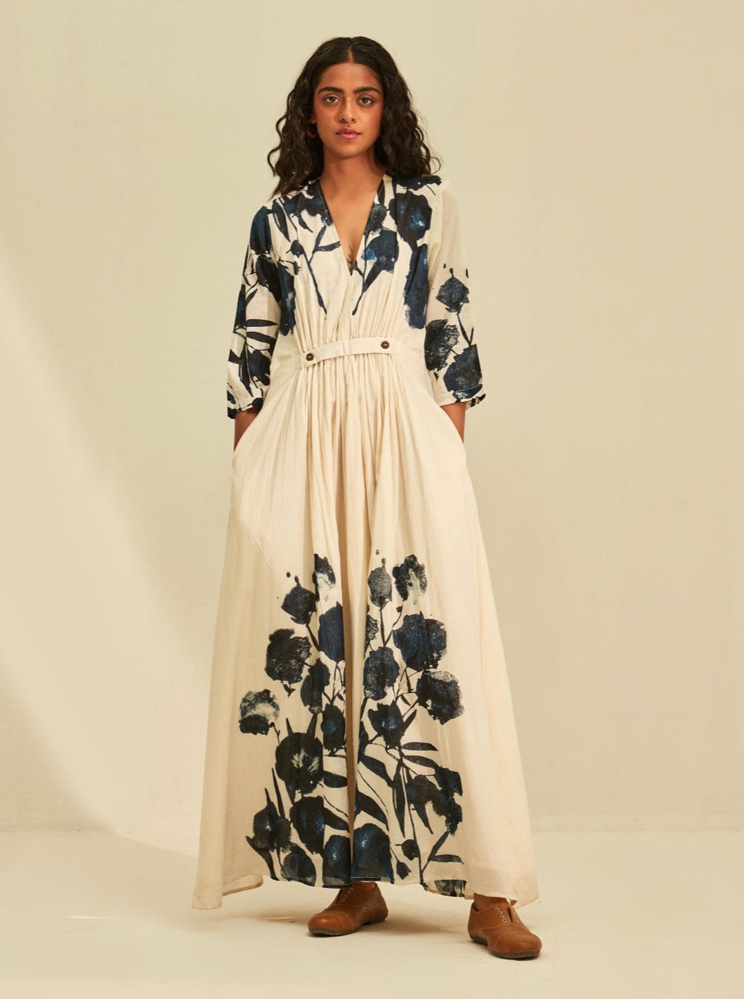 Step into summer grace with our maxi dress, in off white adorned with signature floral print designed to flow effortlessly with your every move. Crafted in soft cotton mul. Handcrafted in India. Side seam pockets. Fully lined.
