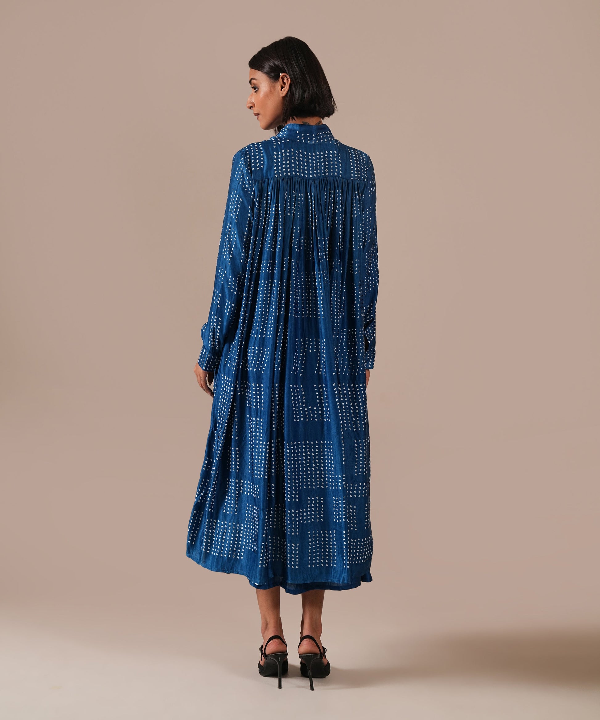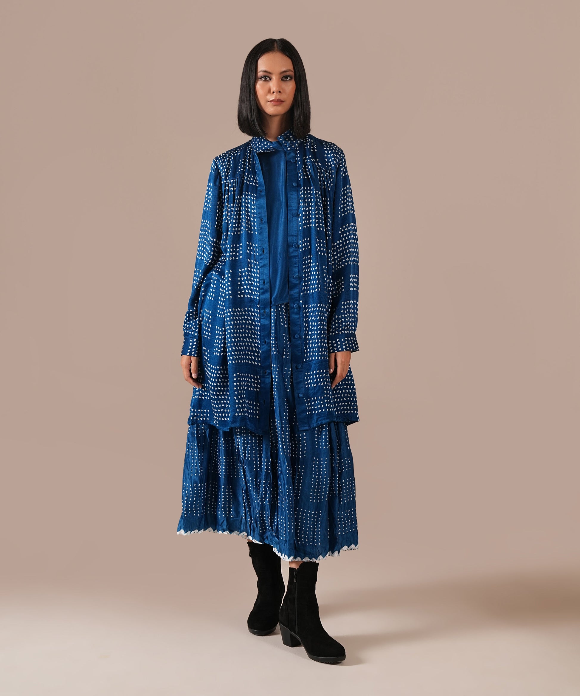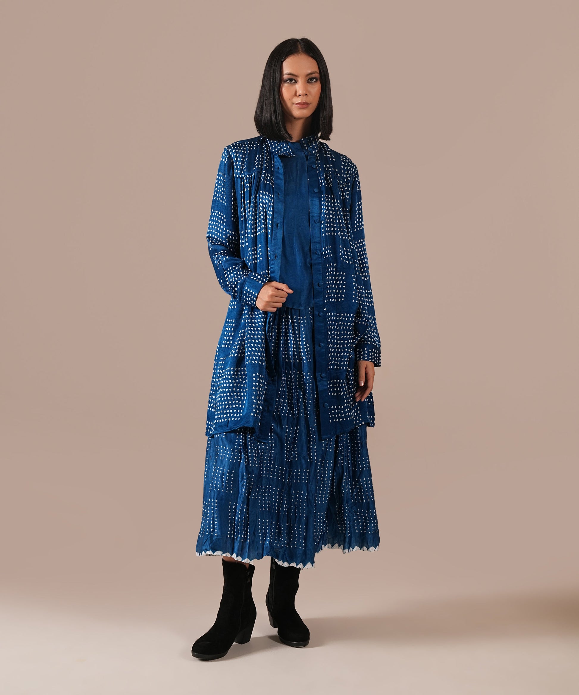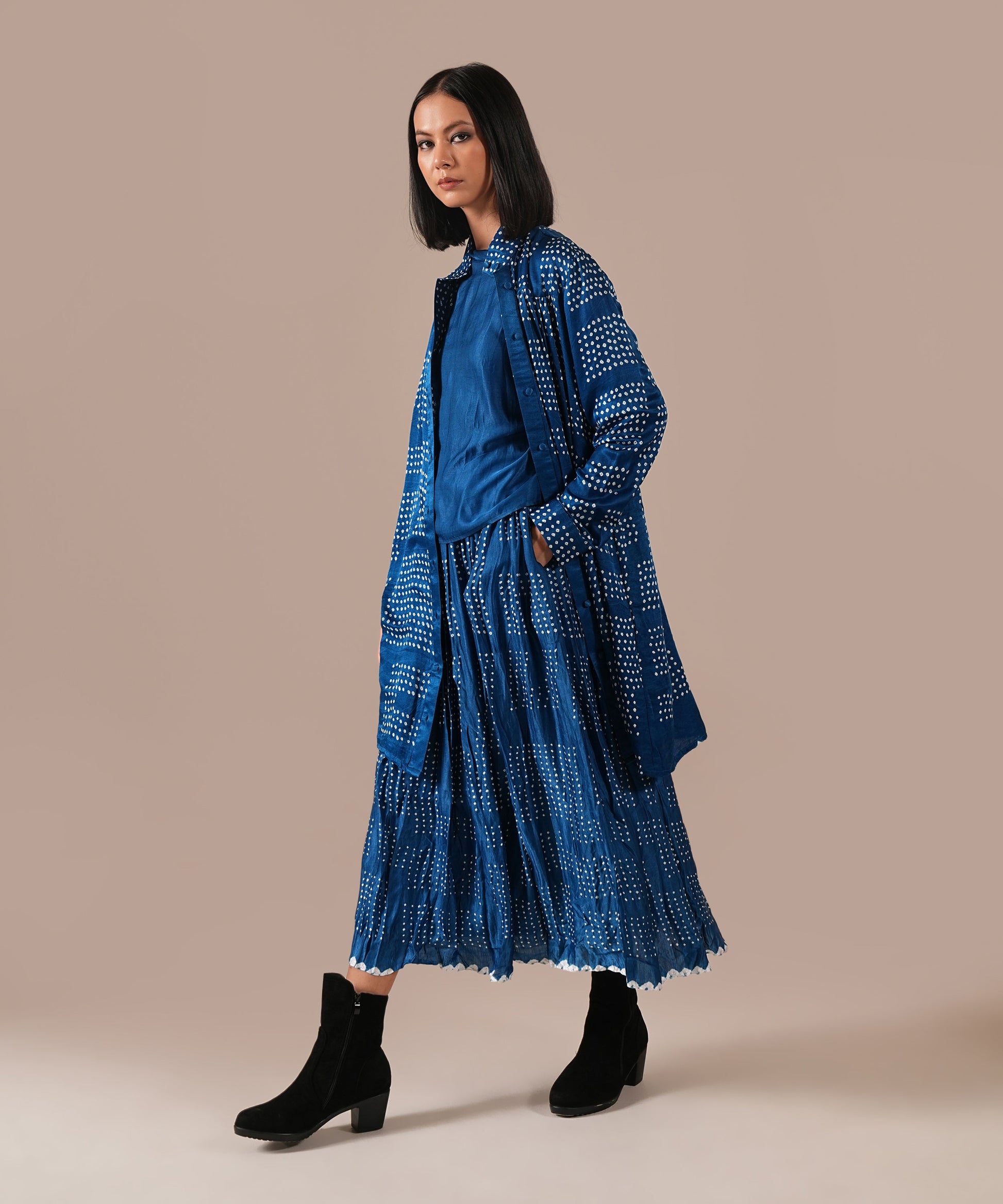 This ensemble is a masterful blend of heritage and contemporary elegance: a gathered silk bandhani skirt with side pockets, a sleek silk boxy top, and a silk Bandhani overlay that doubles as a chic shirt, cinched with a versatile Bandhani tie belt. Each piece showcases artisanal craftsmanship, luxurious textures, and effortless sophistication. It is a celebration of India’s rich handloom legacy, now reinterpreted for the modern wardrobe.