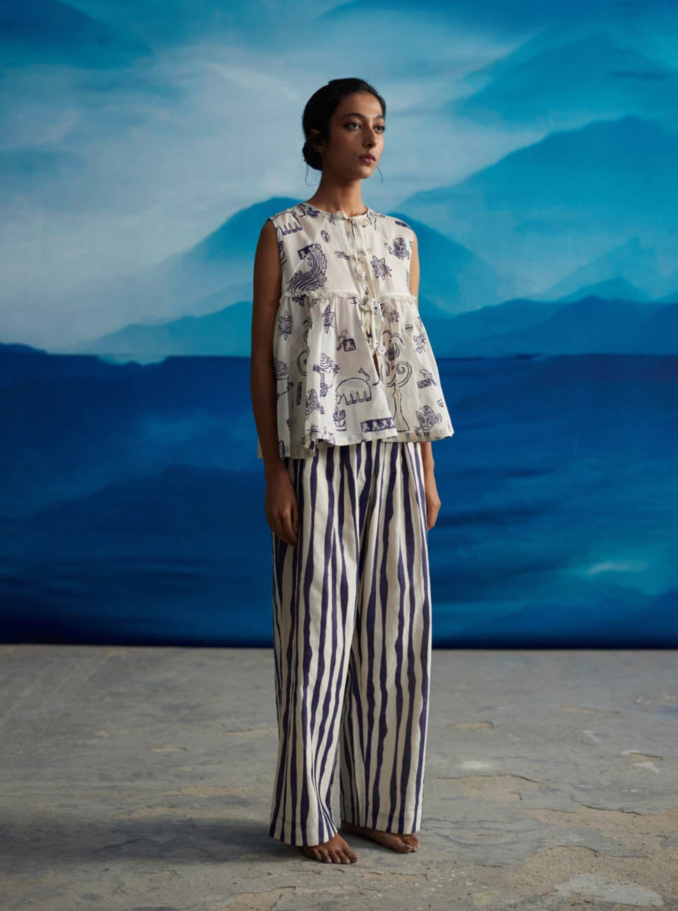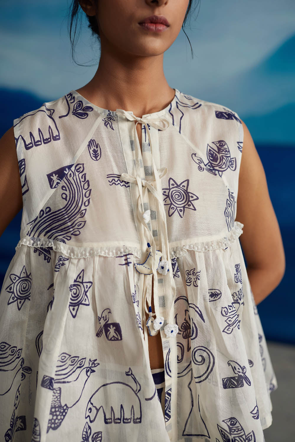 The tie-up top features front tie-ups adorned with handmade tassels. With a delightful flare, it's tailor-made for all your all occasions. The lace detailing at the yoke, both at the sides and front and back, serves as the perfect complement to the printed motifs, adding an extra touch of charm. This top embodies a comfortable, carefree, and easy-wear aesthetic that evokes a sense of mystical days and balmy nights.
