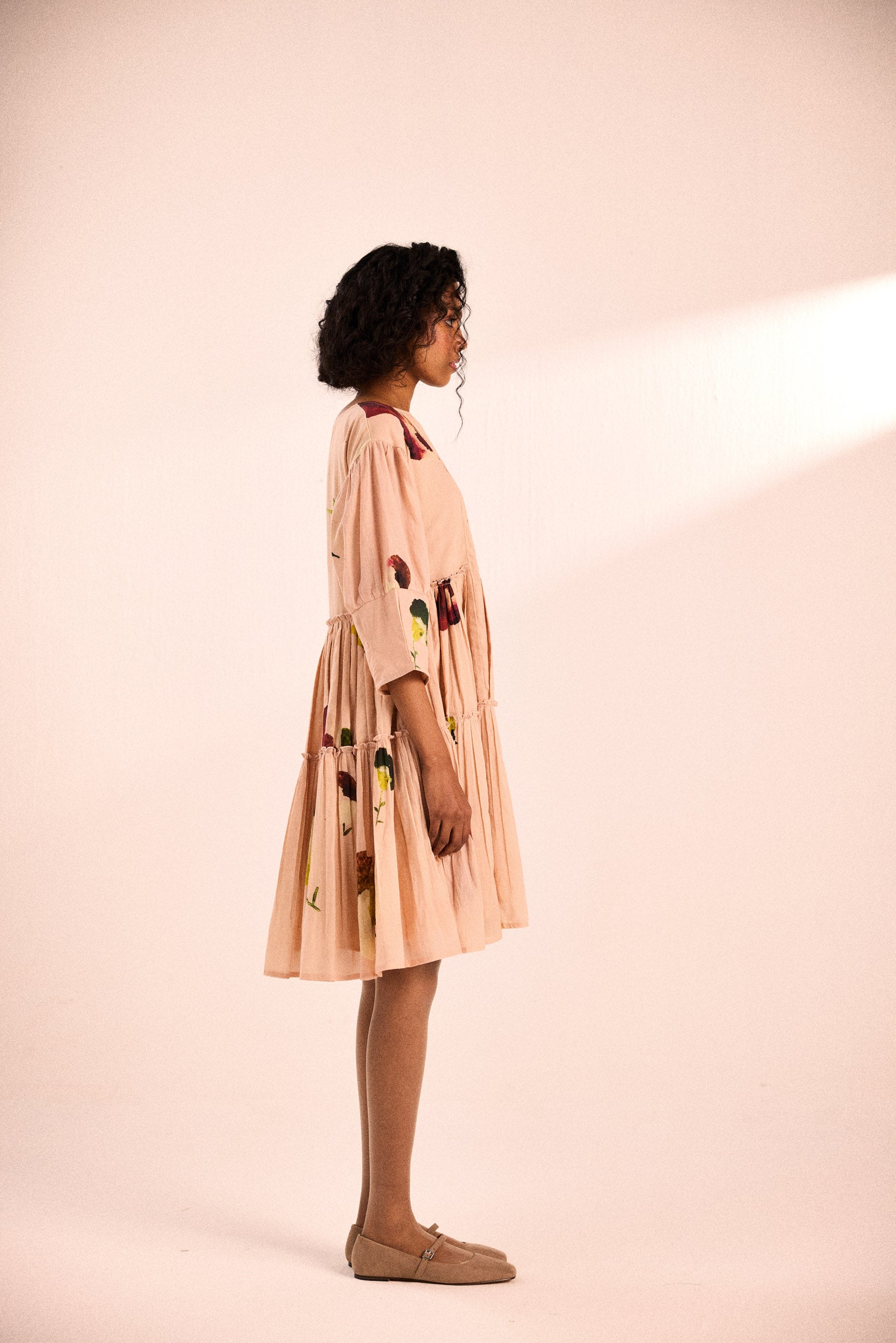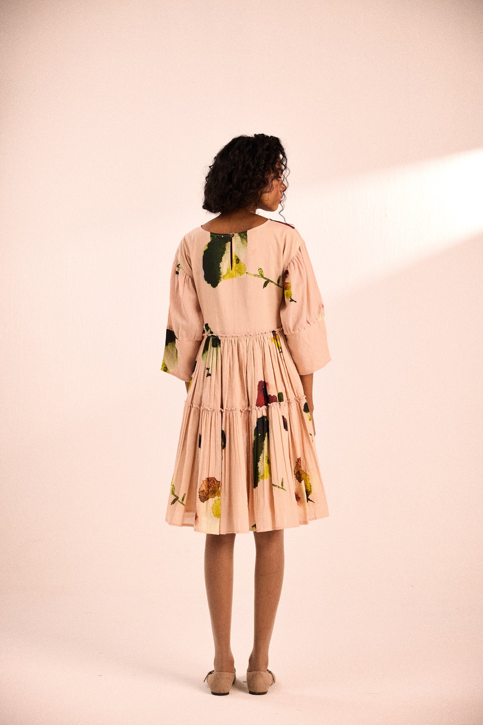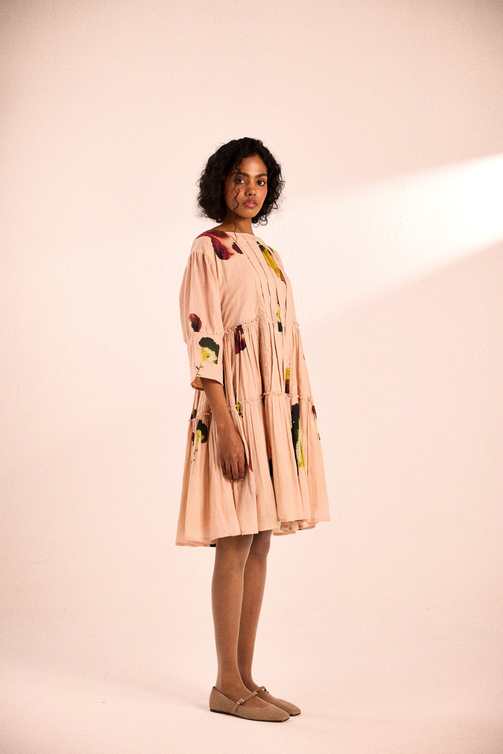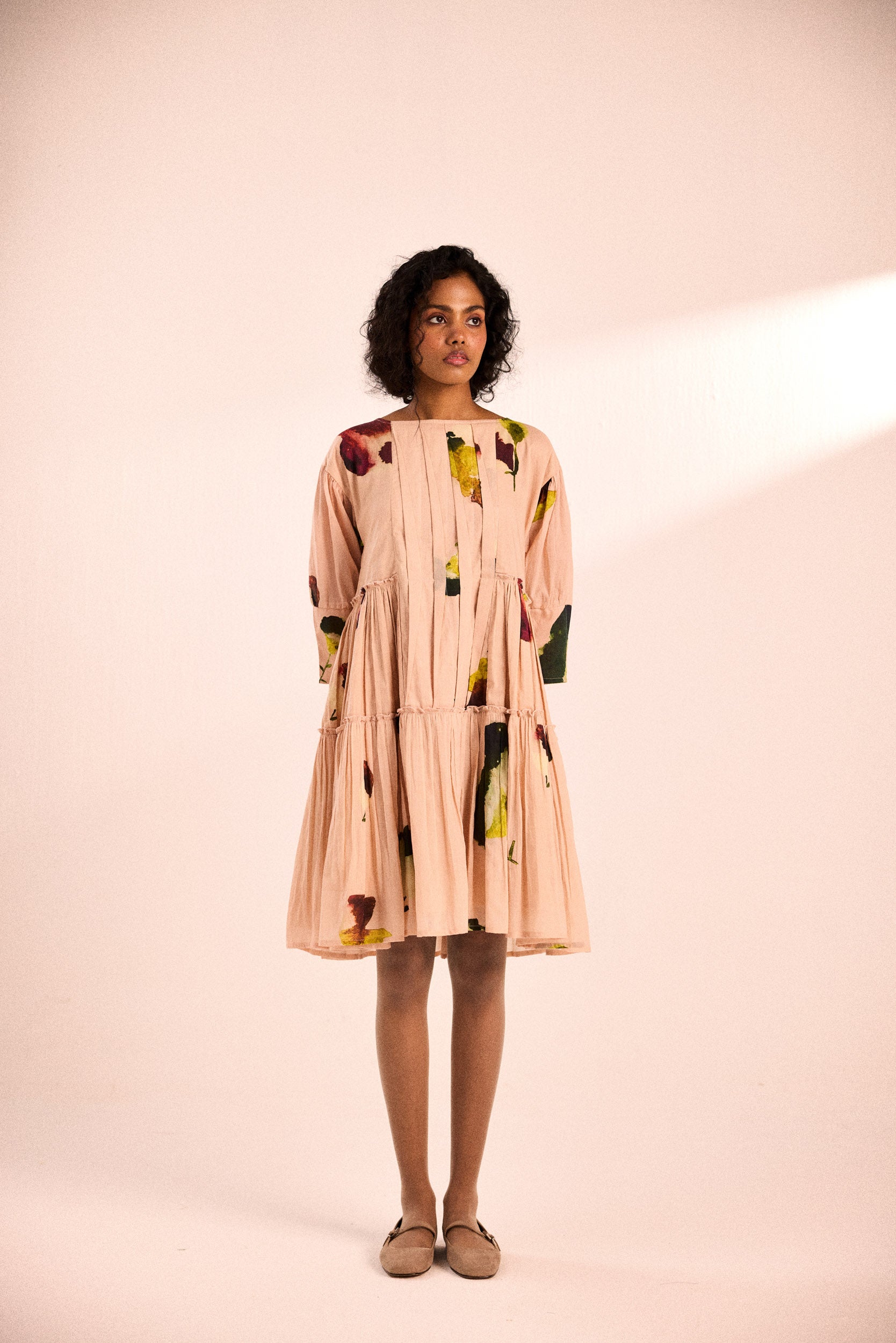 A relaxed, tiered dress with pintuck detailing on the bodice, three-quarter sleeves, and a fluid silhouette. Crafted in cotton mul, the abstract floral print adds a touch of artistry to its soft blush hue.