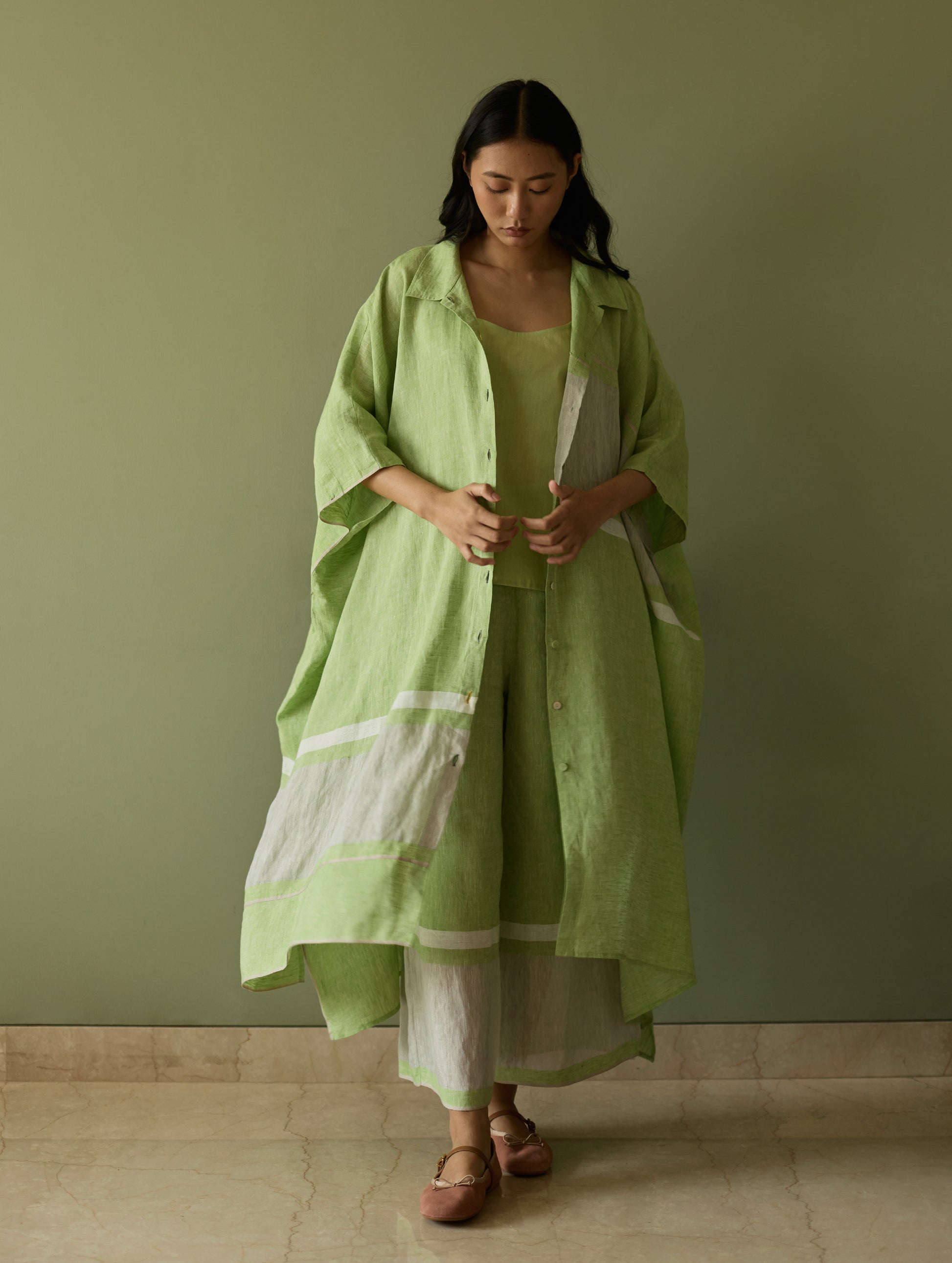 Kaftan Top - This effortlessly chic colour-blocked kaftan is crafted from our signature soft handwoven metallic border linen, highlighted by a subtle grey selvedge. The relaxed and flowing silhouette features a button-down placket and thoughtful placement of border detailing on the front and back. At the back yoke, soft double pleats add movement and dimension. Finished with mix of linen-covered and luminous mother-of-pearl buttons, this piece is is easy, versatile and statement - all at the same time. Pant - Timeless linen culottes with pleats at the waistband, comfortable pockets and a soft elasticated back waistband in our signature soft handwoven metallic linen.