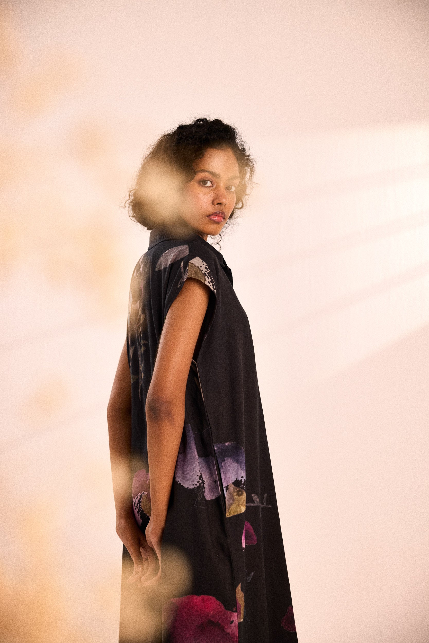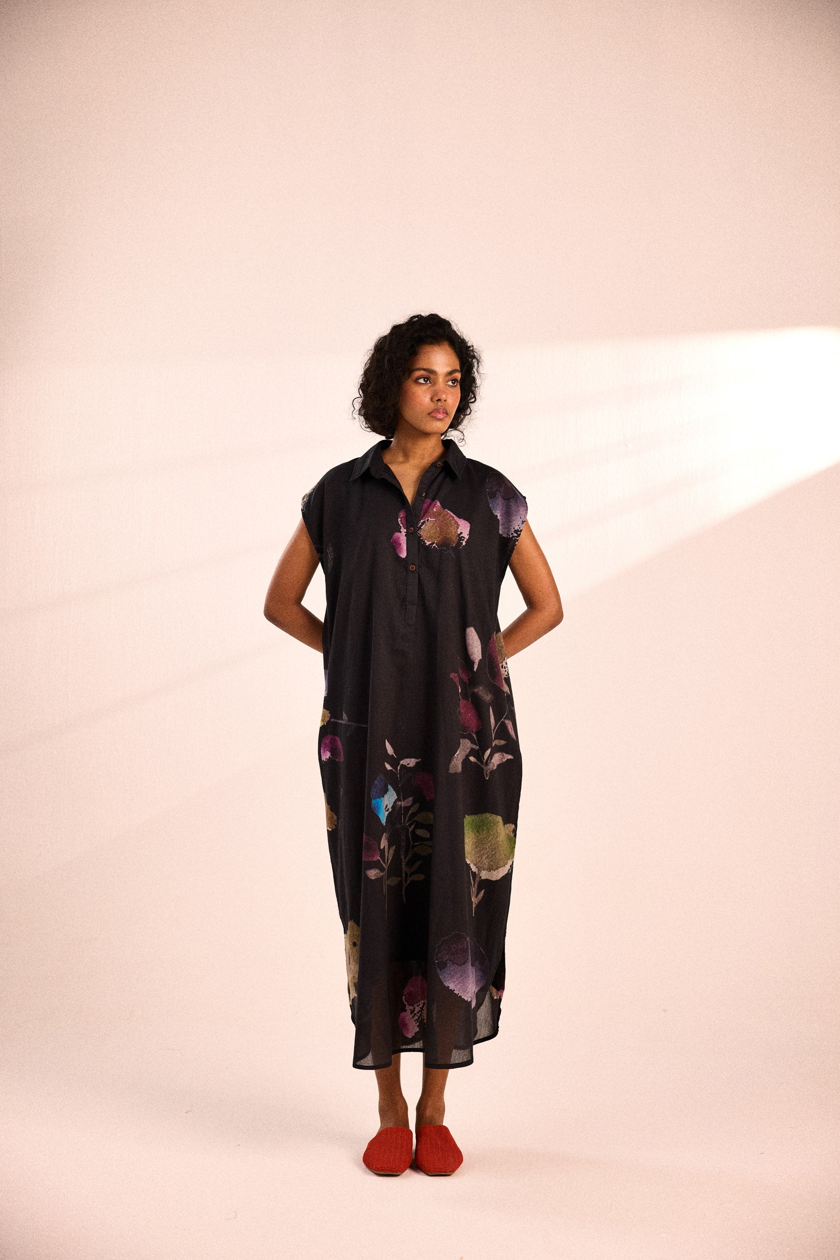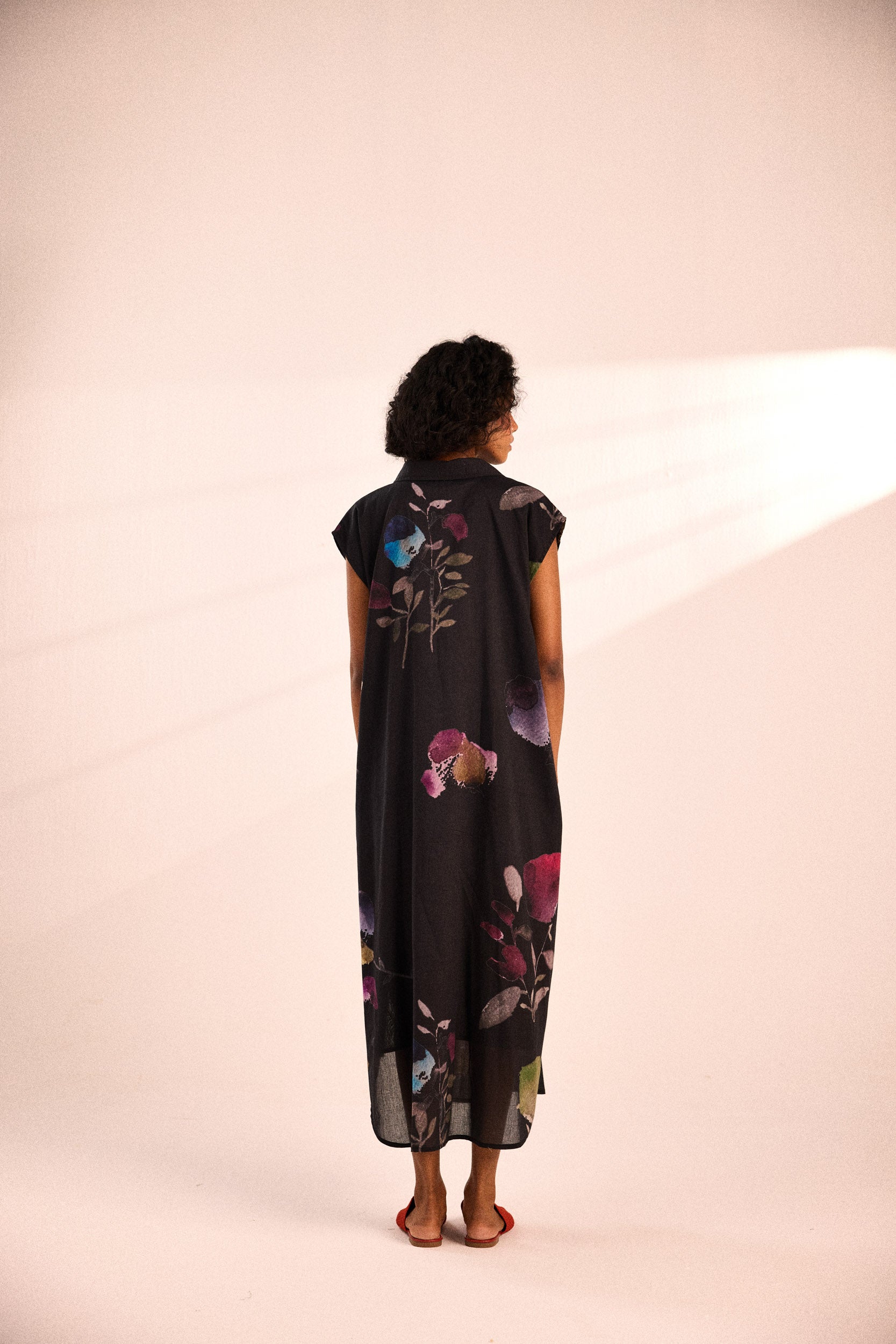 A relaxed cap-sleeved midi dress in mul cotton, adorned with painterly florals.                  The structured collar and buttoned placket add definition, while the flowing silhouette ensures ease.