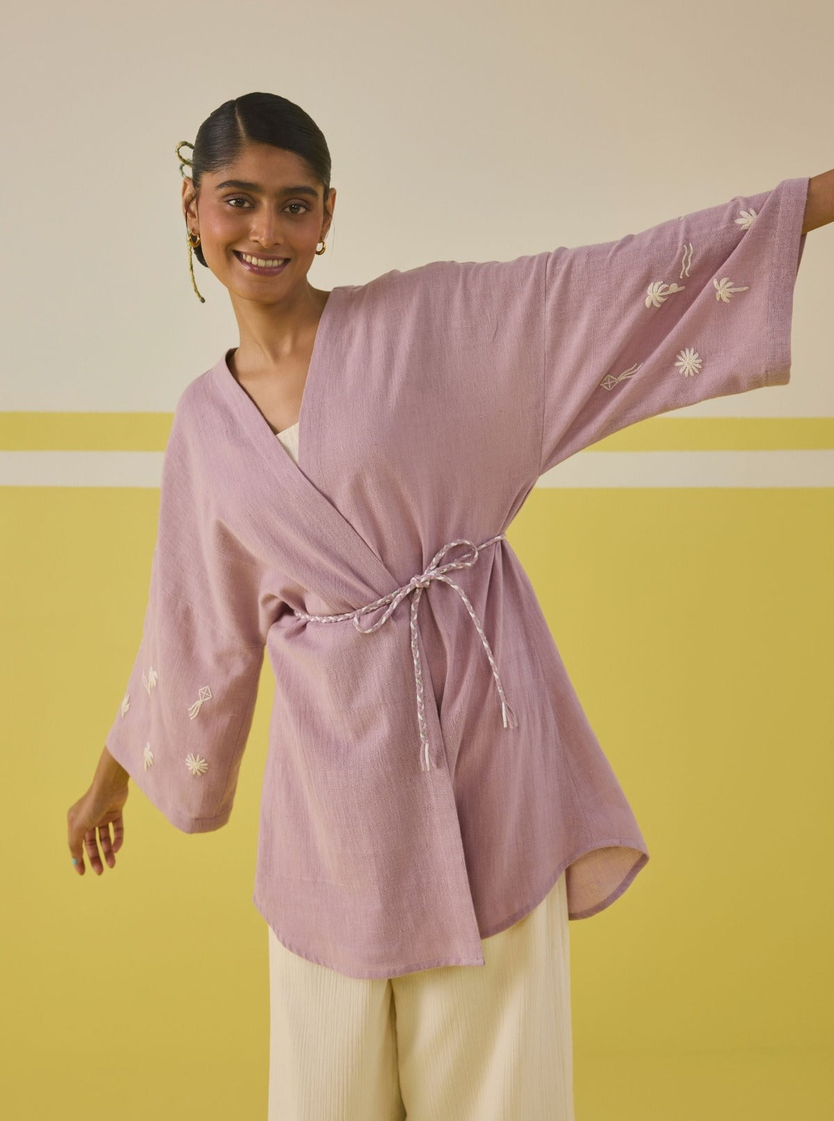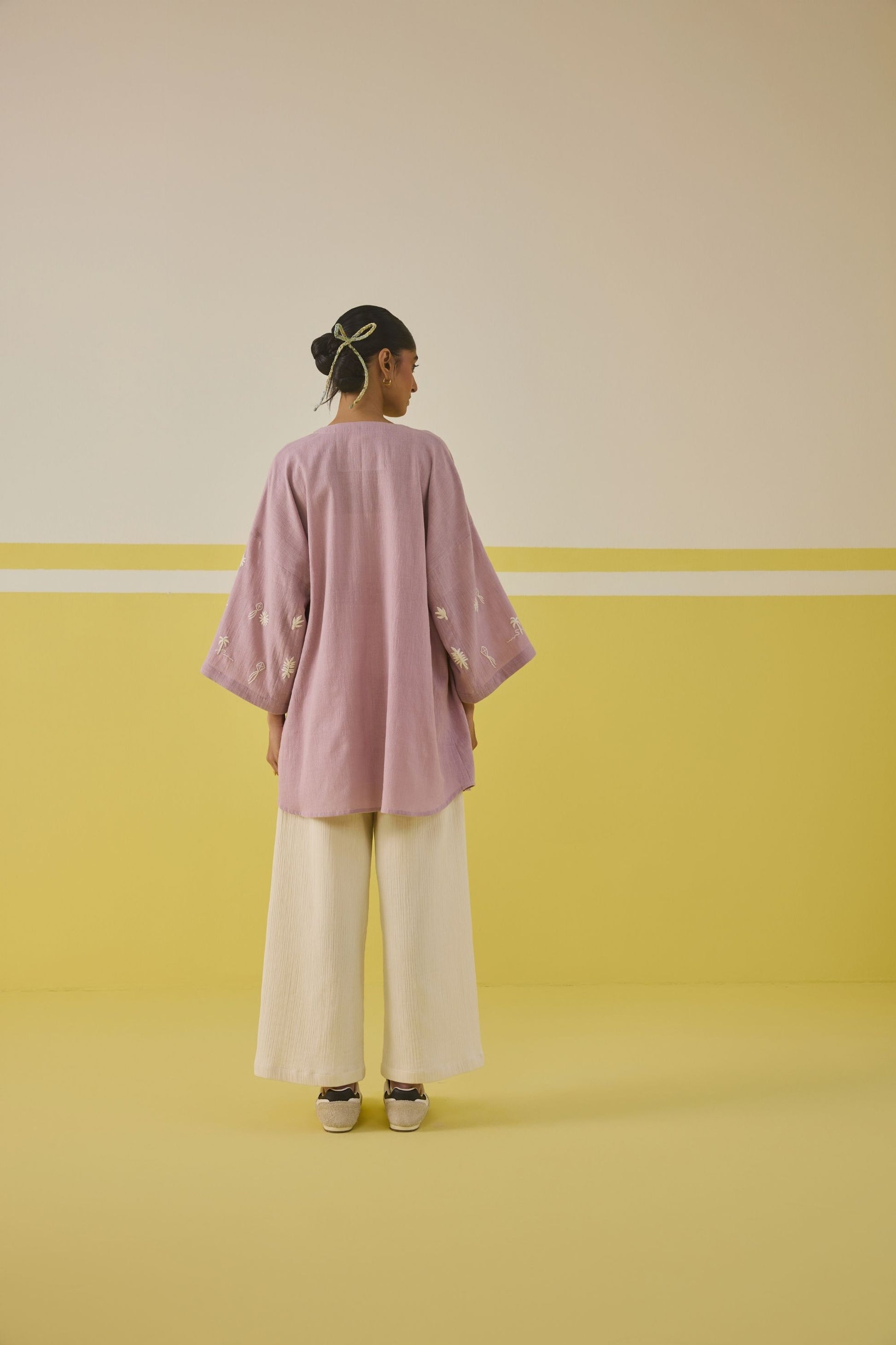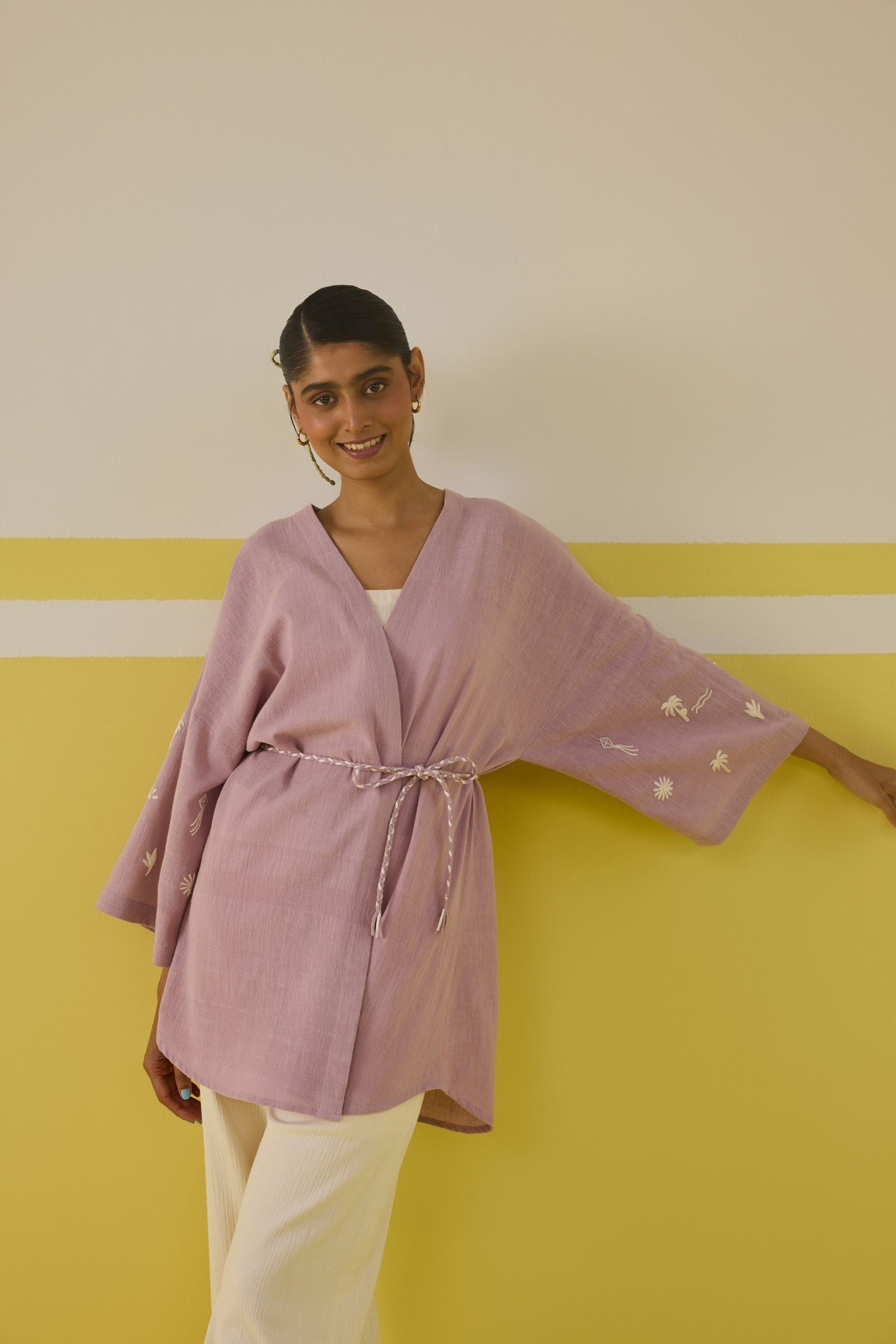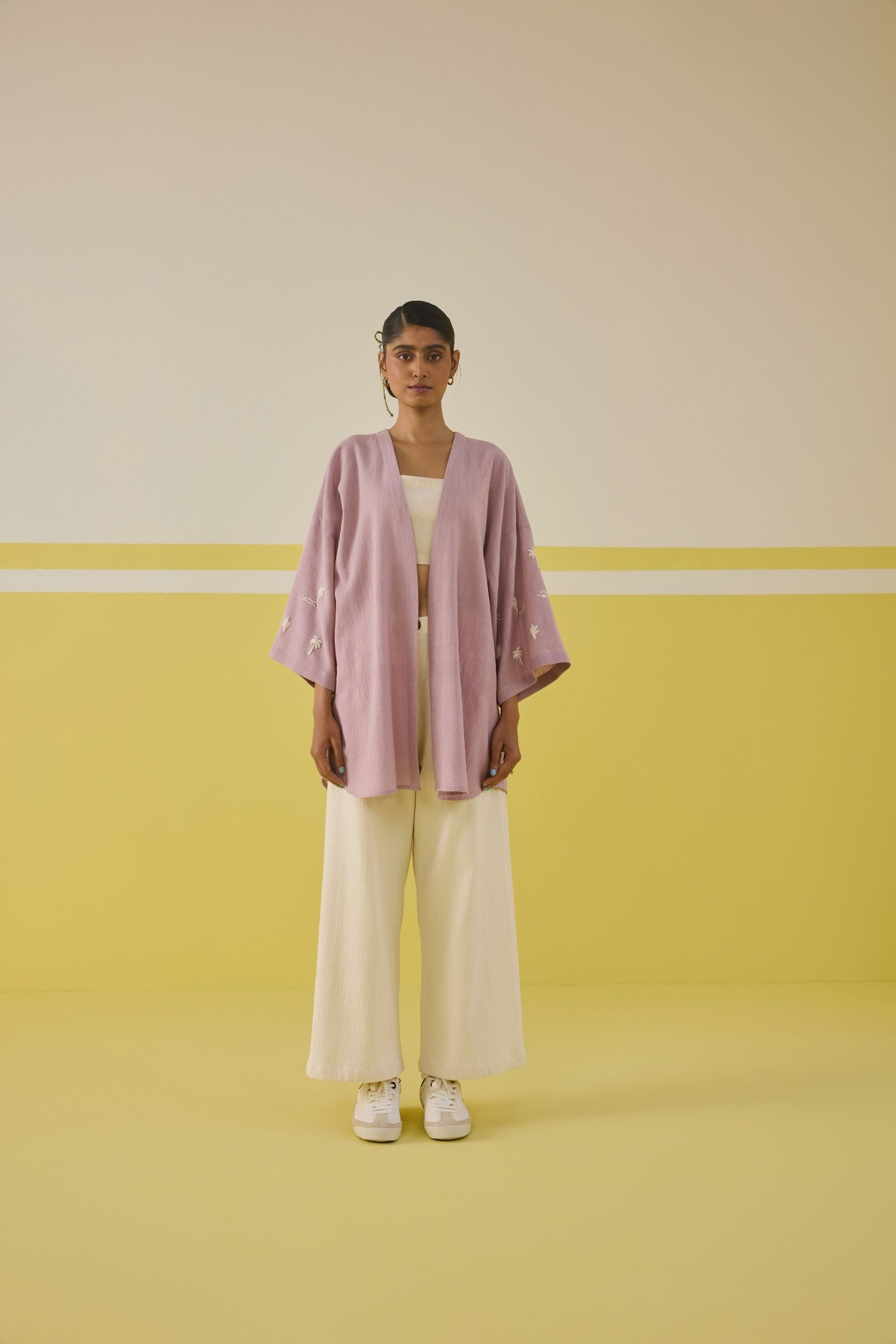 Relaxed fit, full sleeve gilet crafted in azo-free dyed, handspun and handwoven organic cotton fabric, machine embroidered with palm tree and summer-inspired motifs.