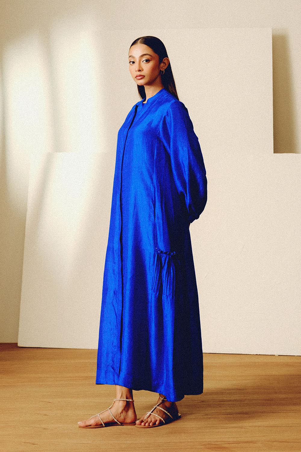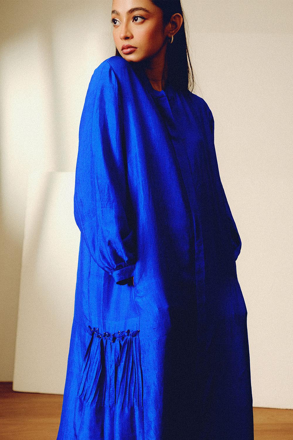 Handwoven mulberry silk long dress with ruffle details on the sides along with metallic bead edging.