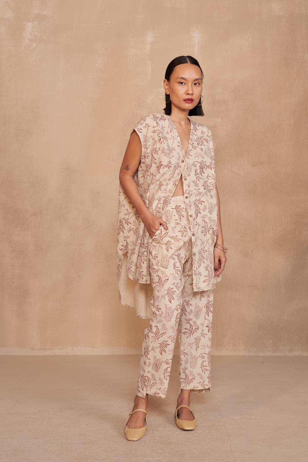 Fitted, straight-leg trousers crafted in handspun and handwoven organic cotton fabric, hand block printed with our signature New Beginnings motif using azo-free dyes. A classic pair of trousers are a perfect everyday go-to piece you can pair with shirts, crop tops, kurtas and more.