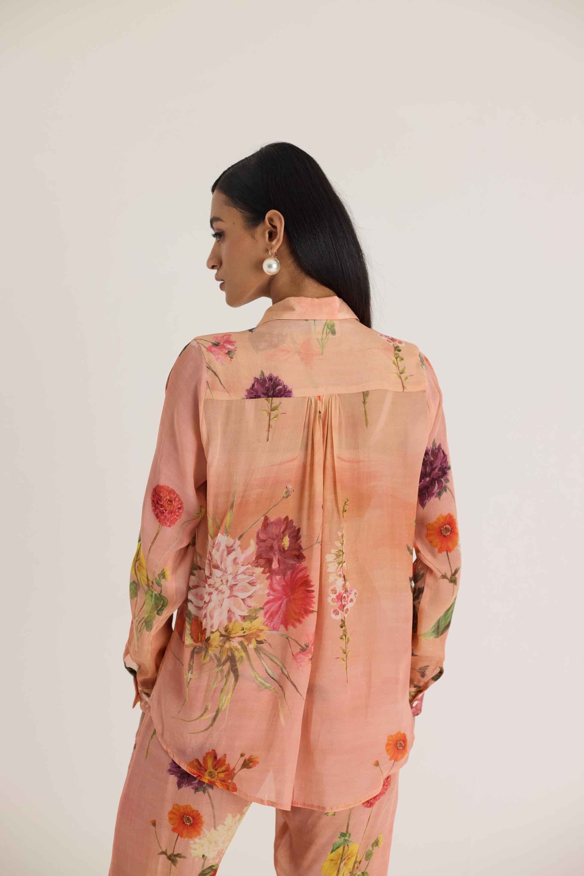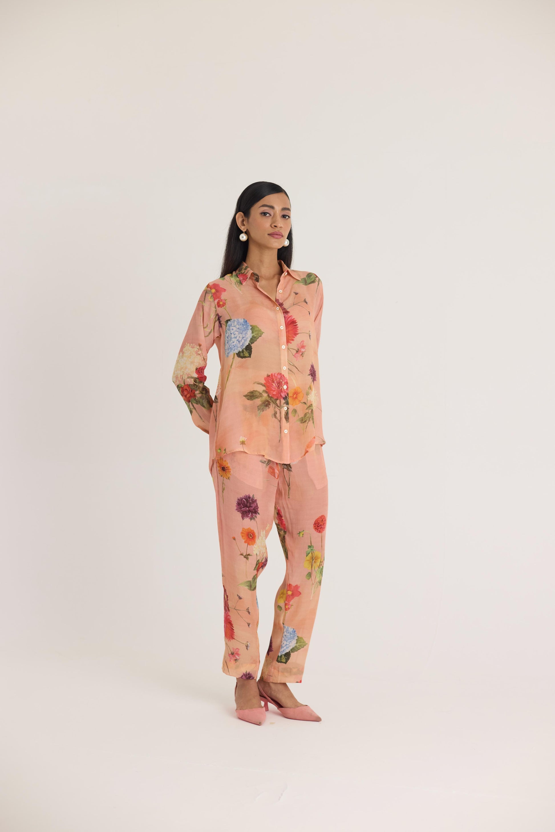Elevate your wardrobe with this effortlessly chic floral-printed ensemble, exuding timeless elegance. The warm peach-toned base is adorned with an exquisite botanical print featuring an array of delicate blossoms in vibrant hues. This soft yet striking design captures the essence of a serene garden, making it perfect for both daytime sophistication and evening charm.