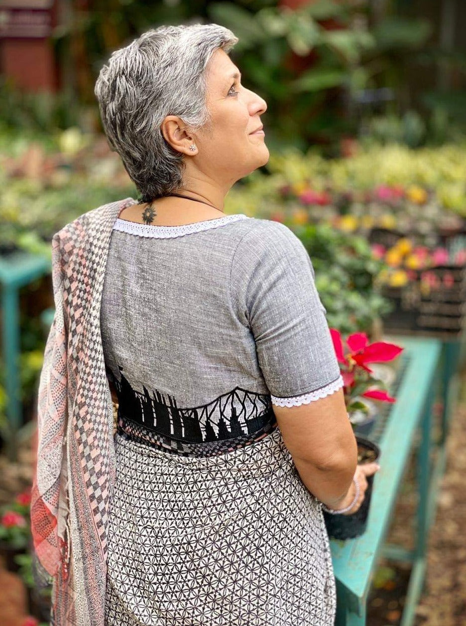 Our quintessential Calcutta skyline silhoutte is embroidered on the back of a blouse.