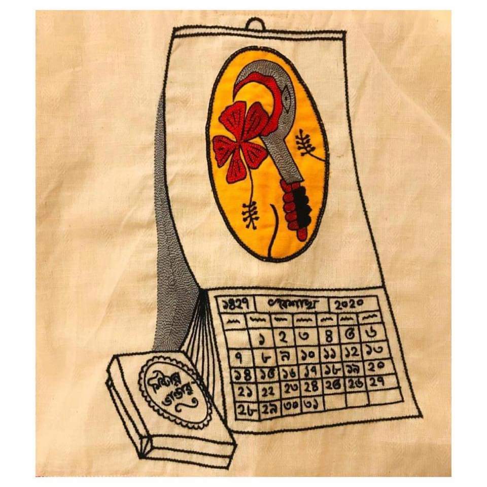 On handwoven Jamdani, Bengali Calendar of the present year is hand embroidered.