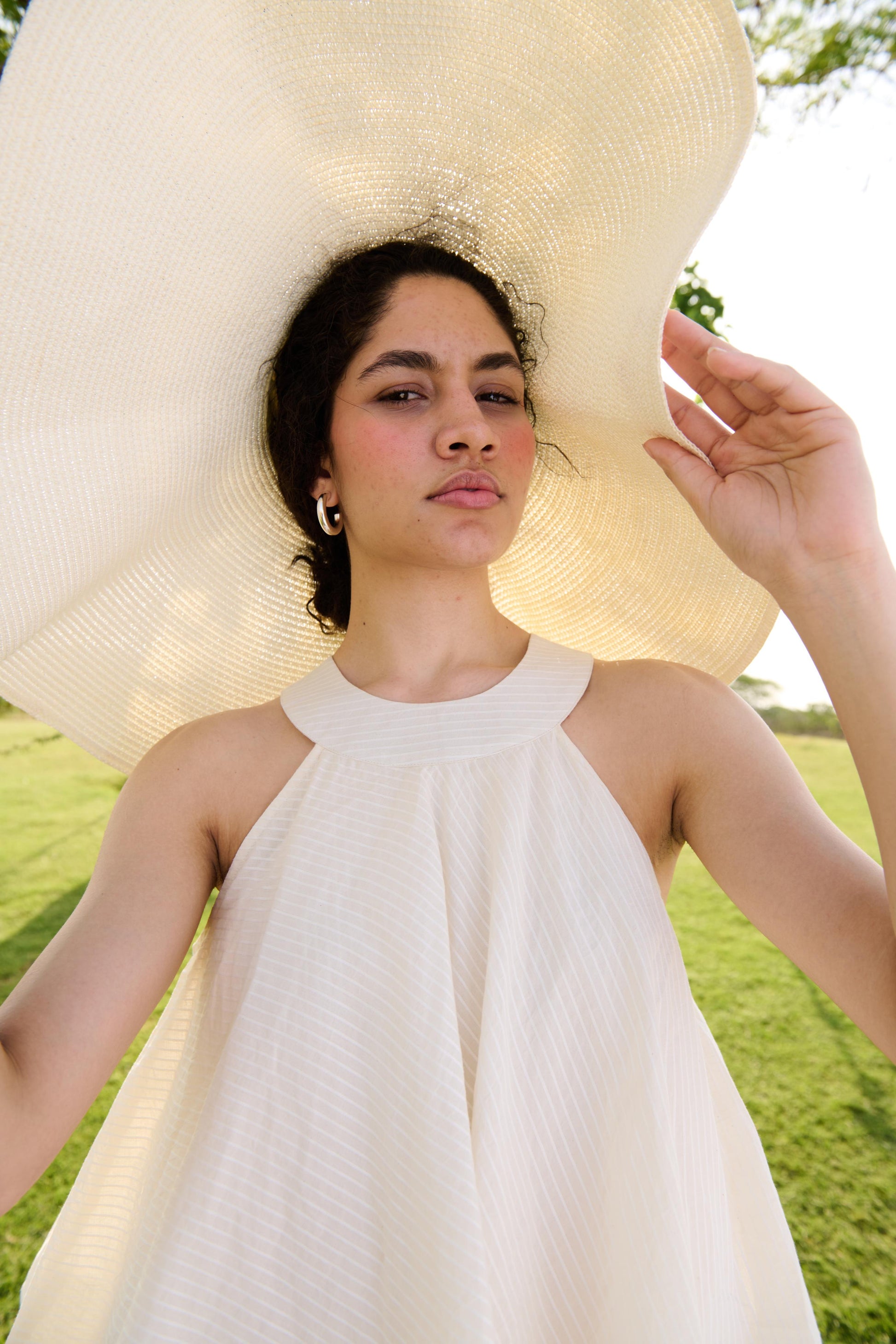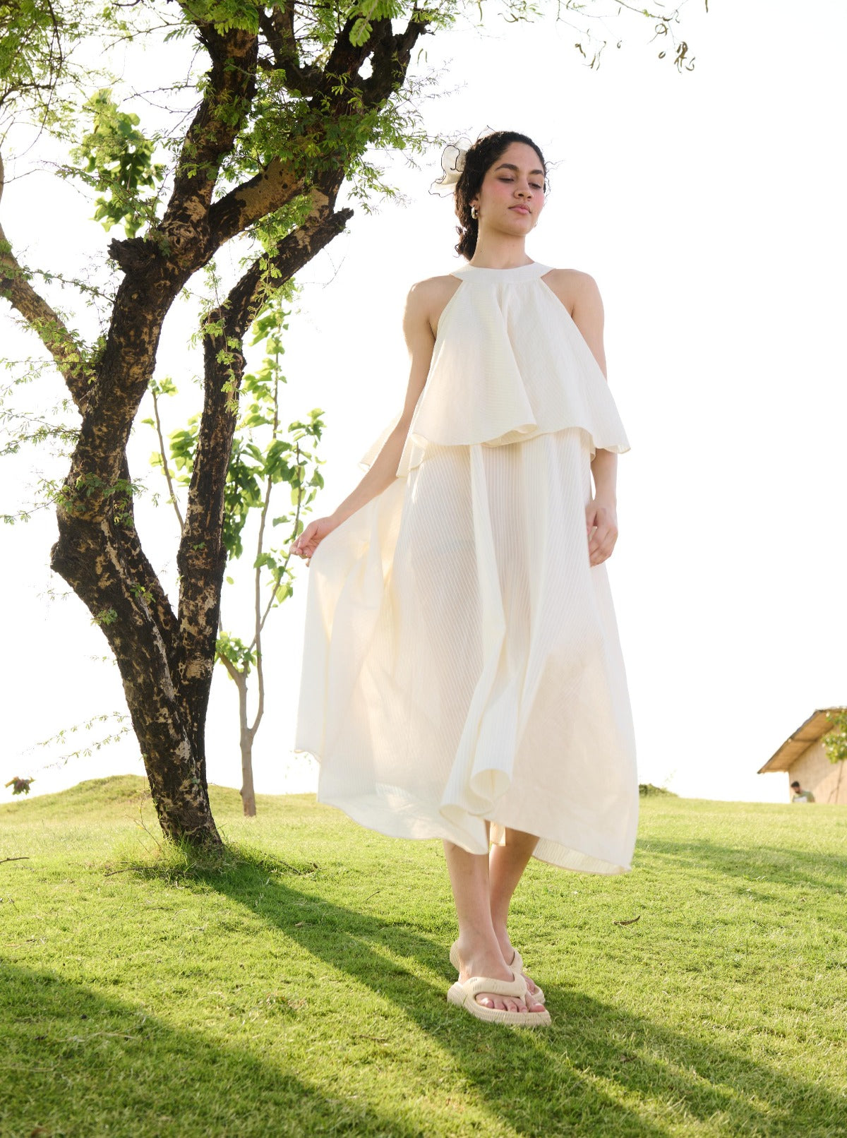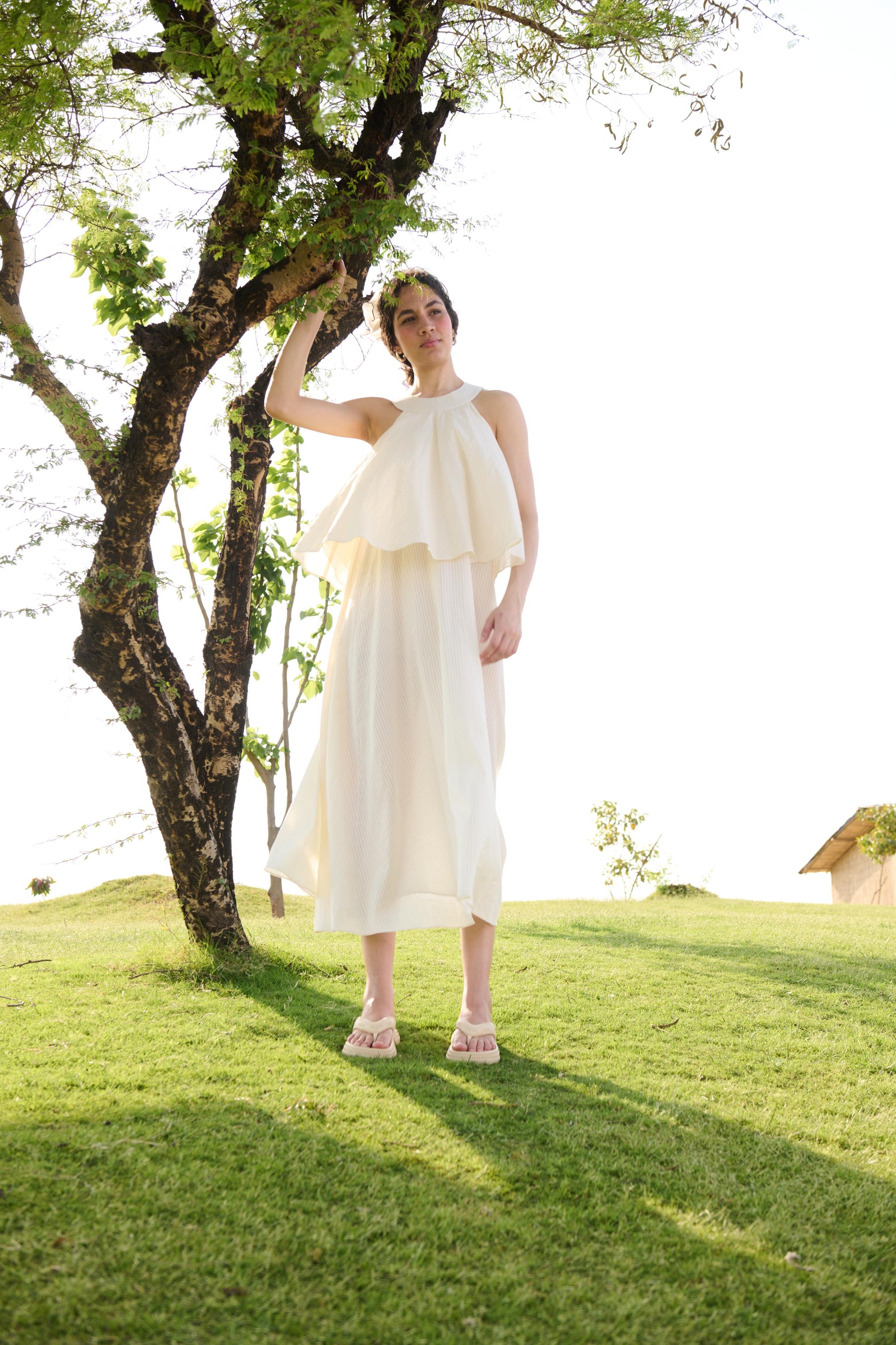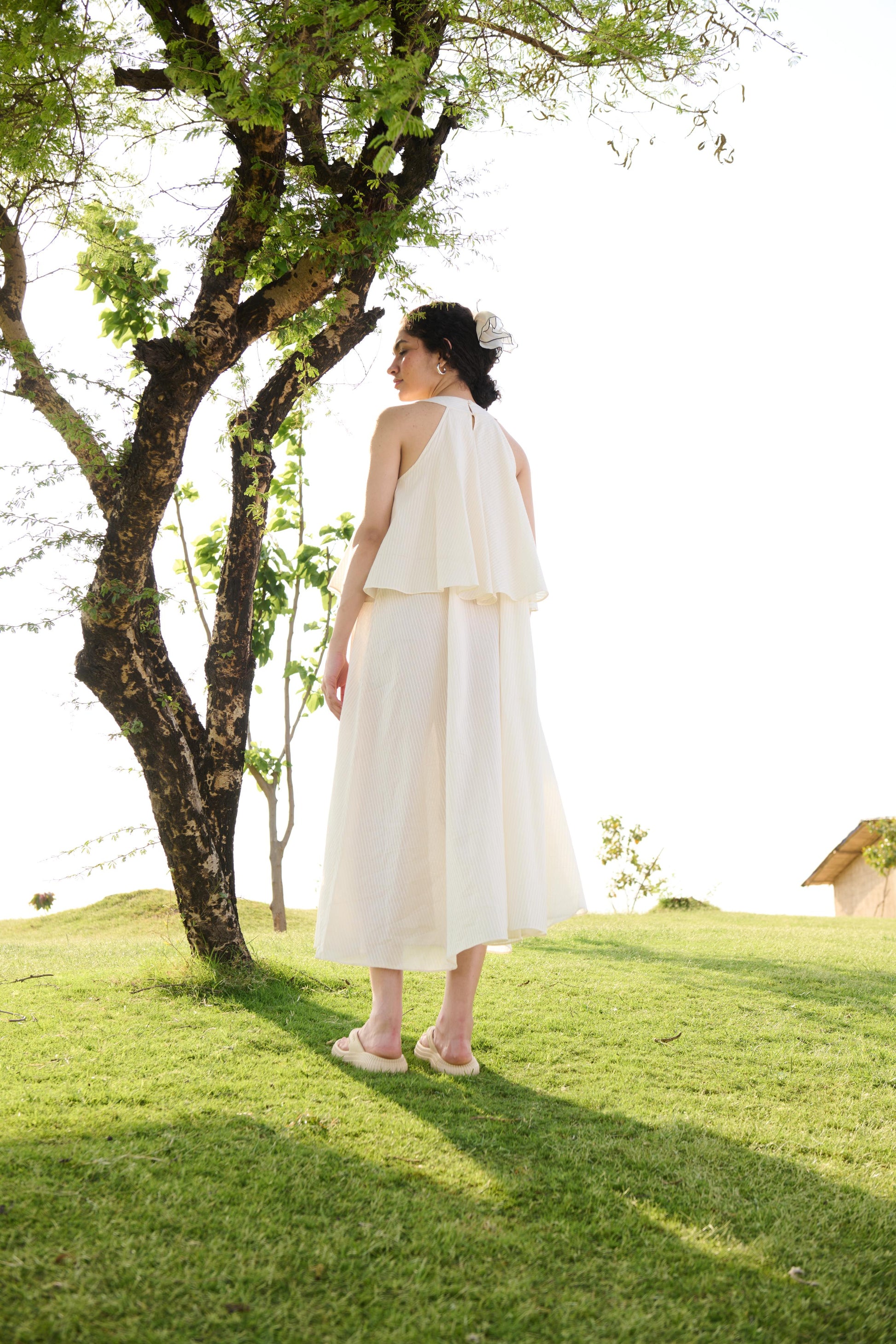 The camellia dress is crafted with our self stripe cotton fabric in off white with layered panel to give an extra drape to the dress.