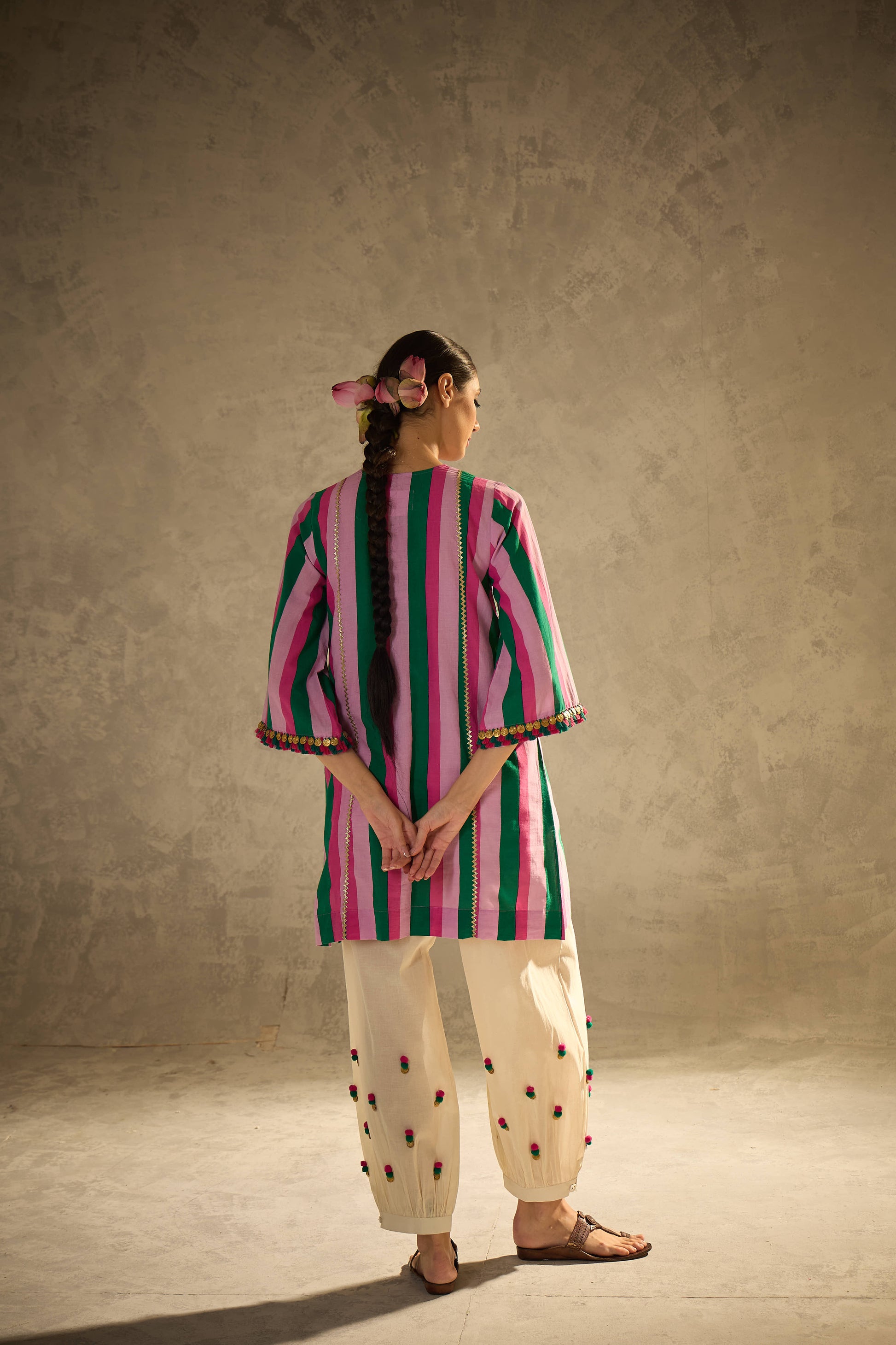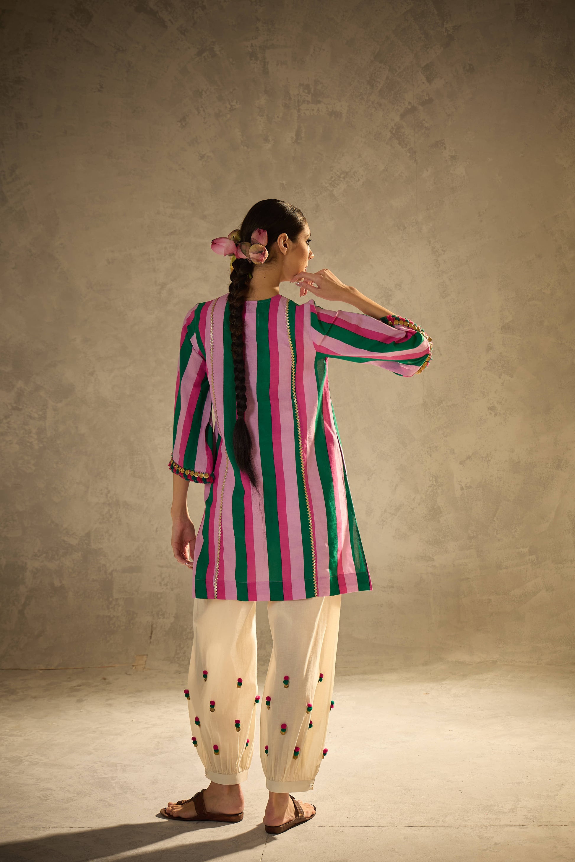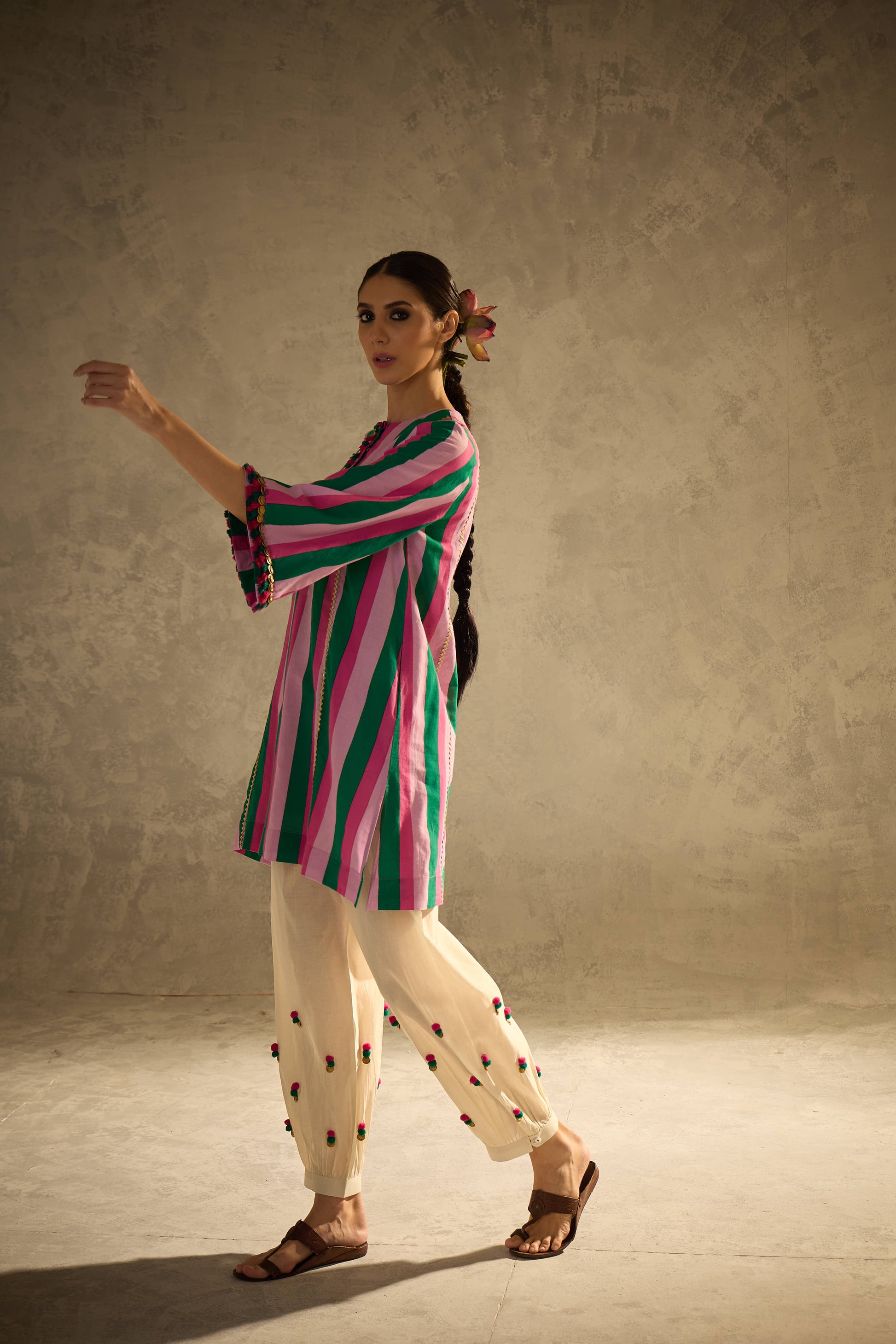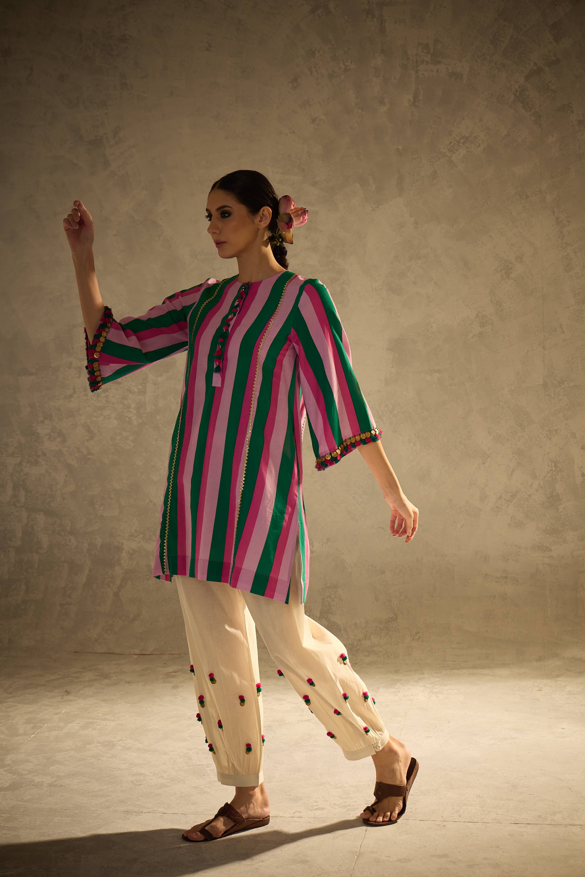 Crafted from breathable cotton-cambric, this kurta set features bold, playful stripes. The kurta is detailed with tassels on the sleeves, while the pants are accented with vibrant pom-pom trims.